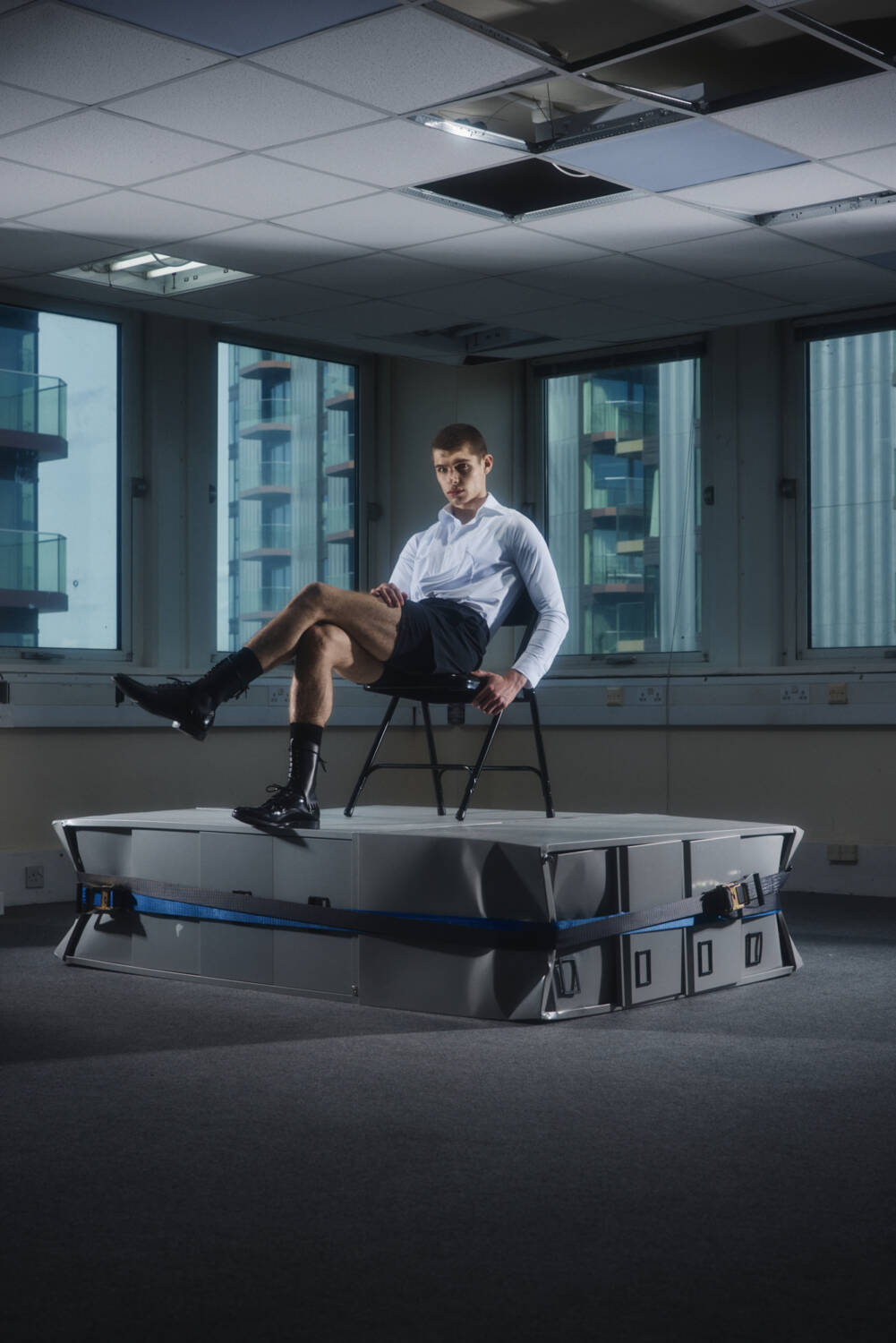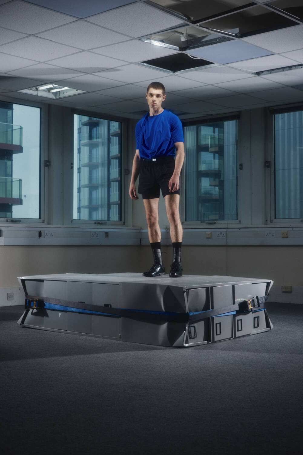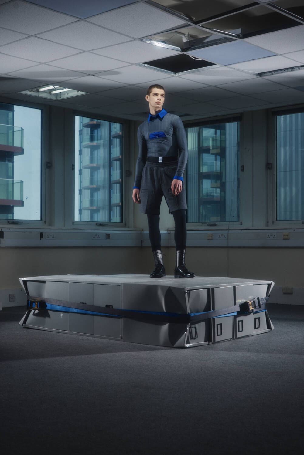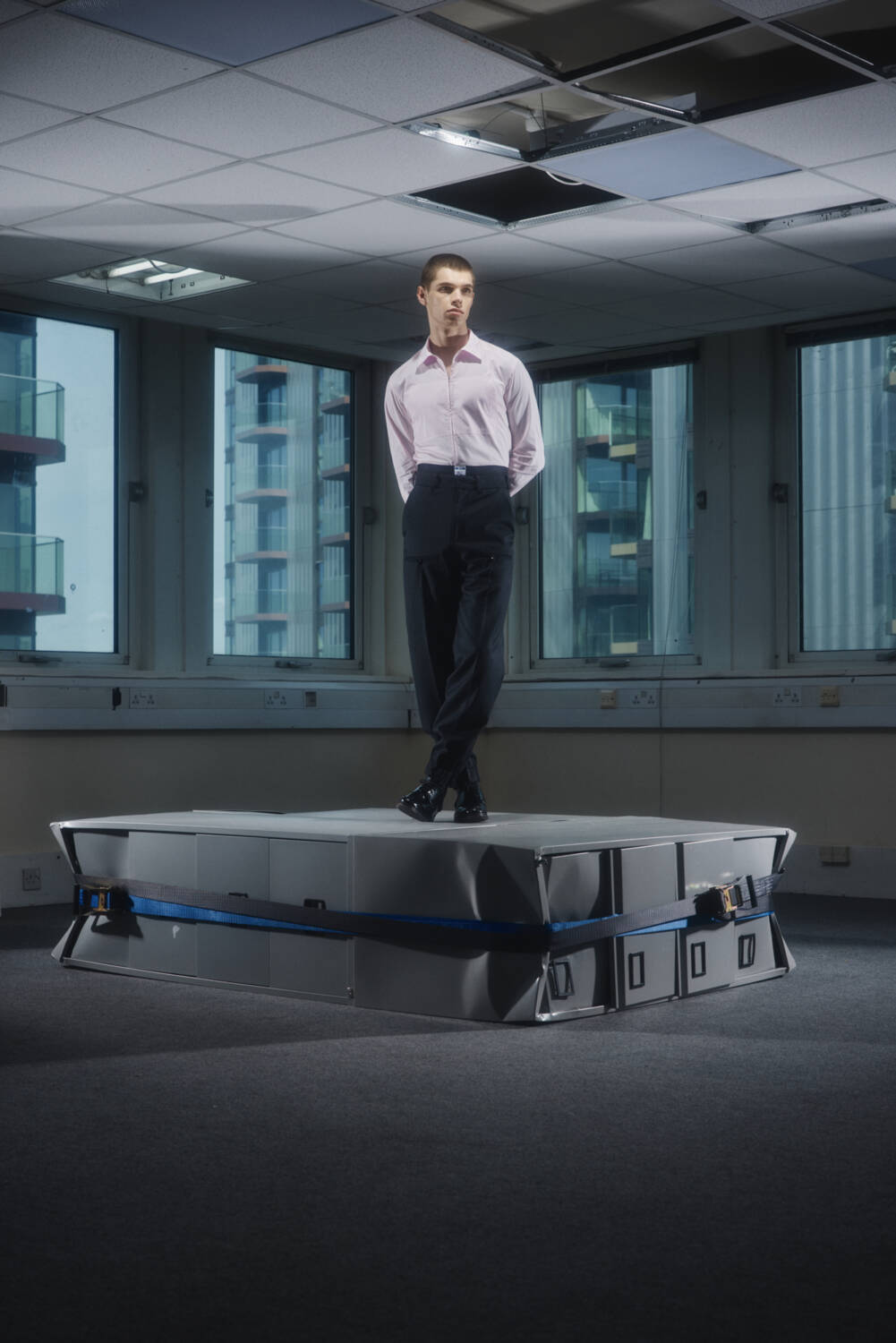 The lookbook, shot by 10 Magazine contributor Josh Hight, was the perfect visualiser for this. The unconventional SS25 silhouettes were backdropped by a starkly carpeted office space, seemingly abandoned, that narrated a tale of rigid conformity fighting against a playful sense of liberation. Across the board, the offering suggested a new uniform for the nine to fivers who long for absurdity in their everyday life, from the boardroom to the nightclub.