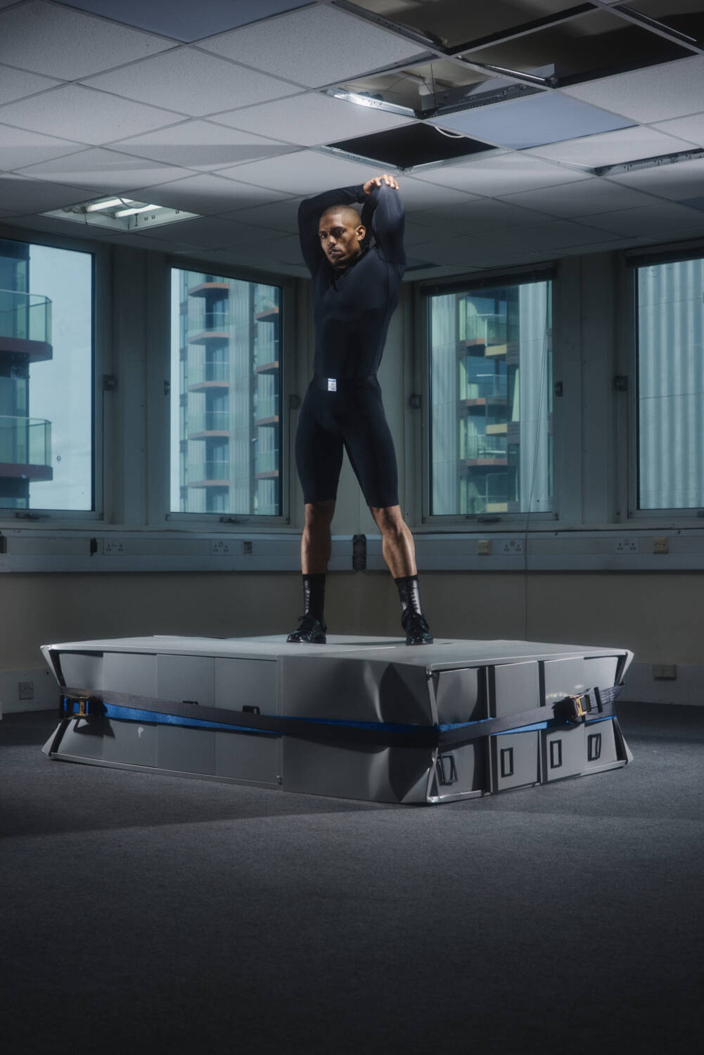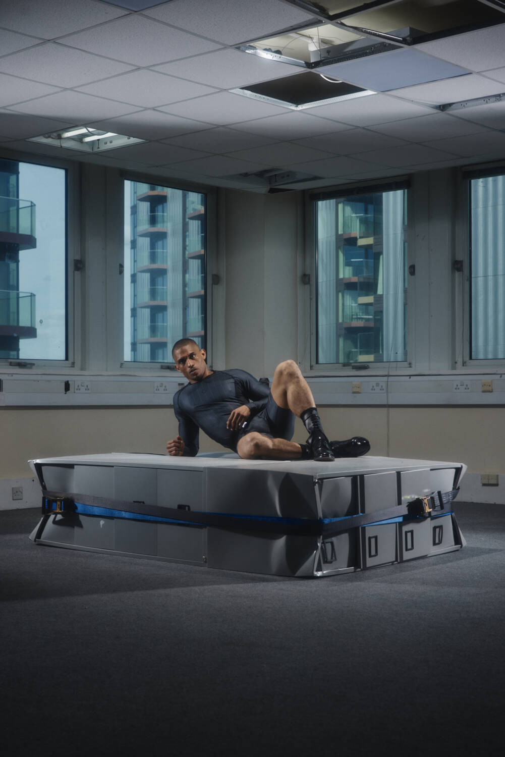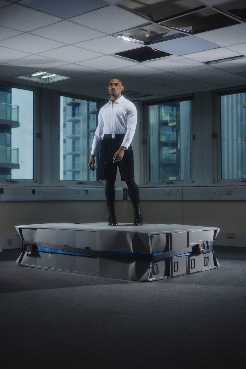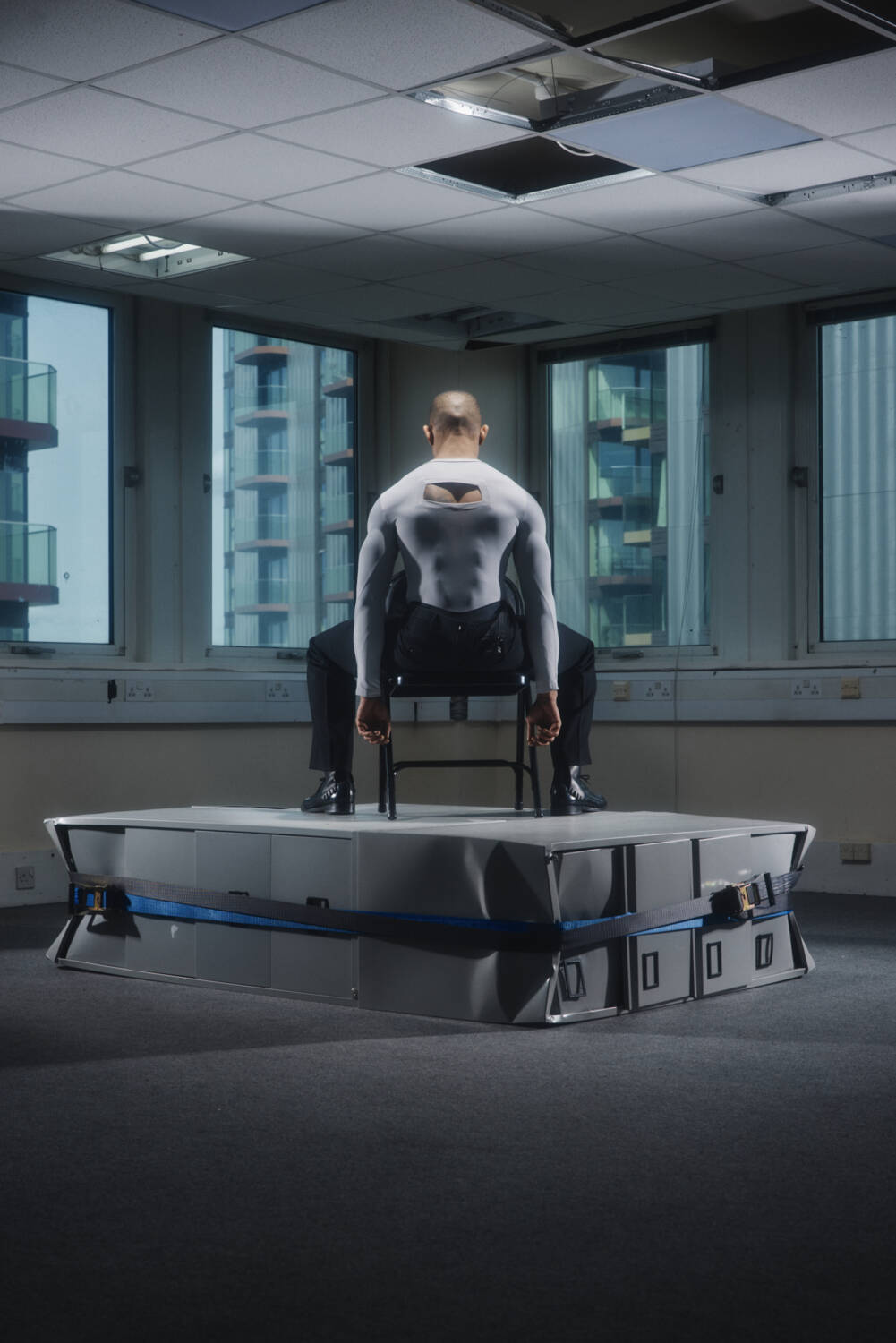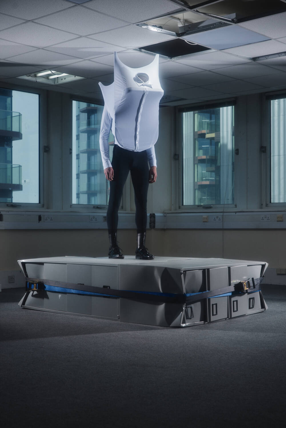 A standout look was the chair top; a bizarrely-shaped warped T-shirt made by pattern cutting around a classic fold-up chair, which first made its debut during Wolfe’s final year CSM show in a vivid cobalt blue. Here, it was rendered in pure white, in tune with the colours typically deemed appropriate for the workplace. Elsewhere, the duality of pinstripes printed onto recycled, skin tight nylon told a story about the restrictions of the corporate workplace which often work to suppress childlike wonder and the playfulness of boyhood.