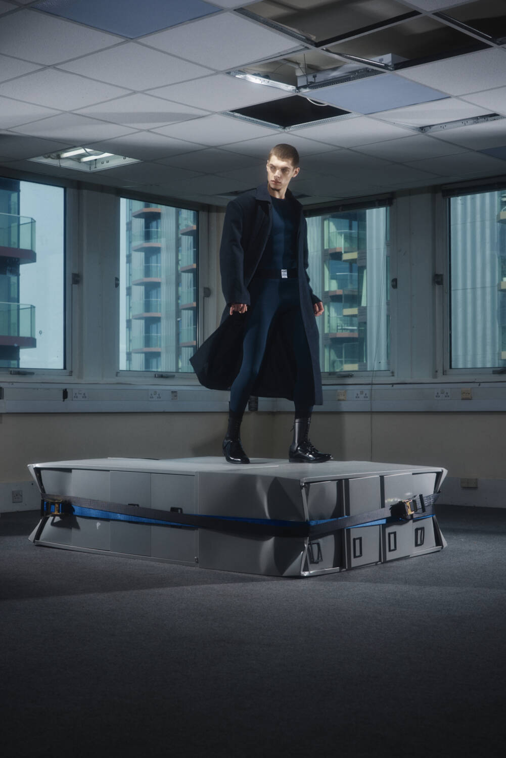 Wolfe also debuted his official logo with this collection – a square peg in a round hole – symbolising the “unusual individualist”. Similar to how the upcoming designer incorporates chairs into the looks, not ‘fitting’ within a pattern is a staple theme of his design opus.