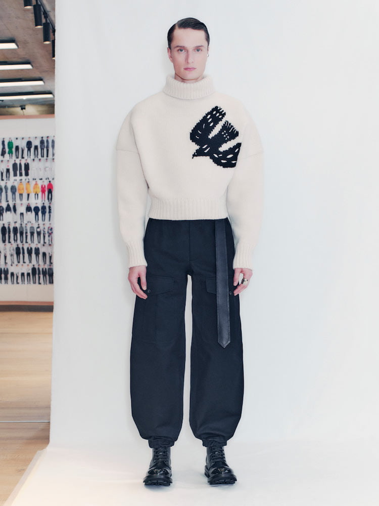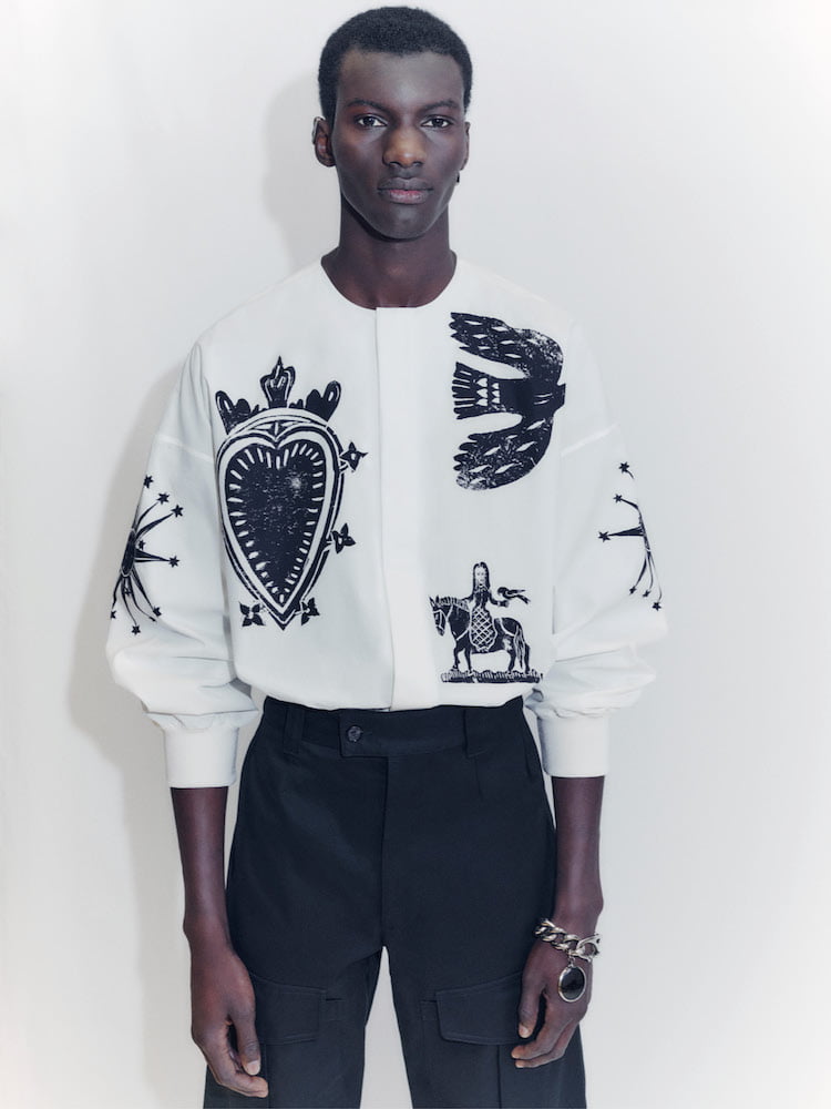 Since the beginning of the pandemic, Sarah Burton has streamlined her men’s and women’s Alexander McQueen collections with effortless ease. Her two teams have been working side-by-side, making tomboy-esque womenswear and men’s staples with feminine flourishes. This season sees Burton keep her focus pinned on silhouette. Double-breasted tuxedo jackets, made from sublime scuba wool, are sculpted at the waist and rounded at the shoulder; adorned with crystal-beaded doves, hearts and sun motifs. These talismans come dotted throughout the collection, whether it be on chunky cashmere knits belted into pleated peg trousers, or collarless poplin shirts, worn with worker boots with a slightly curled toe.