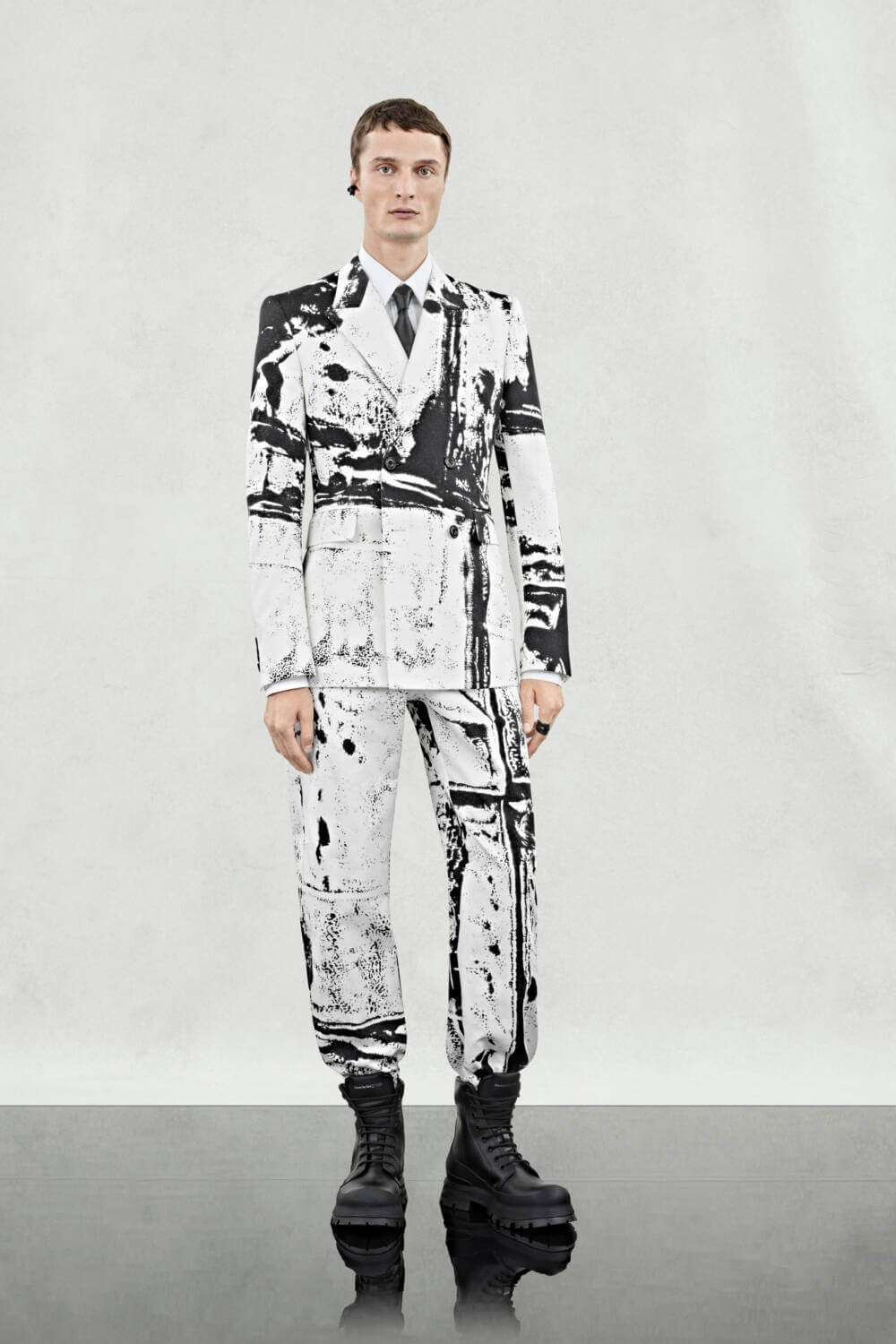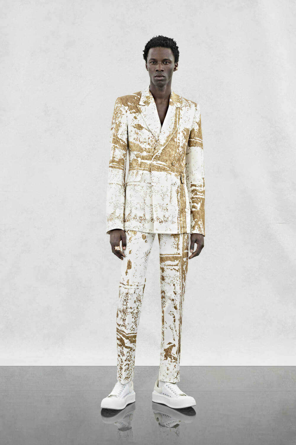 Flourishes of charm and eccentricity find themselves throughout. An abstract fold print, developed by designer and long-time collaborator Simon Ungless, is transferred in metallic gold onto a black or white jacquard, taking the form of tailored jackets, cigarette trousers and a floor length cape that concludes the collection.