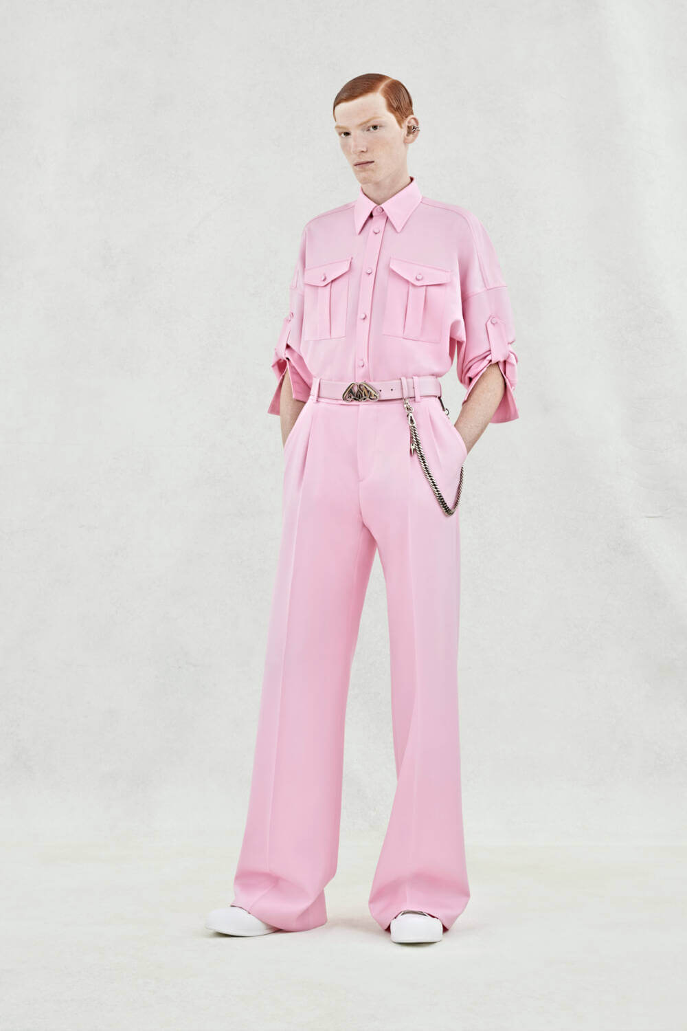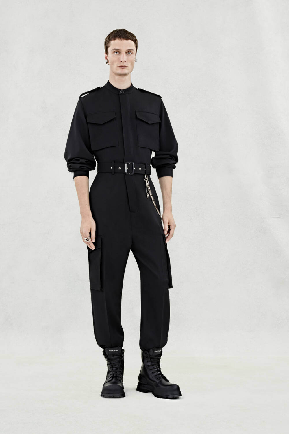 A spattering of leather gives this season’s look a tougher underscore, with looks being paired with thick-soled black boots or derby shoes. Appliquéd, ceremonial-like harnessing draws on archive McQueen collections and belts decorated with metal buckles and detachable chains add a covert edge.