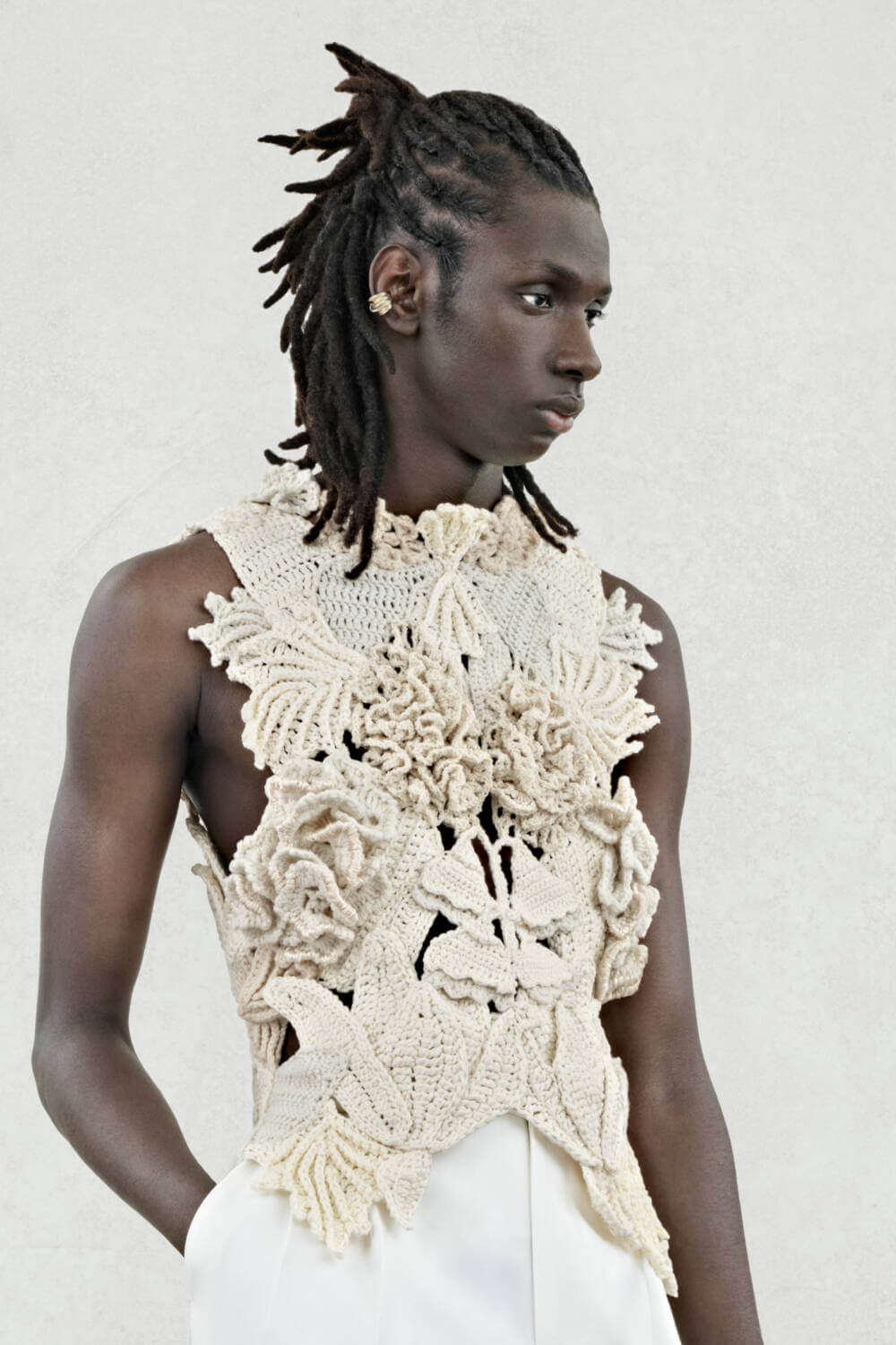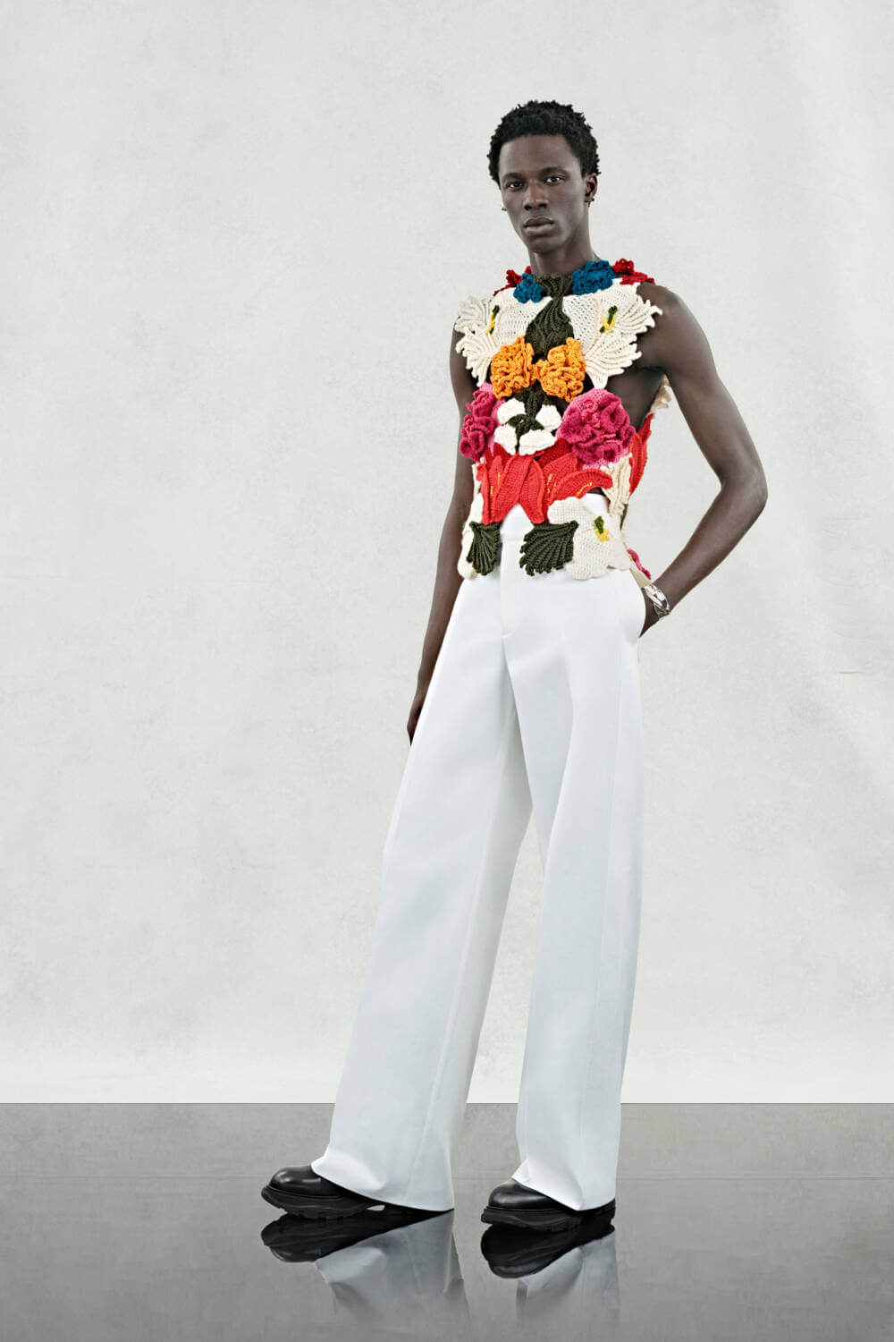 An air of delicacy is reinforced by both construction and pattern choice. Three-dimensional hand-crocheted knitwear pieces are a feat of exquisite craftsmanship, with a multi-coloured version mirroring a floral bouquet and an ivory hinting at its crystallisation. Inspired by Dutch Old Master paintings, chiaroscuro flowers pop up across the collection, splashed onto structured suits and wool scuba coats. A subtle addition, crystal-encrusted silver flower broaches are pinned onto collars.