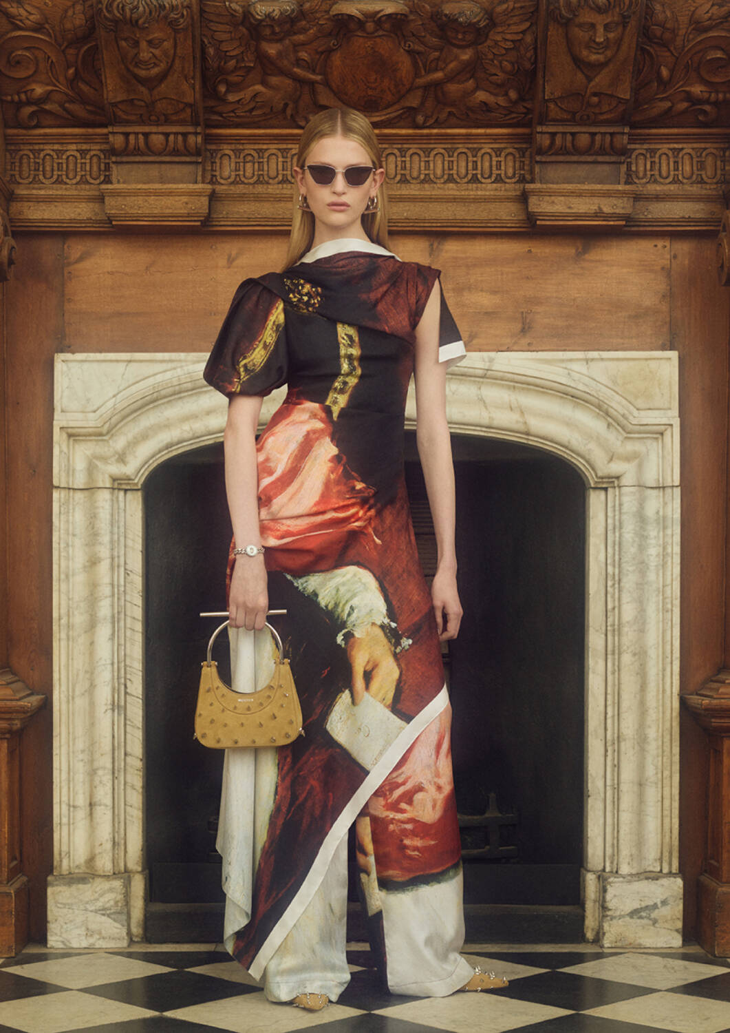 A rendering of Diego Velázquez’s portrait of the Pope Innocent X (1650) is spliced up and reassembled to form a silk twinset and the collection’s centrepiece – an asymmetrically draped dress that focuses on Pope Innocent’s right hand clutching a letter addressed to him by Velázquez. The painting is also transposed into a number of glamorous crystal-embellished turtleneck tops and dresses. Culminating with a gold encrusted shift dress, this is one slanted bourgeois party you won’t want to miss. See you there?