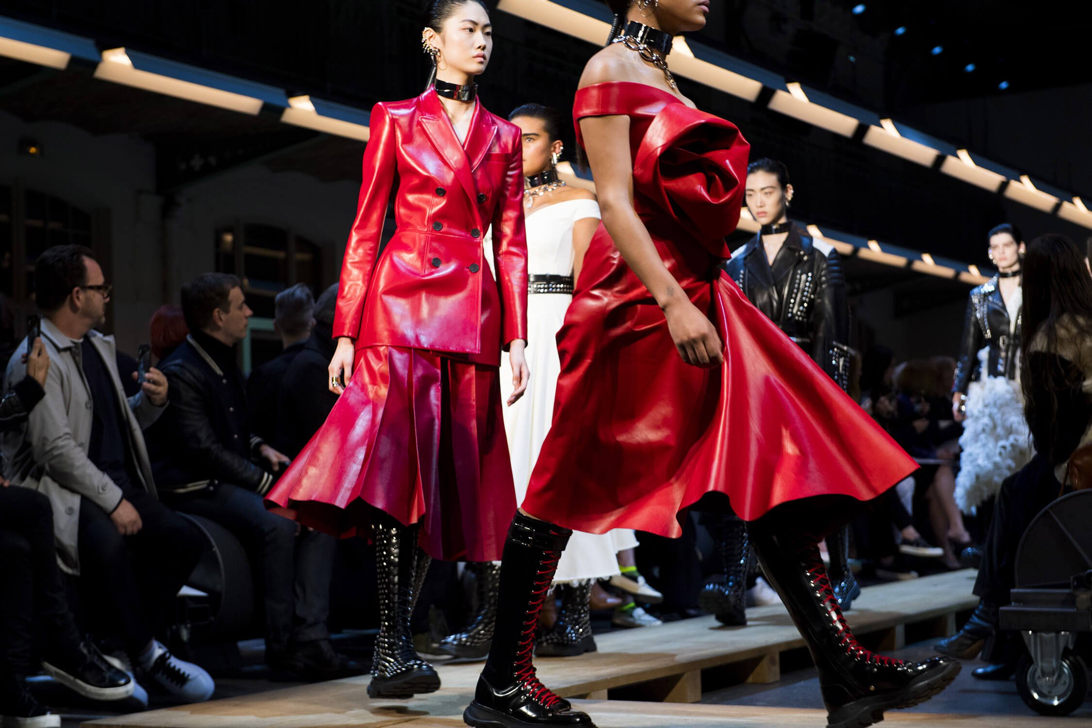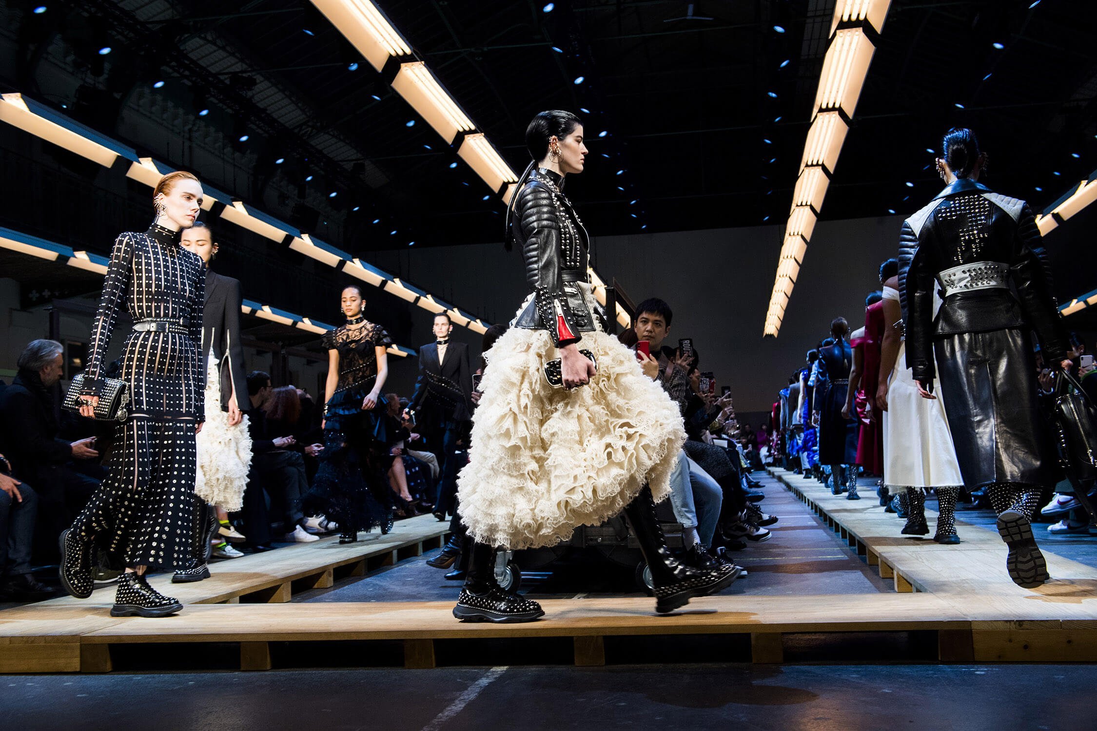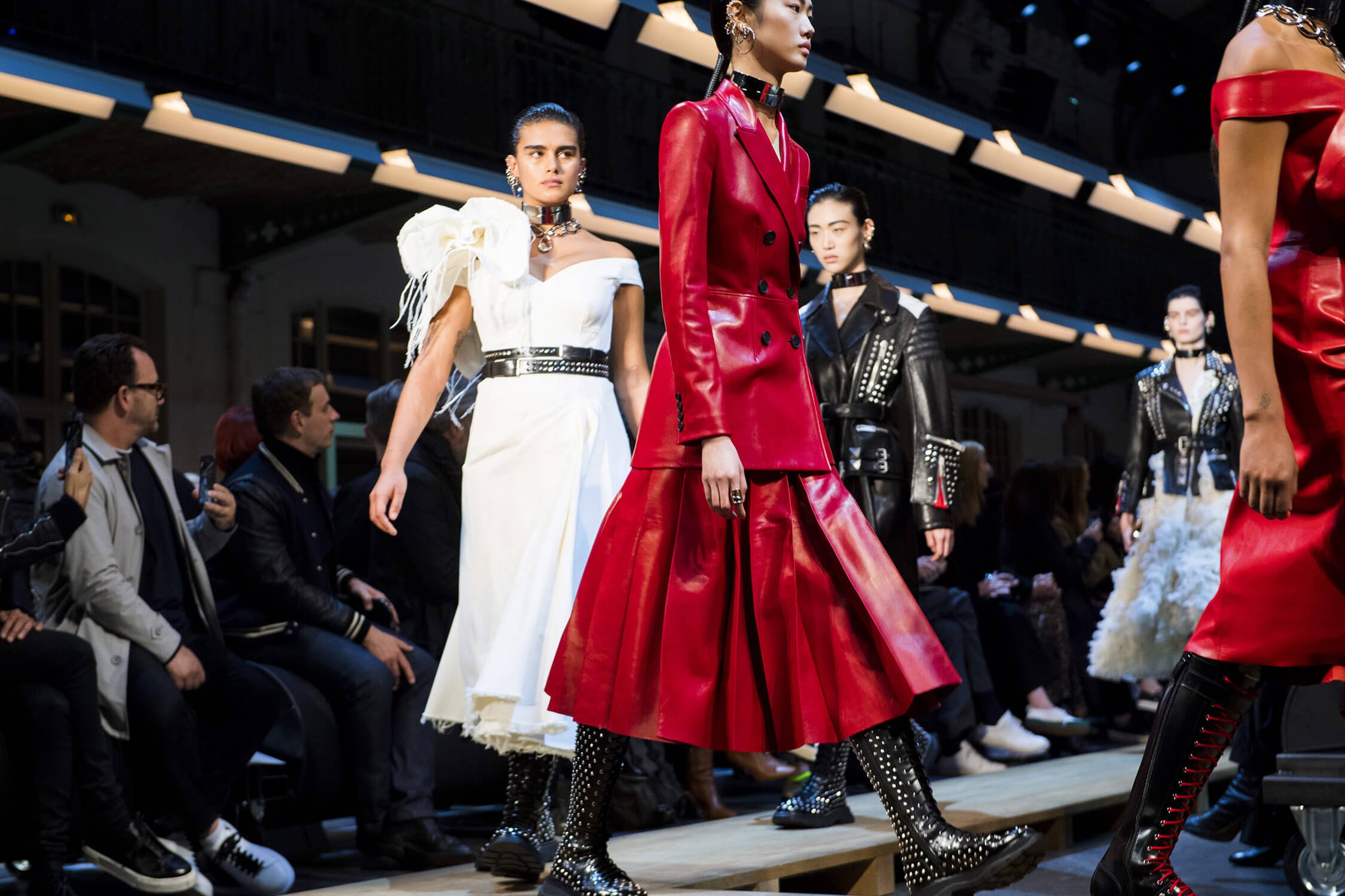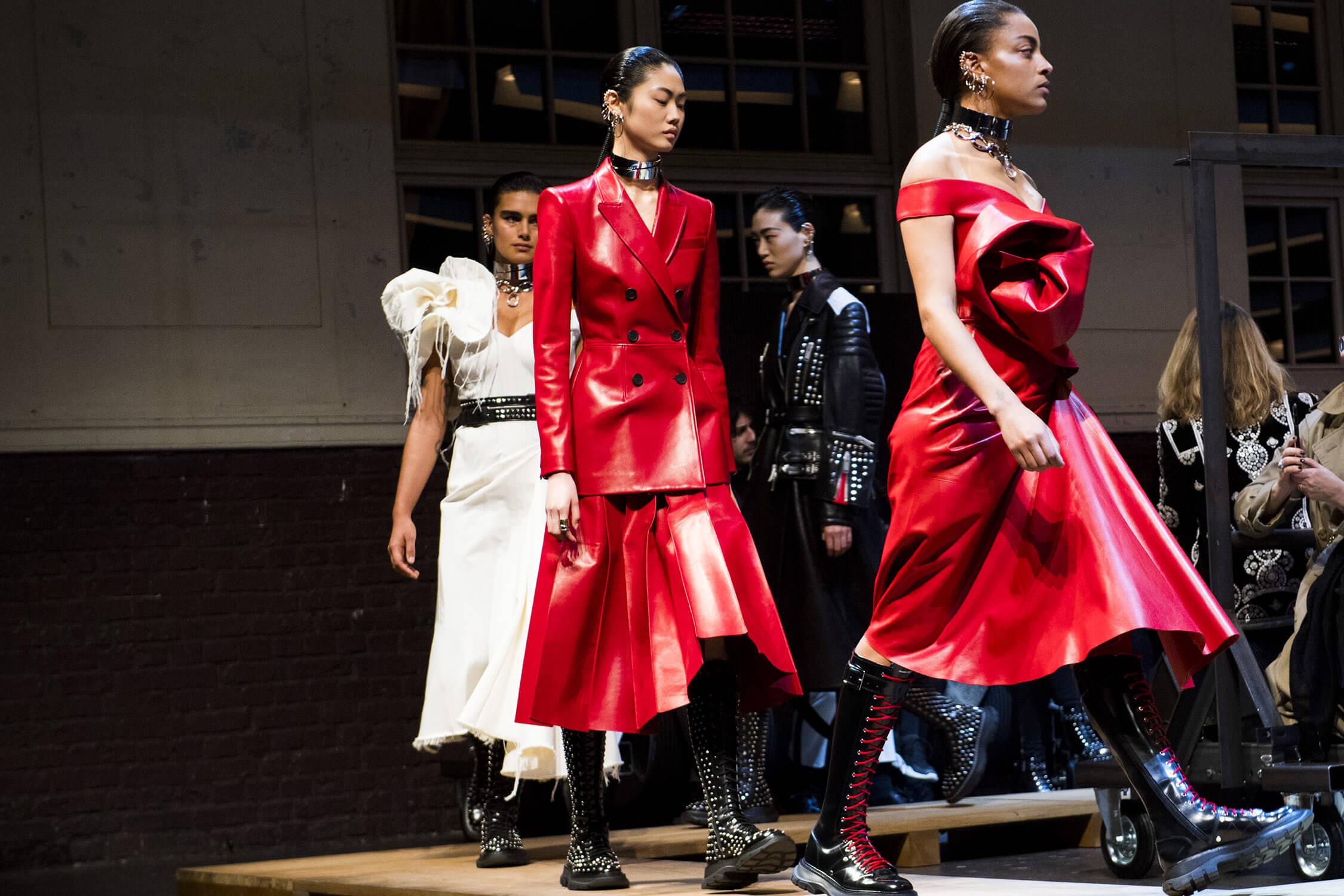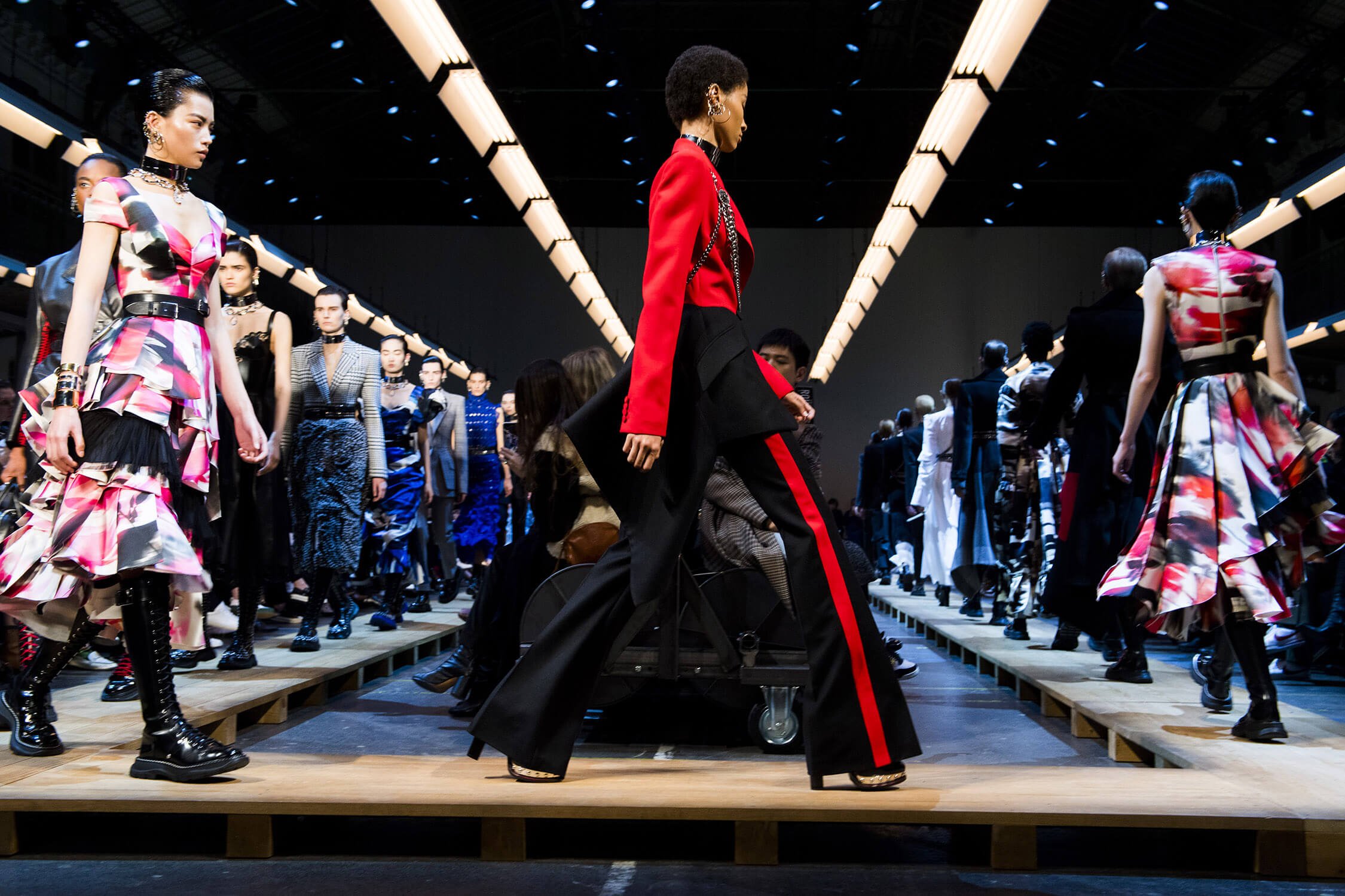 All roads led north for Sarah Burton who went back to where she came from, the industrial heartlands of northern England, for this stunning Alexander McQueen show. It was a powerful and sensitive exploration of the region’s history from the 15th century Wars of the Roses, to its fashion powerhouse past – its wool and cotton mills that clothed the Empire. To this day if you want the best quality tailoring cloth, you must go north. The audience sat on industrial bolts of Made in England fabric and the the show paid homage to British cloth and craft.