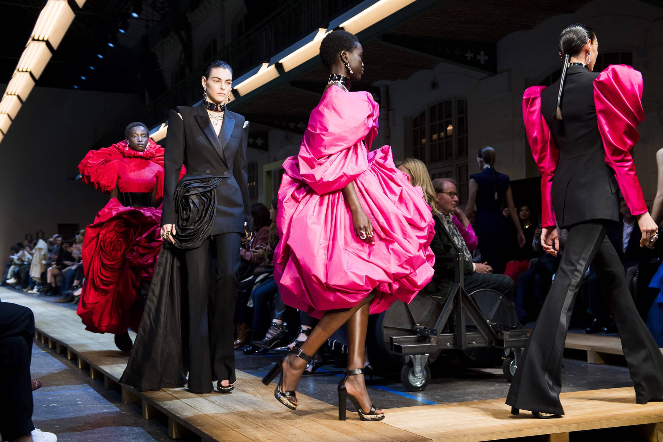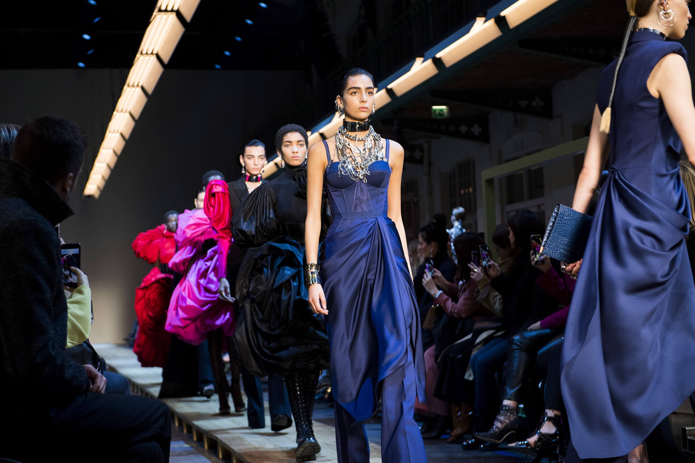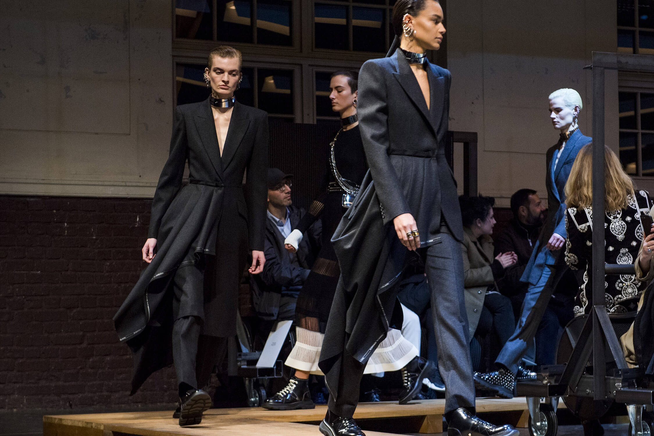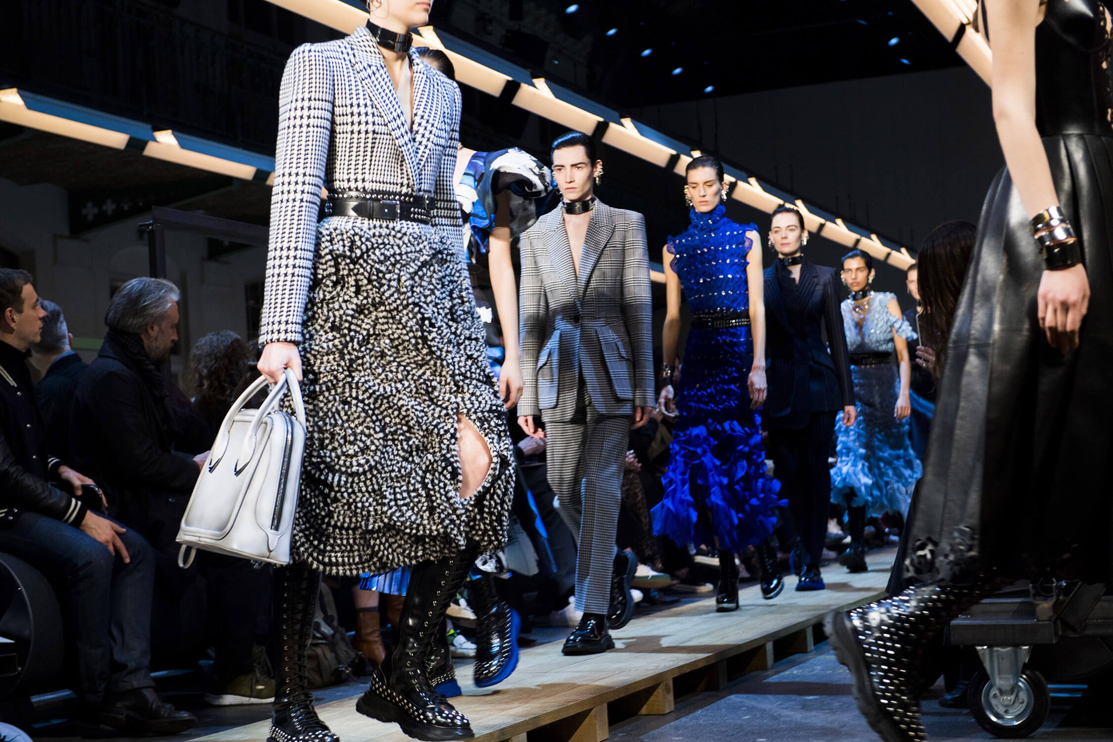 All roads led north for Sarah Burton who went back to where she came from, the industrial heartlands of northern England, for this stunning Alexander McQueen show. It was a powerful and sensitive exploration of the region’s history from the 15th century Wars of the Roses, to its fashion powerhouse past – its wool and cotton mills that clothed the Empire. To this day if you want the best quality tailoring cloth, you must go north. The audience sat on industrial bolts of Made in England fabric and the the show paid homage to British cloth and craft.
