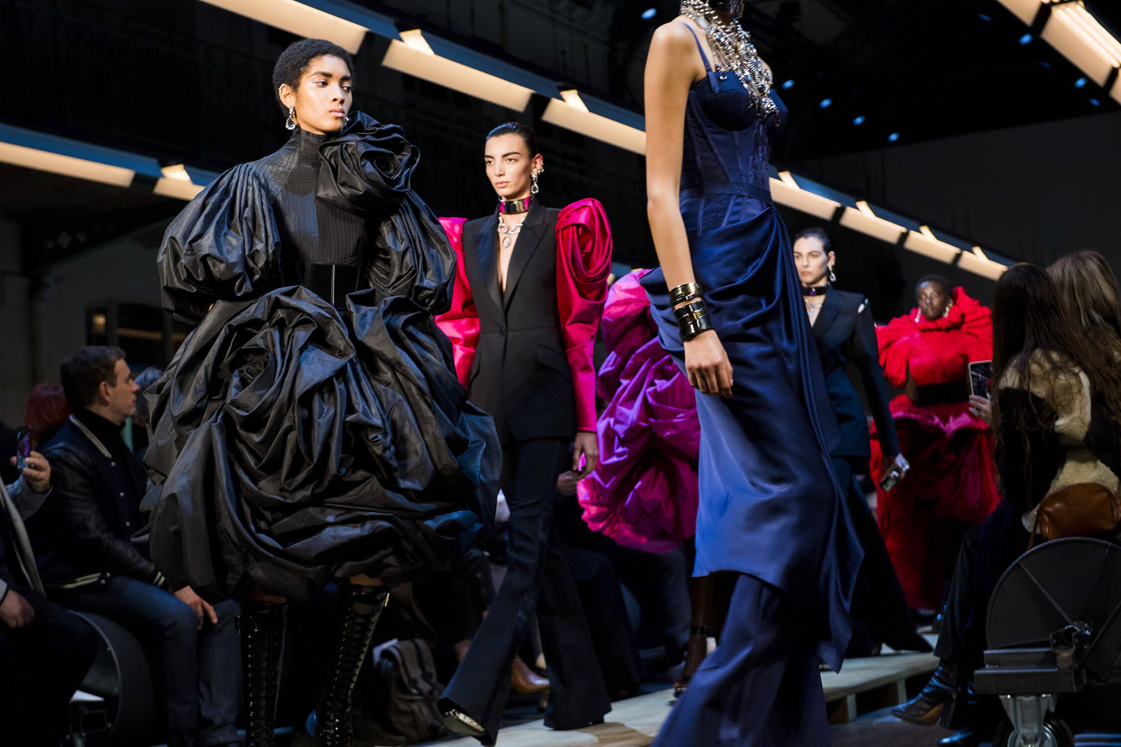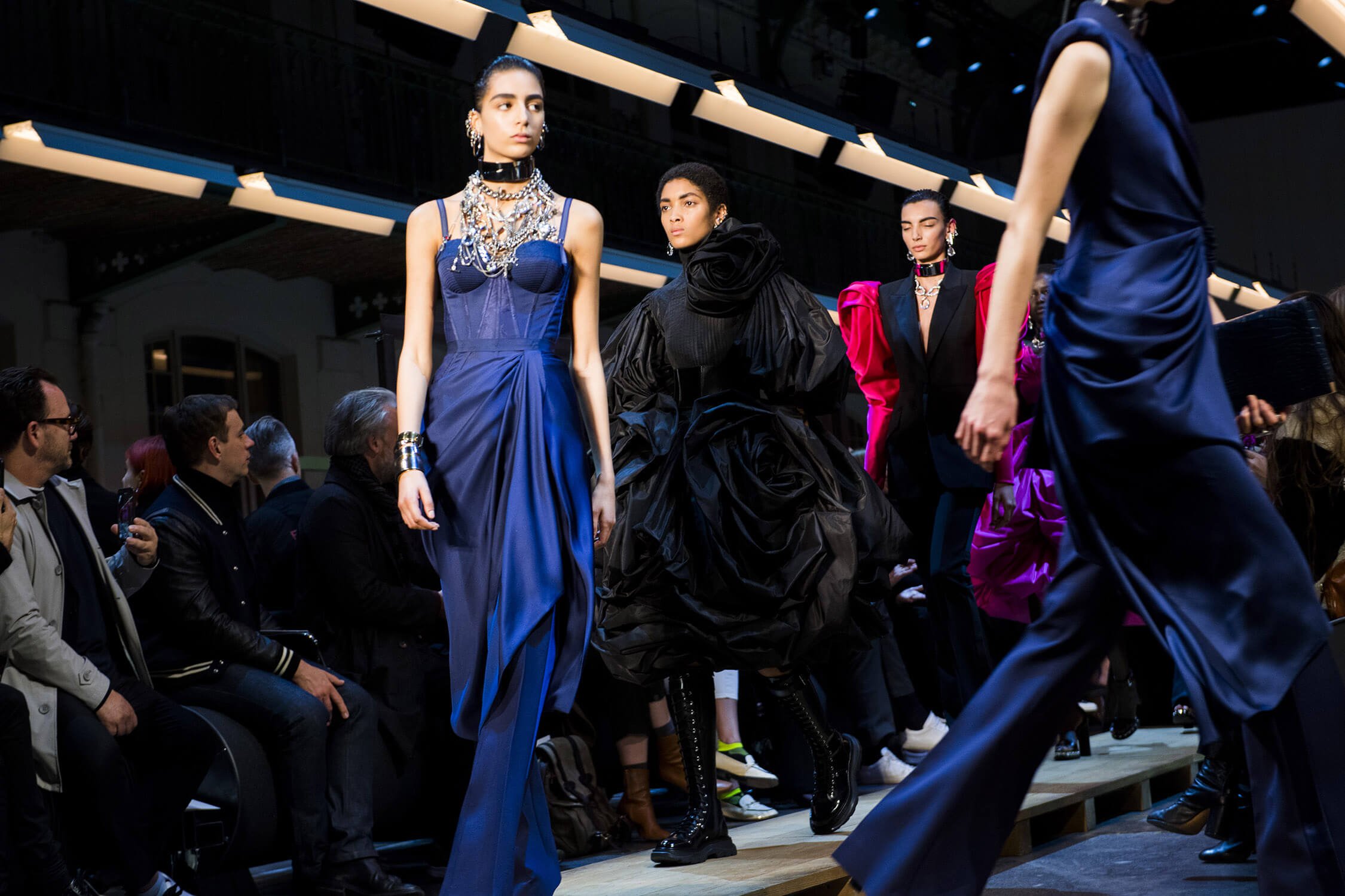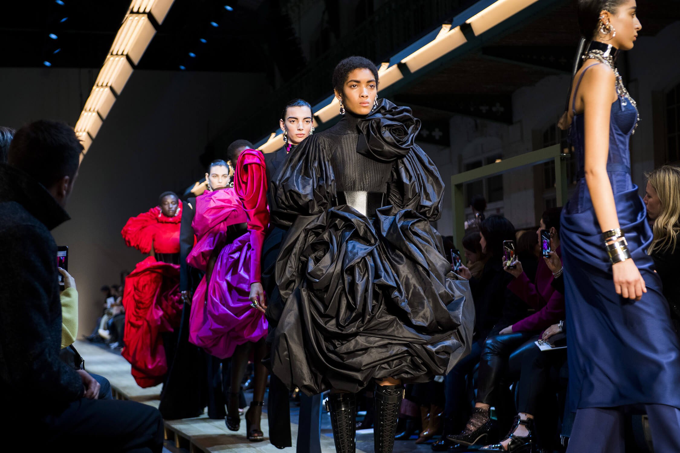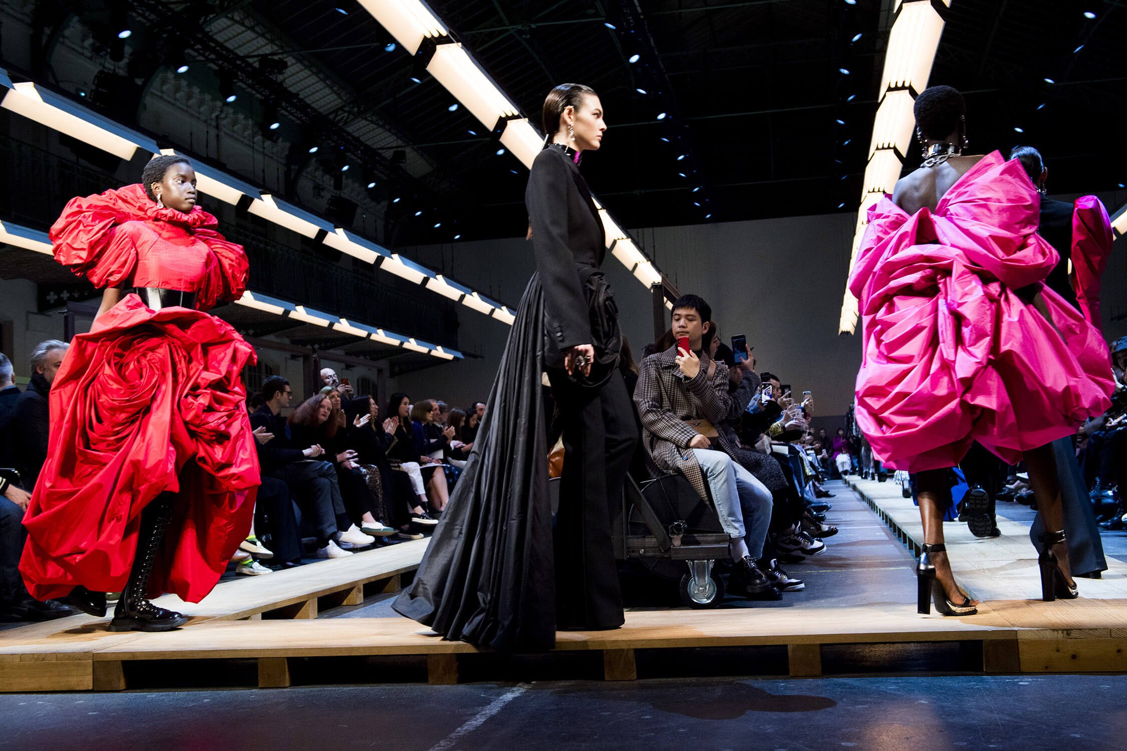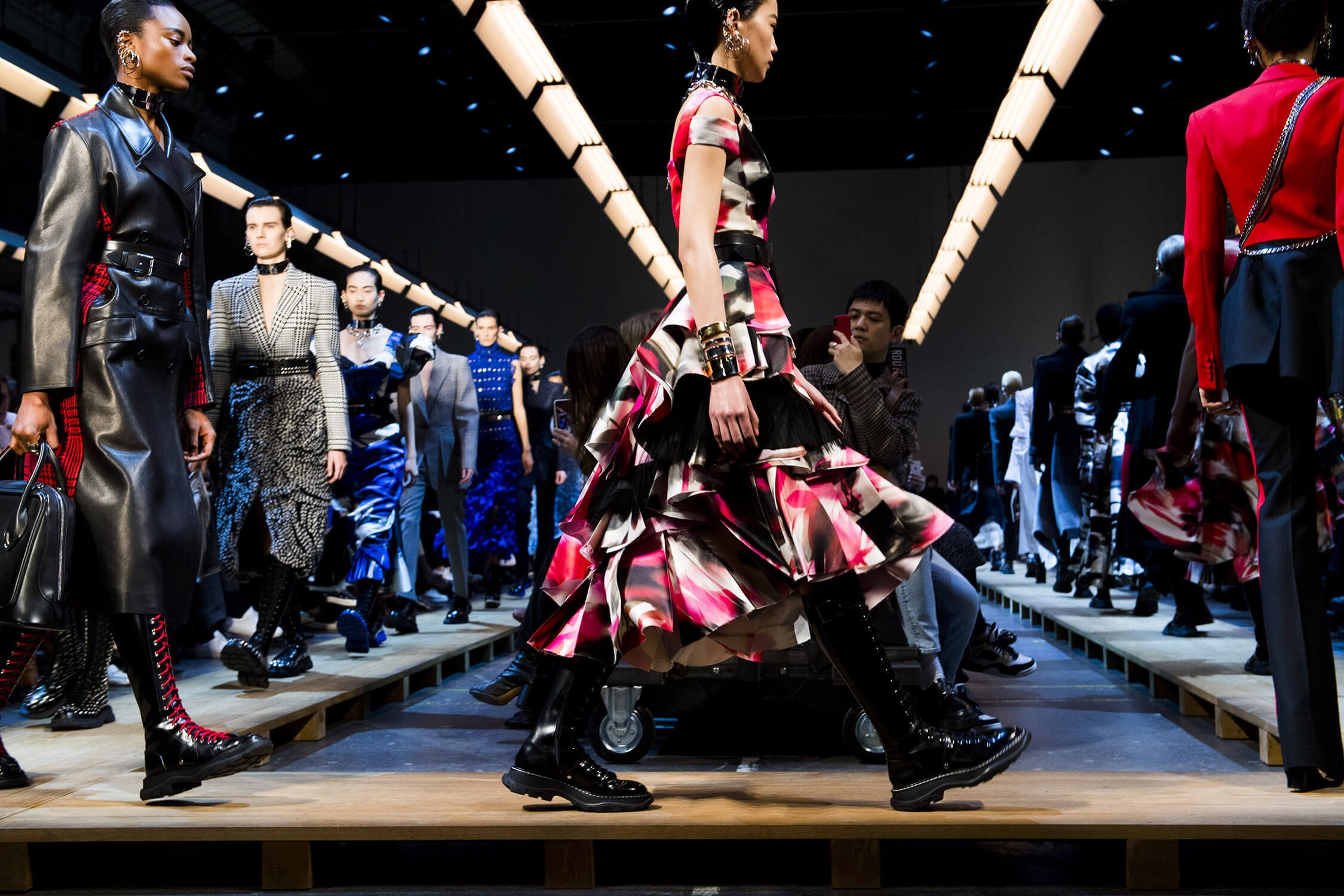 All roads led north for Sarah Burton who went back to where she came from, the industrial heartlands of northern England, for this stunning Alexander McQueen show. It was a powerful and sensitive exploration of the region’s history from the 15th century Wars of the Roses, to its fashion powerhouse past – its wool and cotton mills that clothed the Empire. To this day if you want the best quality tailoring cloth, you must go north. The audience sat on industrial bolts of Made in England fabric and the the show paid homage to British cloth and craft.