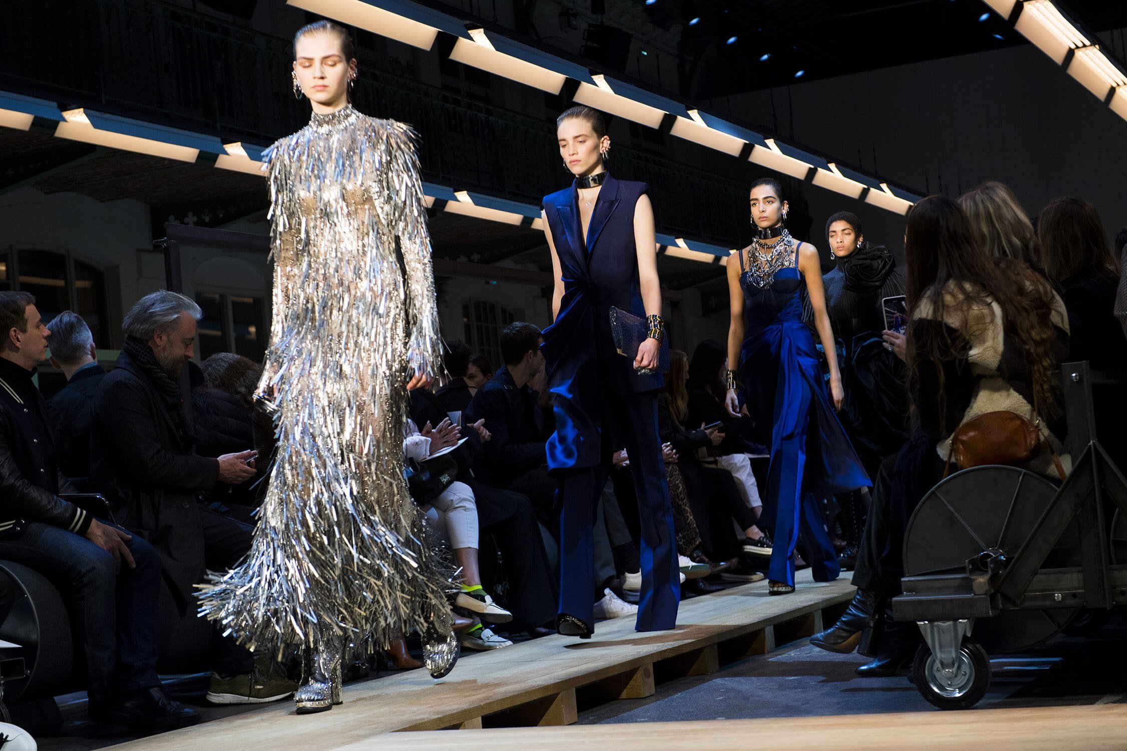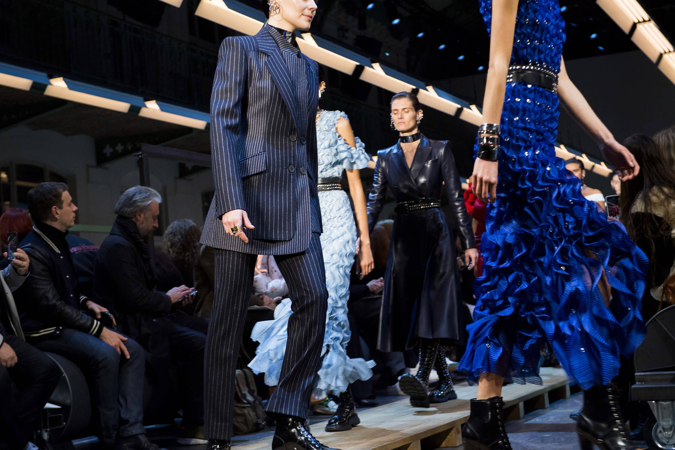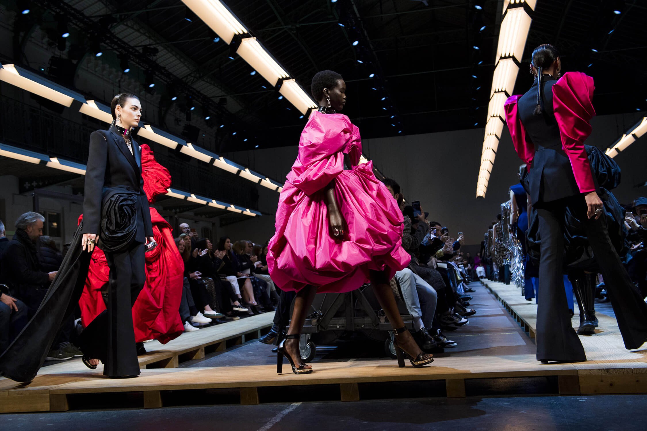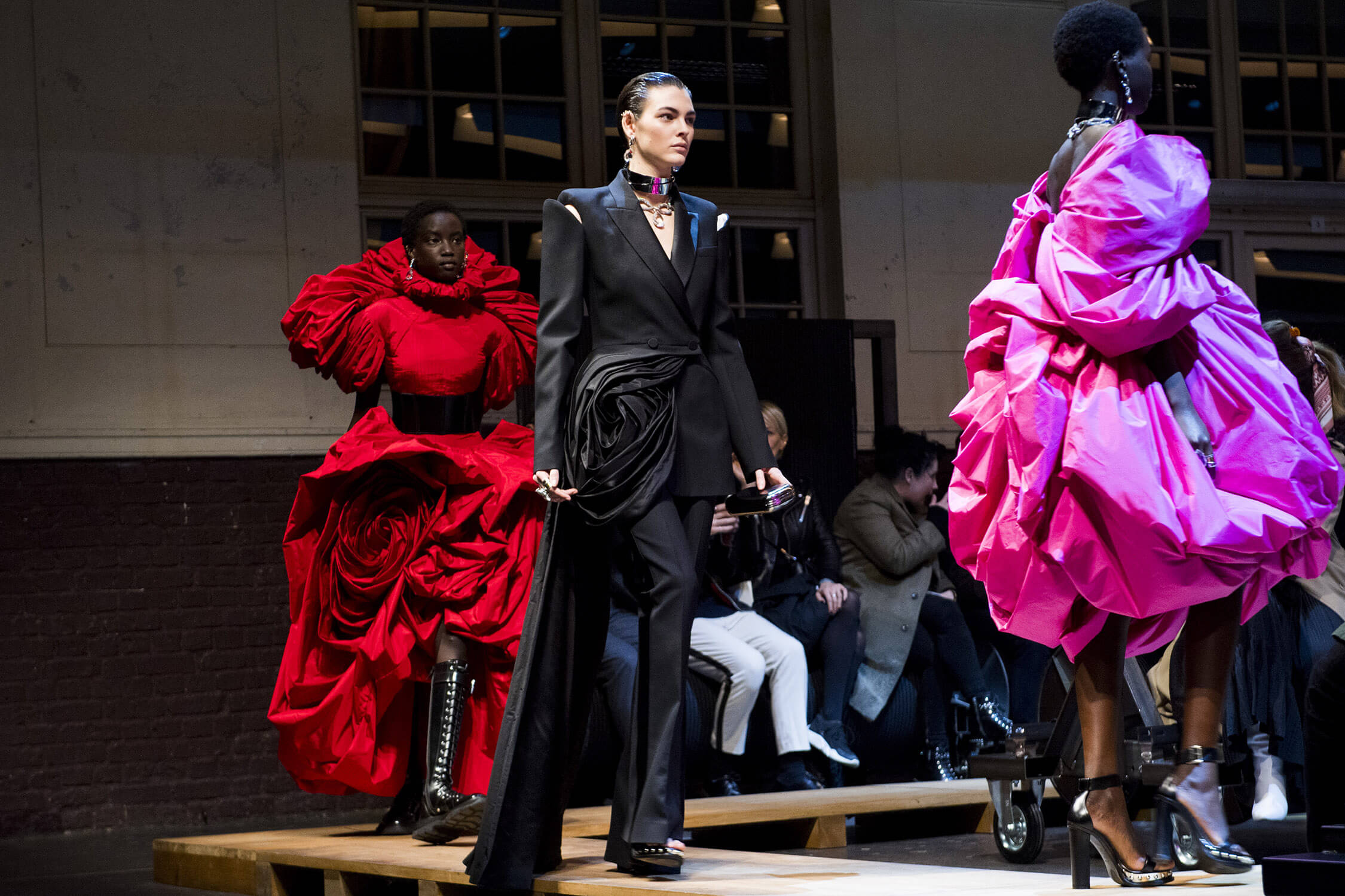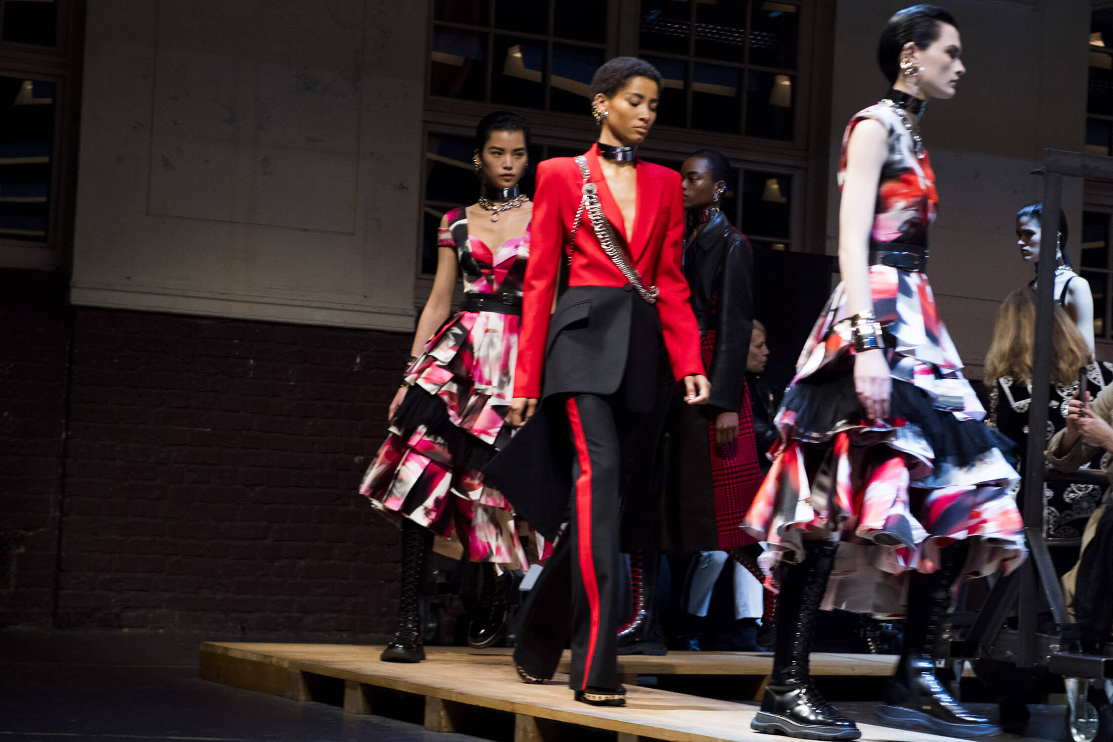 Tailoring took centre stage: Sharp, sartorial but with a feminine edge. The McQueen cut is second to none and all the fabrics told a story. The softness of the local water helped make the flannel of the opening look feel lush and lustrous. The cotton poplin in a shirt dress came from a Pennine mill which first opened in 1790. One dress was encrusted with silver fragments of loom machinery. The gritty photography of northern industrial towns informed prints but there was also a sweeping romanticism inspired by the Wars of the Roses. Rose pattens prevailed and the finale dresses on Adut and Anok were sculpted in silk taffeta and made to resemble roses in bloom. It was beautiful, breathtaking and very McQueen.