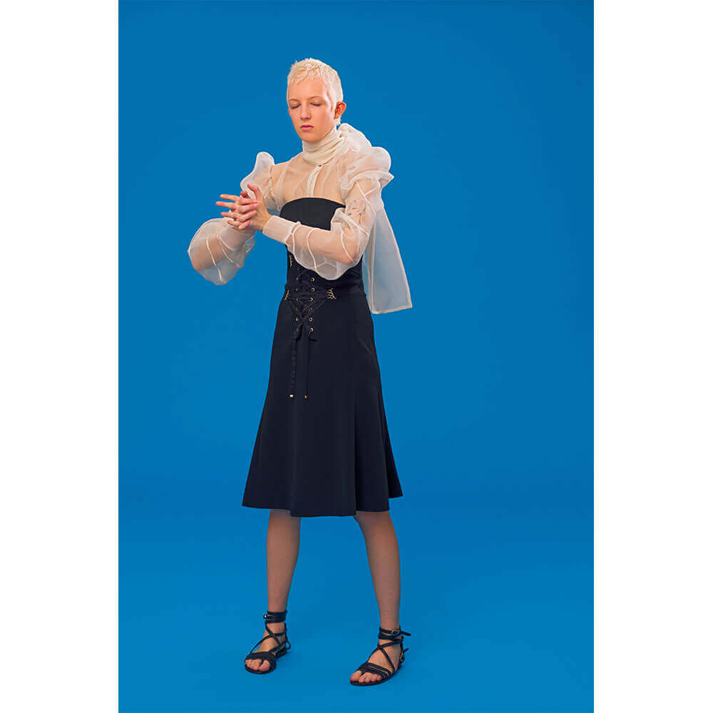 Fashion week looks kind of cool and all… But when you’ve got seminal punk photographer Derek Ridgers shooting your collection instead of a traditional fashion week format, those cramped front rows and tiny bottles of Evian water look rather naff in comparison. Antonio Berardi has firmly avoided the hectic fashion week circuit for some seasons now – letting the clothes speak for themselves without the pyrotechnics. This time around, Berardi has enlisted Ridgers behind the lens to shoot a collection of playful silhouettes and sleek evening-wear. Inspired by angelic creatures and their multifaceted androgyny, 10+ cover star Finn Buchanan looks heavenly in an array of shirt dresses and gorgeously tailored suiting – all in soft-to-touch textures.