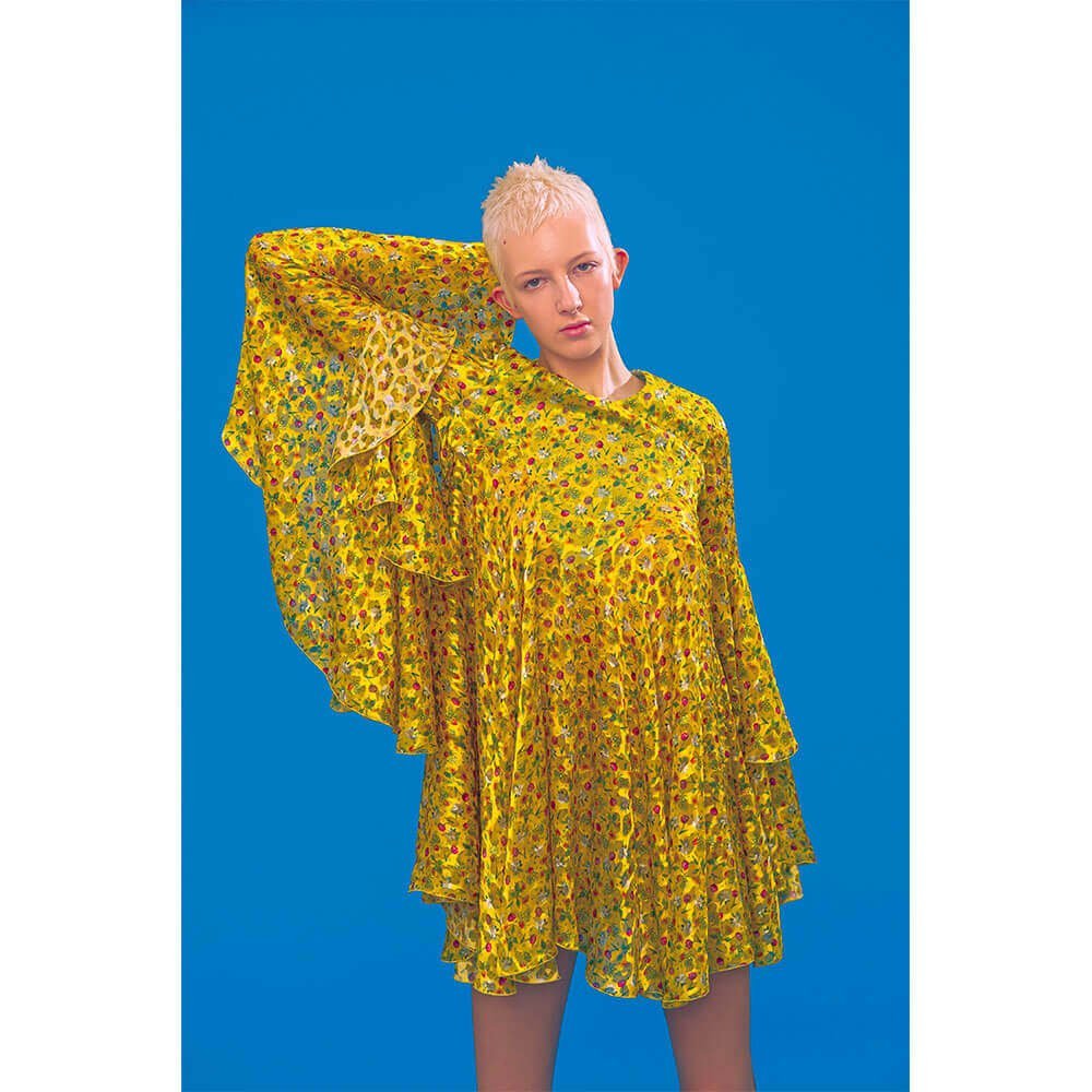 High-waisted matador trousers and classic black shirting is perforated with gold lining, topped off with classic gladiator sandals. Nipped-in blazers are fitted with a corsetry finish, cut into tulip printed chifon, whilst ruched organza shirting is worn beneath a slender navy dress – styled by our very own Editrix Sophia Neophitou. The star of the show however was a buttercup yellow silk animal devoré, printed with dainty florals which was used to make floor-length gowns and a fluted sack-back dress meets roman tunic – when can we place our orders?