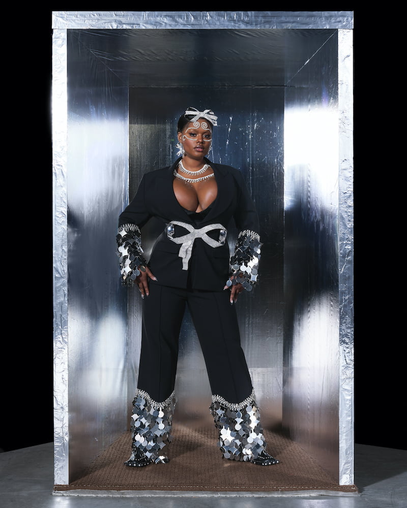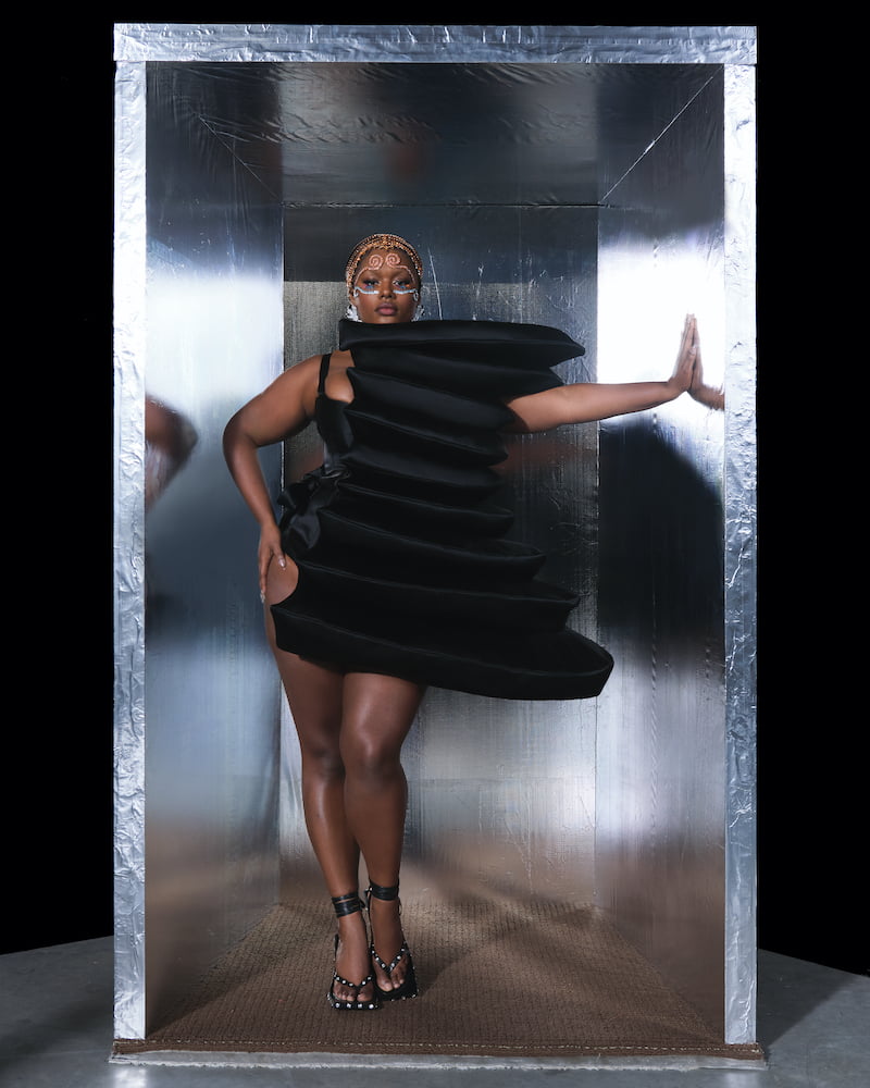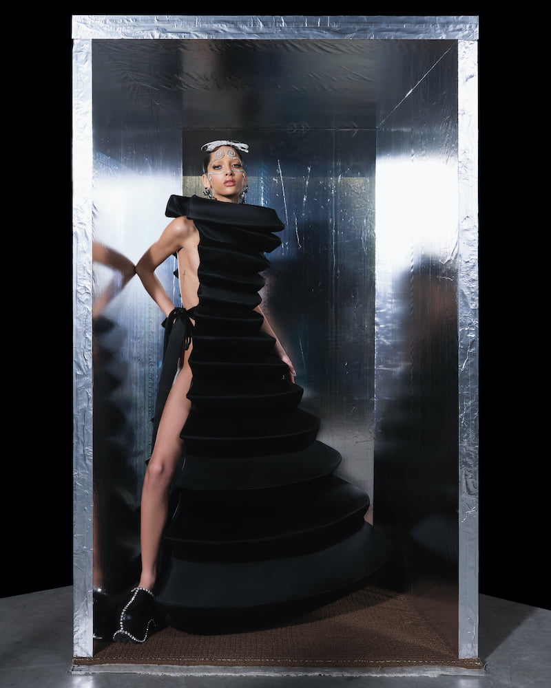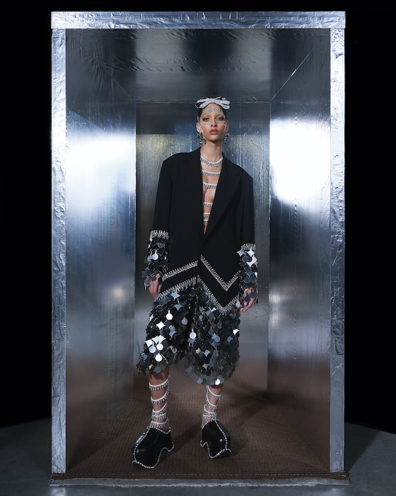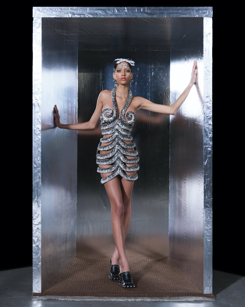 With their debut Haute Couture collection, the designers wanted to illustrate a shared passion for custom-tailoring. “We feel like every type of body is beautiful and we wanted to highlight that by playing with a range of silhouettes created to complement the wearer,” says the pair, who have produced Le Smoking suits trimmed with an army of silver metal jewels and tiered ‘Accordion’ gowns (it’s practically criminal that these won’t be worn on a red carpet anytime soon).