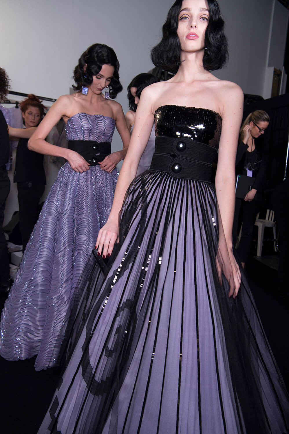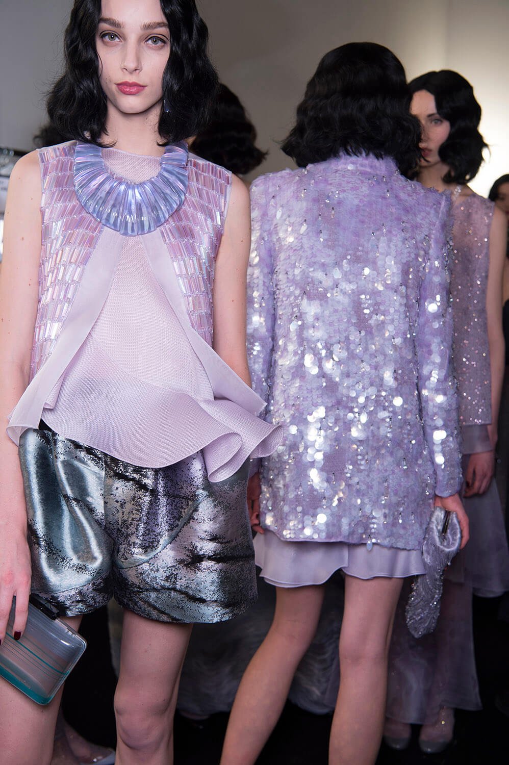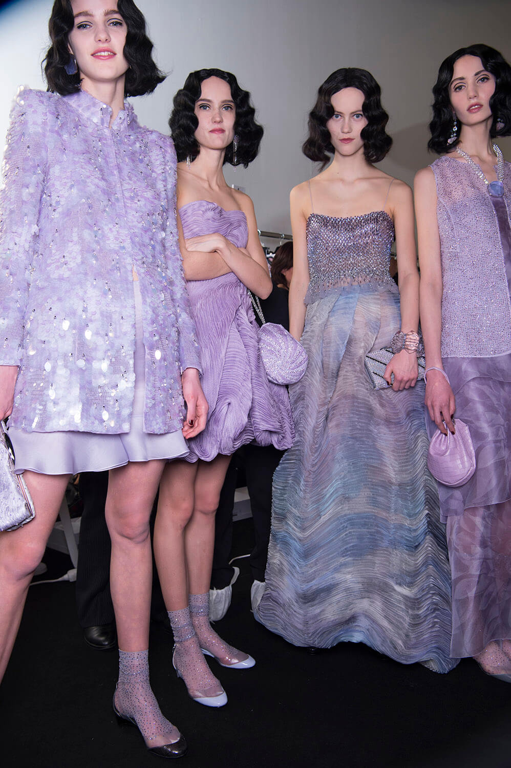 Mauve. That was Giorgio Armani’s hue of choice for his spring/summer Privé collection. Purple wasn’t the only colour – there was plenty of graphic black, used to sketch out the linear, slick silhouette Mr Armani and his clients both love (the former to make, the latter to wear), and a smoky slither of ash grey. The later was underscored by a spurt of dry ice, clouding the dreamiest of evening dresses in a chic chiaroscuro. Okay so shall we talk about the clothes? Fans of pleats, bugle beaded facets, sequinned flapper dresses, exquisite ruffles and waves of fabric flowing around and wrapping the body, moving like lavender water about the female form. Purple reigns. Armani does too.