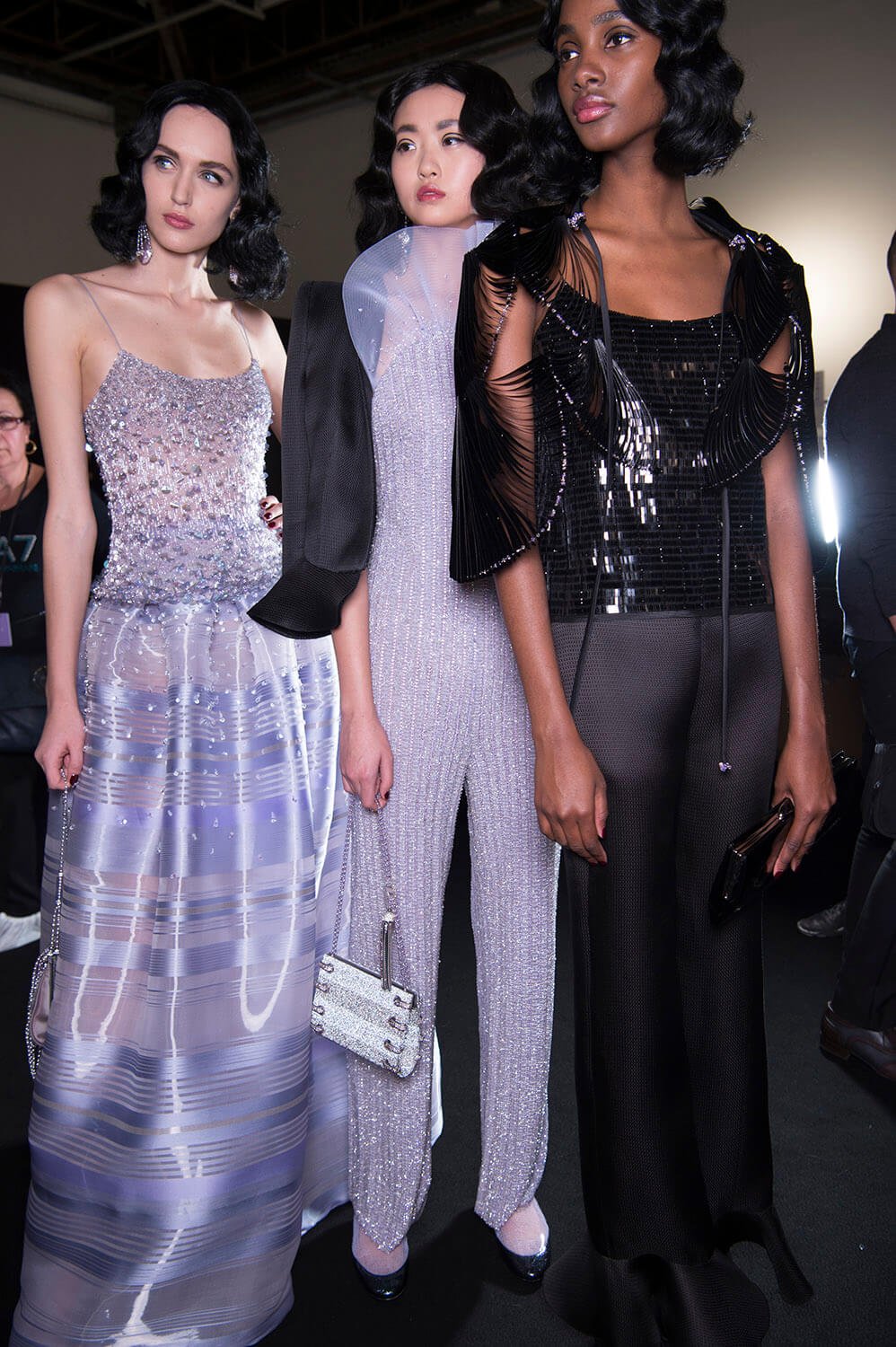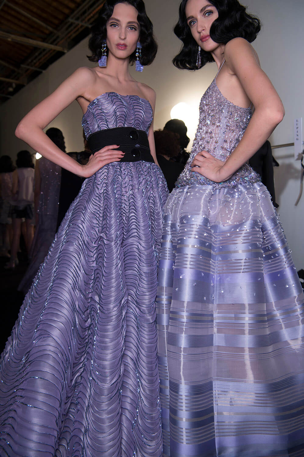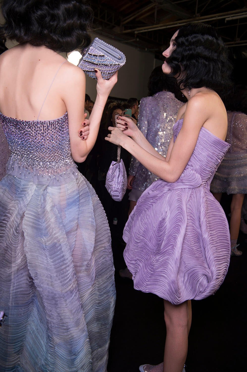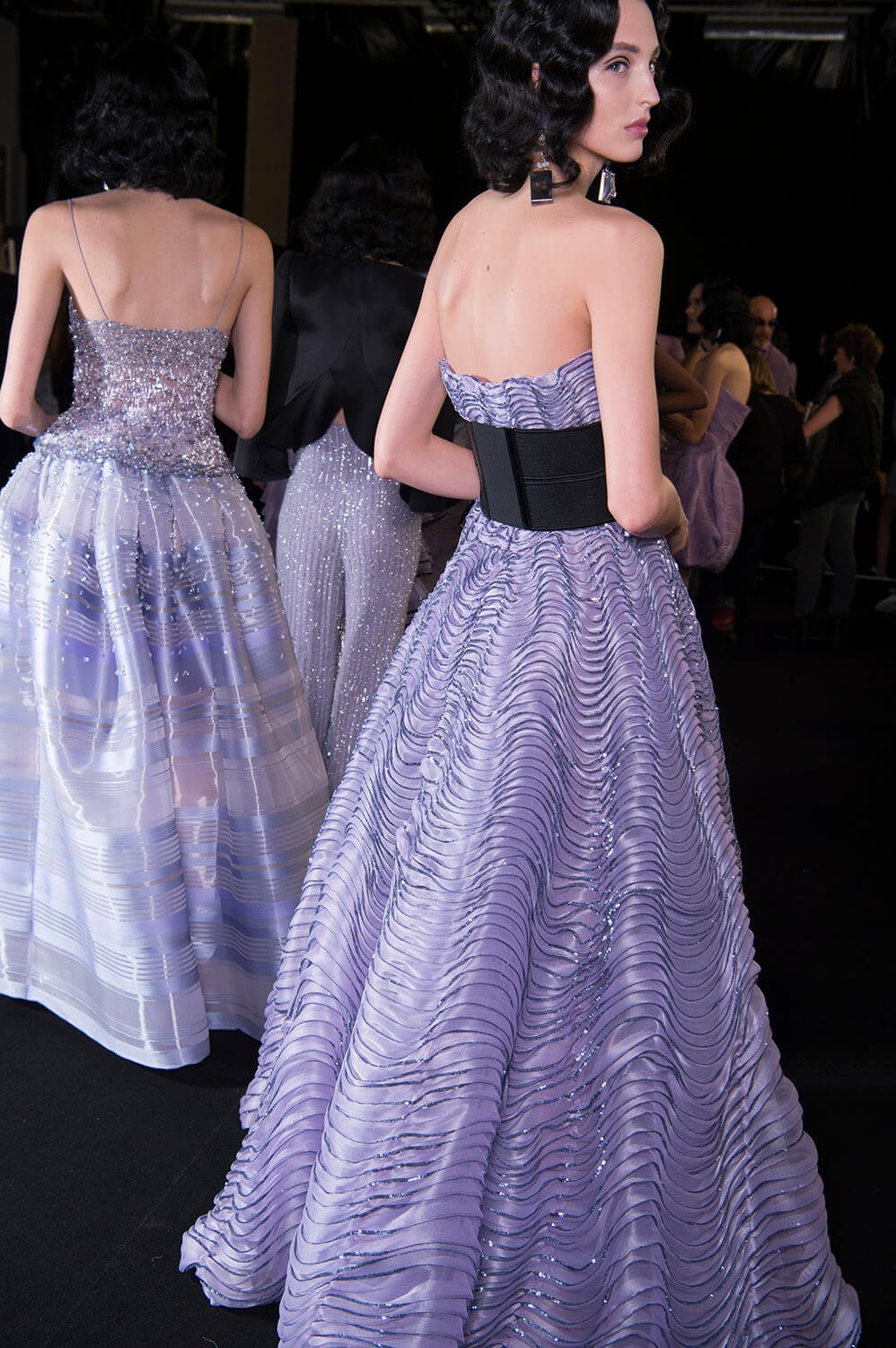 Mauve. That was Giorgio Armani’s hue of choice for his spring/summer Privé collection. Purple wasn’t the only colour – there was plenty of graphic black, used to sketch out the linear, slick silhouette Mr Armani and his clients both love (the former to make, the latter to wear), and a smoky slither of ash grey. The later was underscored by a spurt of dry ice, clouding the dreamiest of evening dresses in a chic chiaroscuro. Okay so shall we talk about the clothes? Fans of pleats, bugle beaded facets, sequinned flapper dresses, exquisite ruffles and waves of fabric flowing around and wrapping the body, moving like lavender water about the female form. Purple reigns. Armani does too.