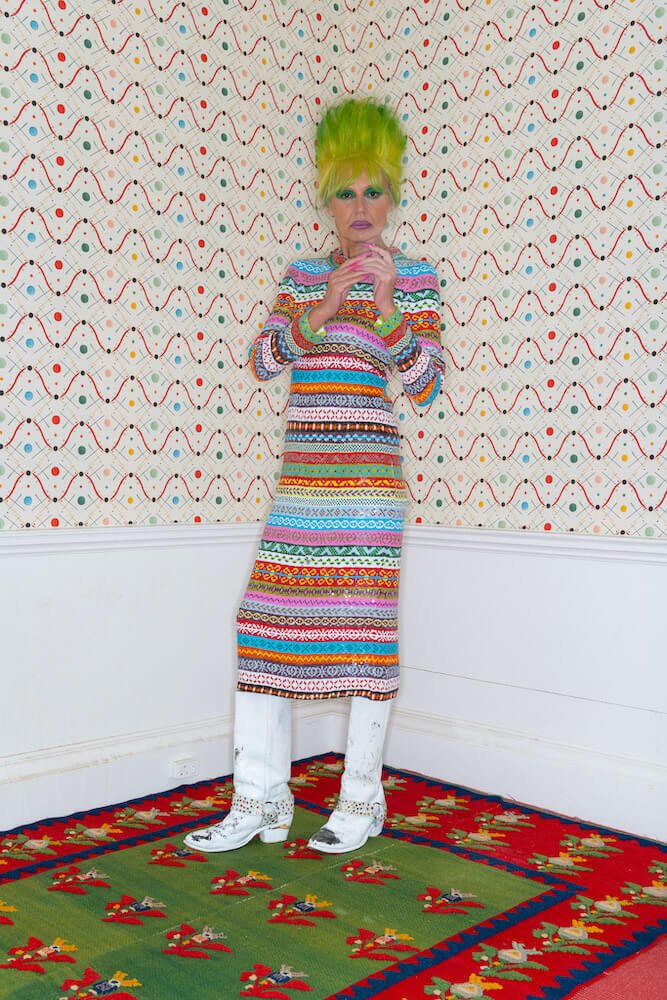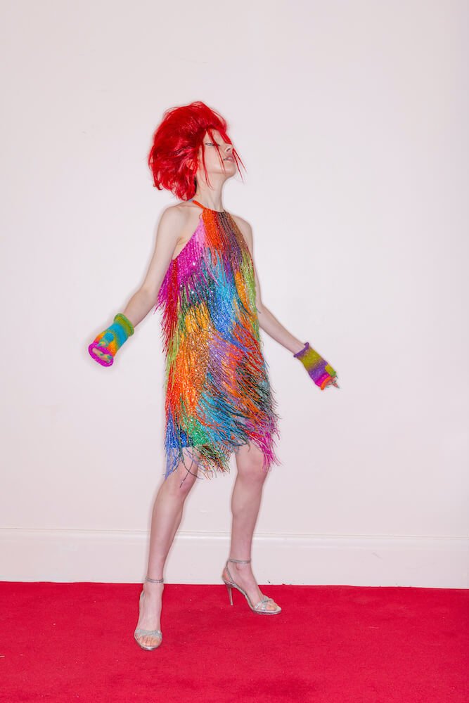 Carefully chaotic in its curation, Fair Isles frosted with sequins of the candy coloured variety sit alongside ikat twinsets, and evening gowns that move like liquid. At the collection’s core is three terrific jackets. First, a delightful fringed bomber which takes its Day-Glo hues from a quick sharpie sketch Ashish drew in his studio. This is paired alongside the designer’s take on a classic Chanel tweed, instead made entirely of sequins, right down to its frayed cuffs, and a houndstooth coat sprinkled with shimmering cherries. “This is something I did about 15 years ago and it got nicked twice, so I thought ‘Fuck this, I’m doing it again,'” said the designer.