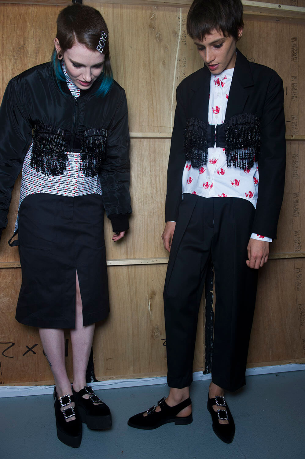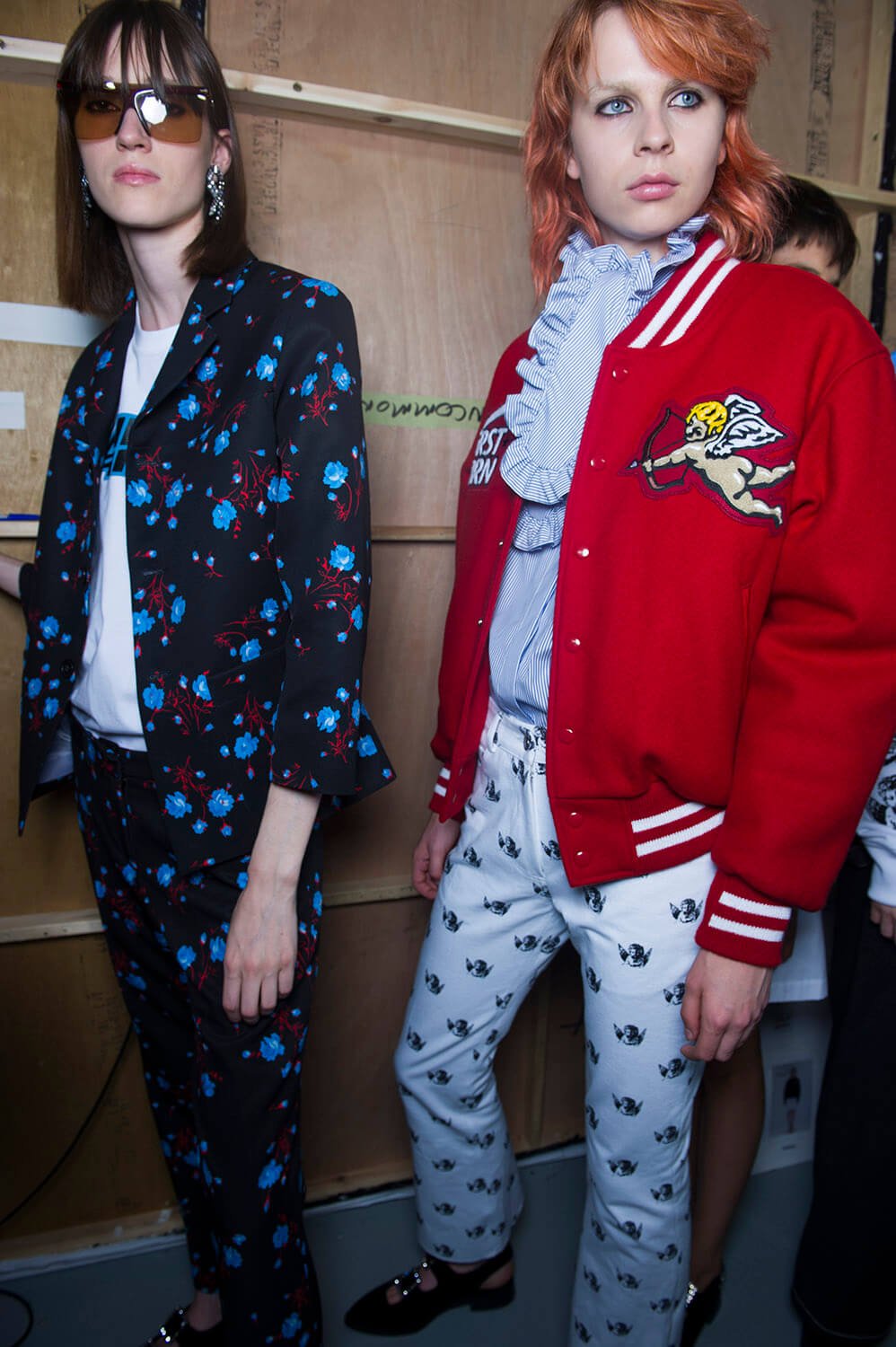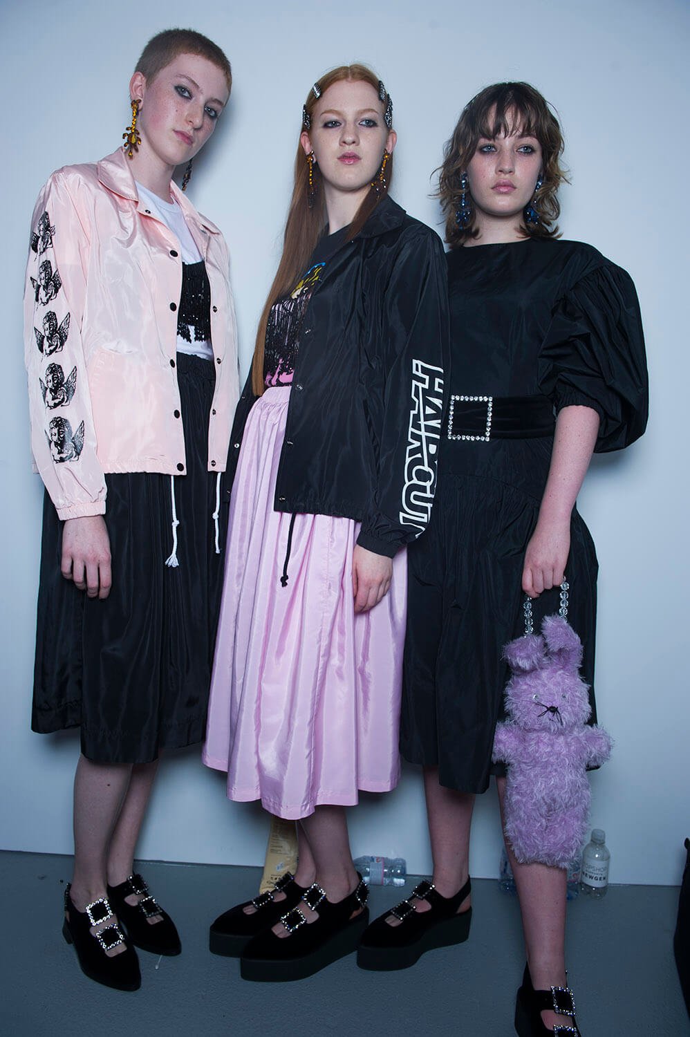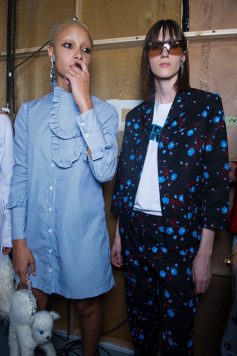 What was your teenage fantasy? Ashley Williams’ teenage fantasy involved River Phoenix, apparently. He was here, not quite literally but on printed out pieces paper that sat on a Canon printer, making an inkjet possibly the week’s most sought after accessory thus far. Quite difficult to carry, though. But anyway, this was an ode, a homage, to eighties girlhood (we wouldn’t know, we’re far too young), complete with a set featuring a large teddy bear and hair dye stained sink. And the clothes? Well, they were a little bit John Waters, as in, girlish, kitsch but somehow a bit warped, as if Ashley’s ladies were having dark dark thoughts underneath. There were floral dresses with boob-bead details (yes!), boxy suiting, flame prints that crept up the hems of skirts. Big old puffed-up sleeves. A proposal for a romper-esque dungaree. This was fierce lady action en masse. Oh, and the bags were cat shaped. Cat bags. Phoebe is excited.