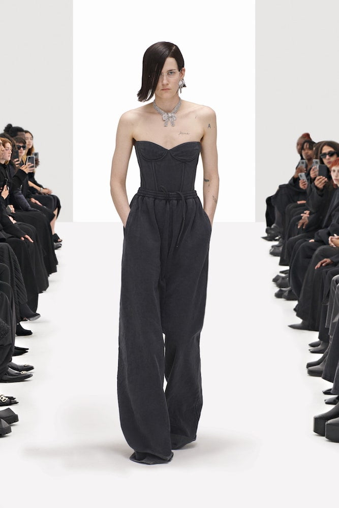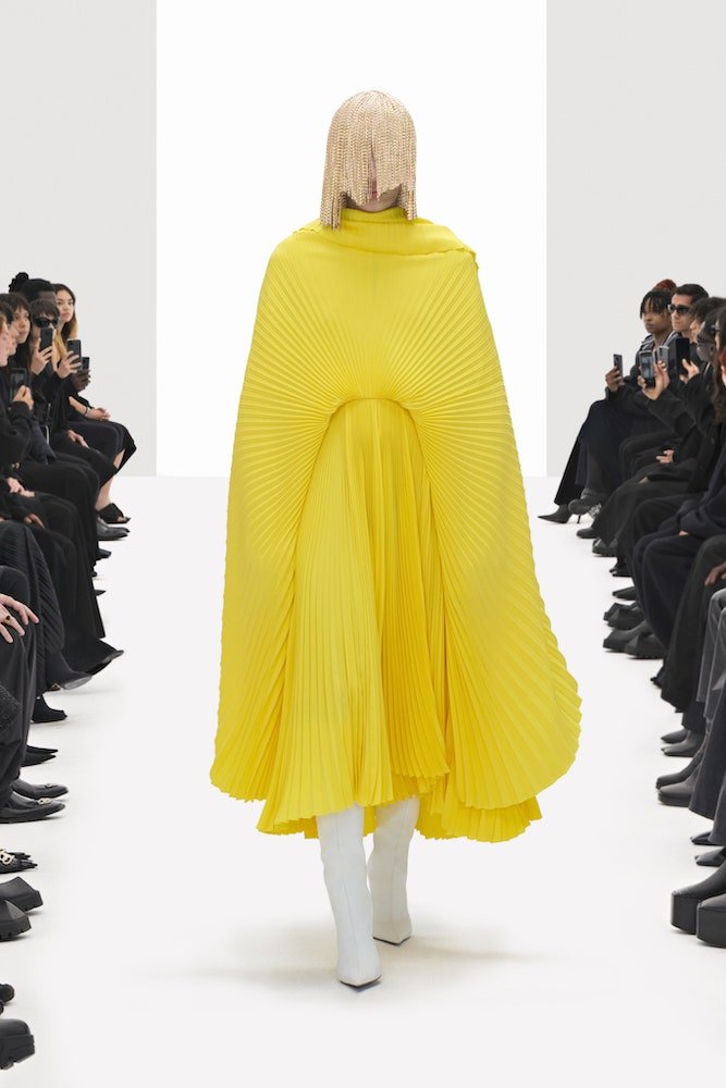 Those Gucci hack bags weren’t the only talking point accessories. In keeping with the ‘don’t believe your eyes’ theme, an archetypal shopping basket looked like it was plastic but was actually fashioned from thermo-formed leather whilst a carbon fibre clutch was designed to look like fast food packaging. Love ‘em or hate ‘em, those toe-shoes are back along with a second instalment of the Balenciaga Crocs collaboration (platform pool slides and wellies). The show closed with the striking mermaid gown – a tribute to the one worn by drag legend Divine in the 1972 movie Pink Flamingos.  Next stop couture.
