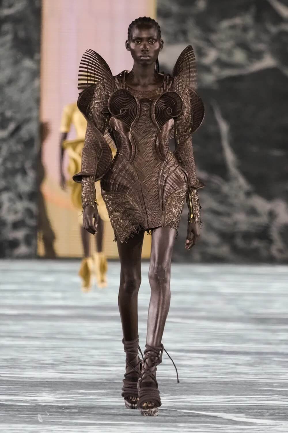 It also had a serious point. After what he described as a “summer of despair” which brought devastating heatwaves, floods, wildfires and droughts, Rousteing wanted to put climate change and sustainability at the top of his agenda. He admits Balmain is not 100% sustainable but he’s using many more sustainable earth-friendly fabrics, such as FSC- and Ecovero-certified viscose and sustainable Italian linens. He also used several raw, undyed fabrics which cut water usage. The collection oscillated between complex, crafted pieces – many made from biodegradable raffia and bamboo – and layered samurai warrior looks which gave the collection a raw edge.