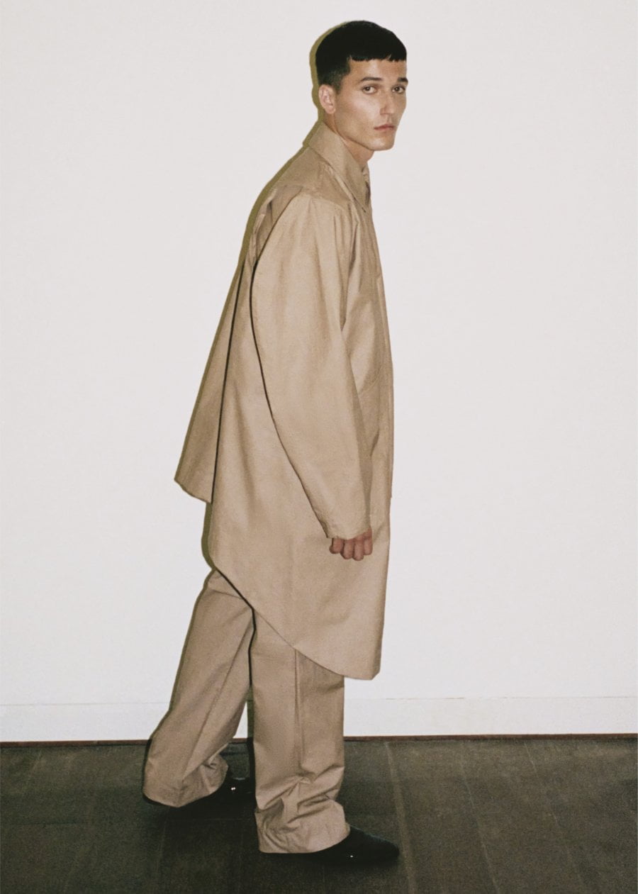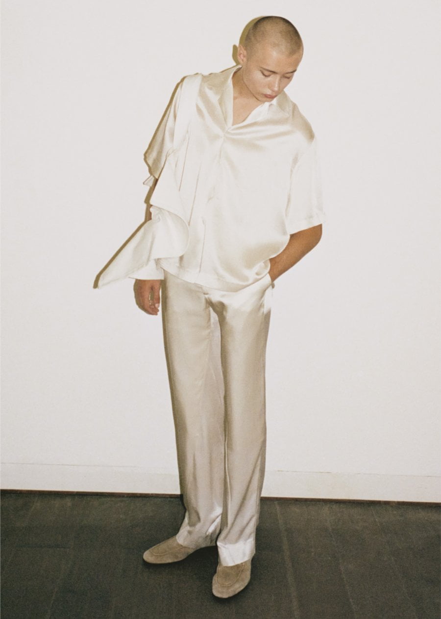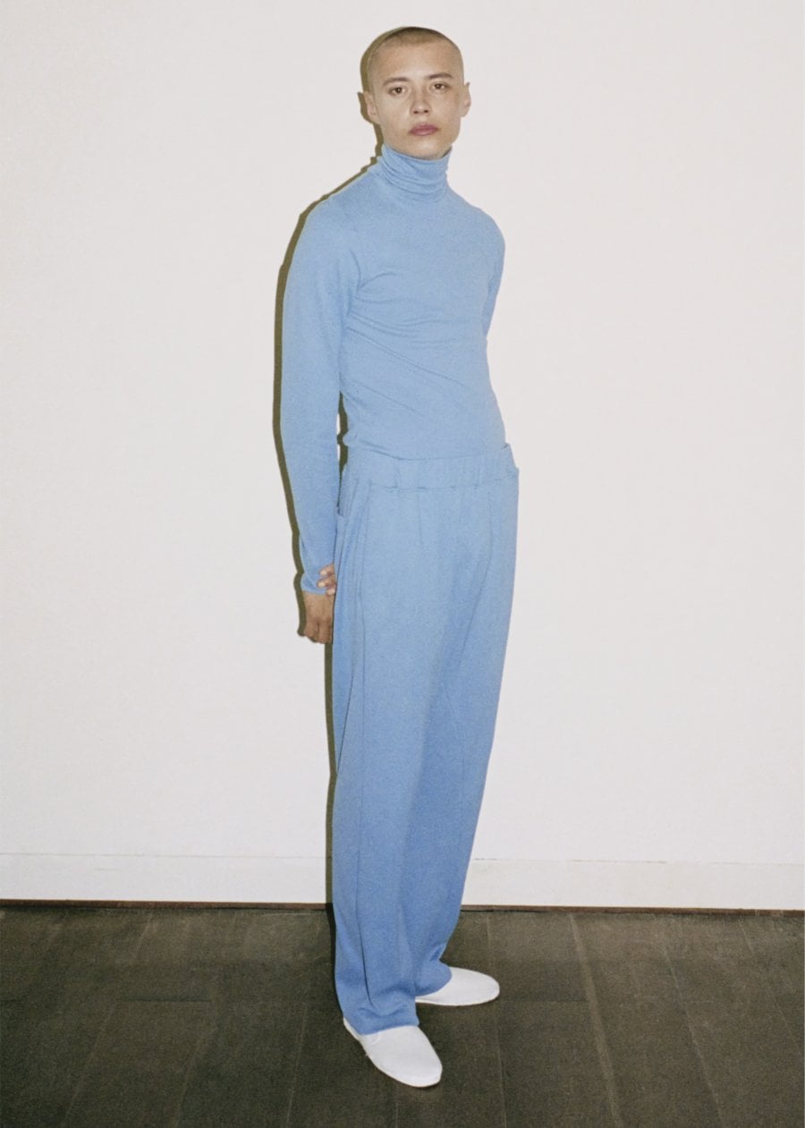 In response, she adapted her traditional twisted shapes and silhouettes. Gone are crinkled office shirts and ruched trousers, making way for pullover jackets and polo shirts that can be put on with one swift movement. This season the brand works in viscose, lightweight cotton and upcycled indigo denim courtesy of an ongoing collaboration with ISKO, also working alongside Farah to create a wardrobe that can be worn all summer long.