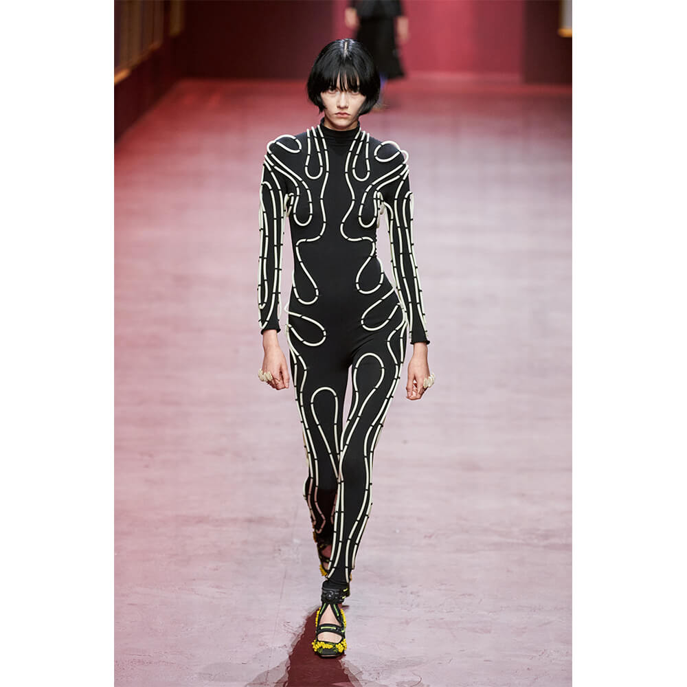 At Dior, Maria Grazia Chiuri’s AW22 collection was all about crossing borders: between haute couture and sportswear, elegance and athleisure. Pairing dresses with bracers, Dior’s women looked to the future. The opening look – a full-length jumpsuit with applications forming lines that traced the body, resembling wires and diodes – was something that could be worn by the protagonist of Titane. See you in the cyberpunk realm.