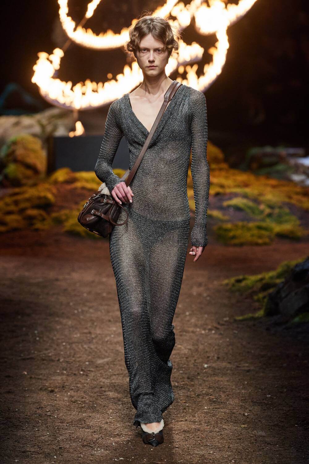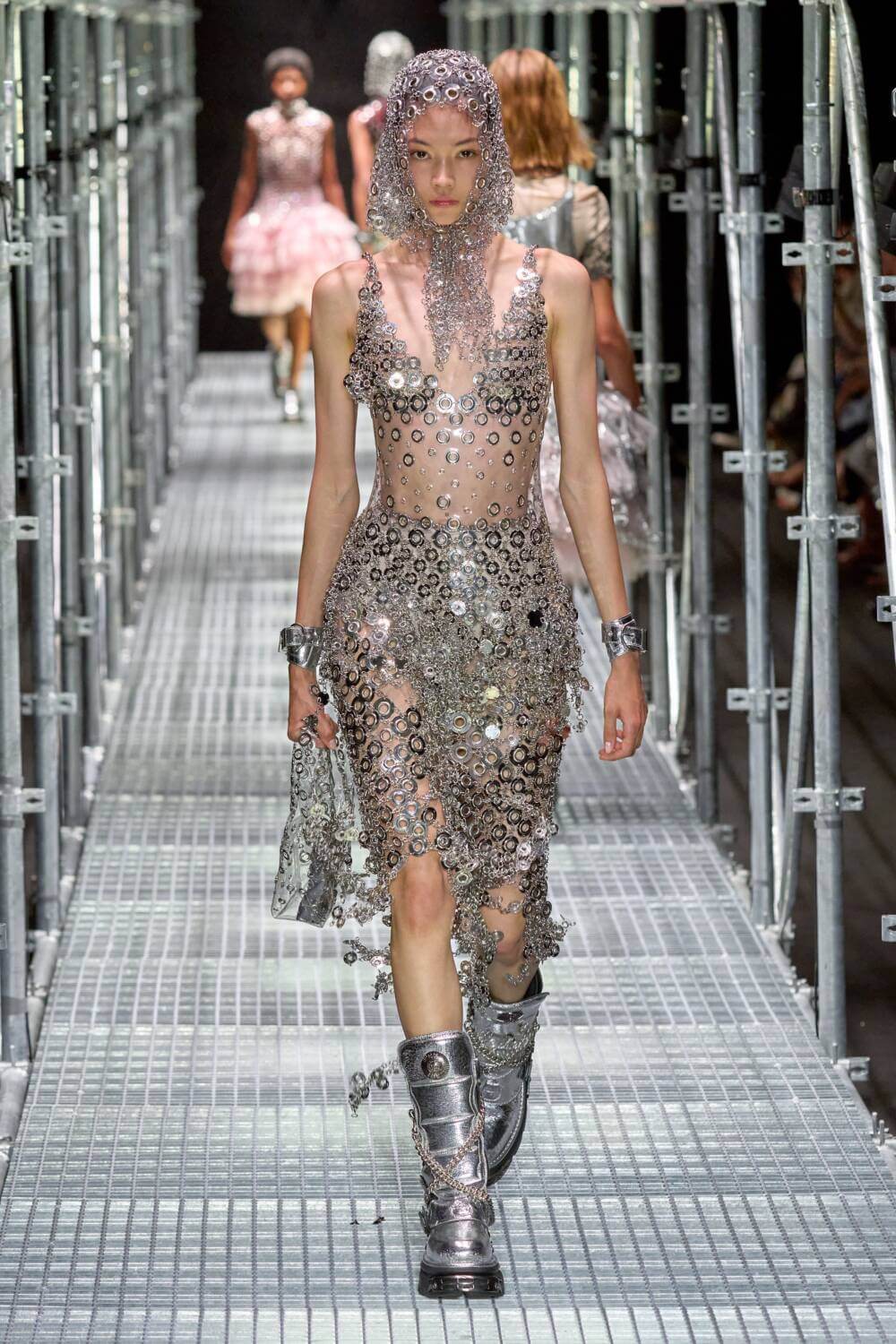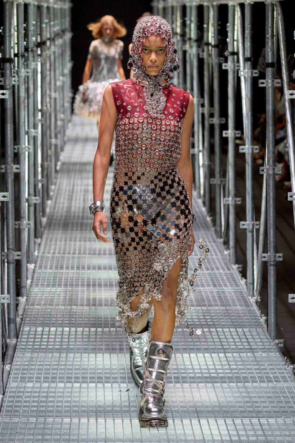 Over at Rabanne’s SS23 showcase, Julien Dossena preferred a day to ‘knight’ look, mining mediaeval cataphract dress for its space-age potential and in turn morphing metal mesh with sanguine latex to create glittering gowns akin to armour. Babushka-style headscarves were studded with metal grommets and draped over the sequin sheathed scale armour garb in a kind of new-age Rococo way.
