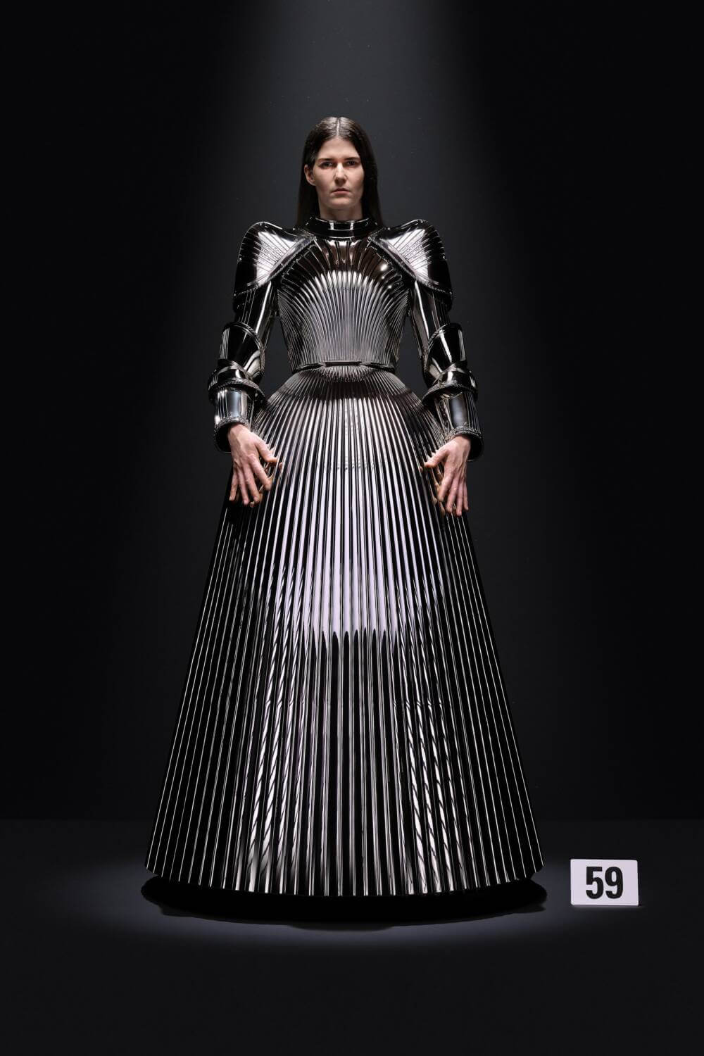 Balenciaga is no stranger to chevalier-inspired looks either. The maison’s AW21 collection replaced its typical big black boots with thigh-high replicas of Elizabethan armour. Fast-forward a few years and Eliza Douglas was closing its AW23 Couture show in a Jeanne d’Arc (patron saint of high fashion) chrome-laminated bell-skirted suit of plated armour. That impenetrable look of vambraces, pauldrons and breastplates was made of 3D-printed resin and galvanised metal – a feat which took 10 months to complete.