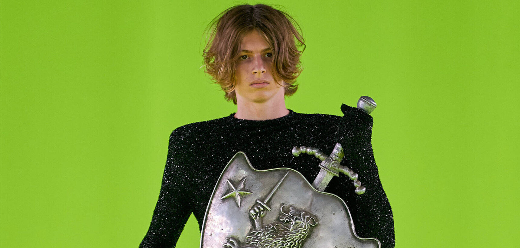 Inspired by the styles of 17th-century soldiers of the Swedish army during the reigns of Kings Charles XI and Charles XII of Sweden, 1680 specifically, Charles Jeffrey Loverboy’s SS24 menswear collection reimagined modern UK citizens, under the reign of King Charles III, as new Caroleans themselves. The Scottsman reimagine what the new King’s coronation might have looked like in a more Elysian parallel, “in which everyone gets to wear a crown”, combining traditional garb worn by Caroleans during the Restoration of 1660 with high-tech sportswear and warped graphics. The modern militia sported green garments adorned by graphic swords, crowns and hearts, with of course, a trusty sword and shield in hand. Other knights wore decorative armoured breastplates and sturdy gauntlets sculpted from upcycled Wedgwood jasperware. The battle continued with Jeffrey’s knights meeting their match with a ferocious lion-like look. Peering out from behind the fangs of a full dragon mask, the model held a vicious expression. His look was complemented by lion claw boots and gauntlets.