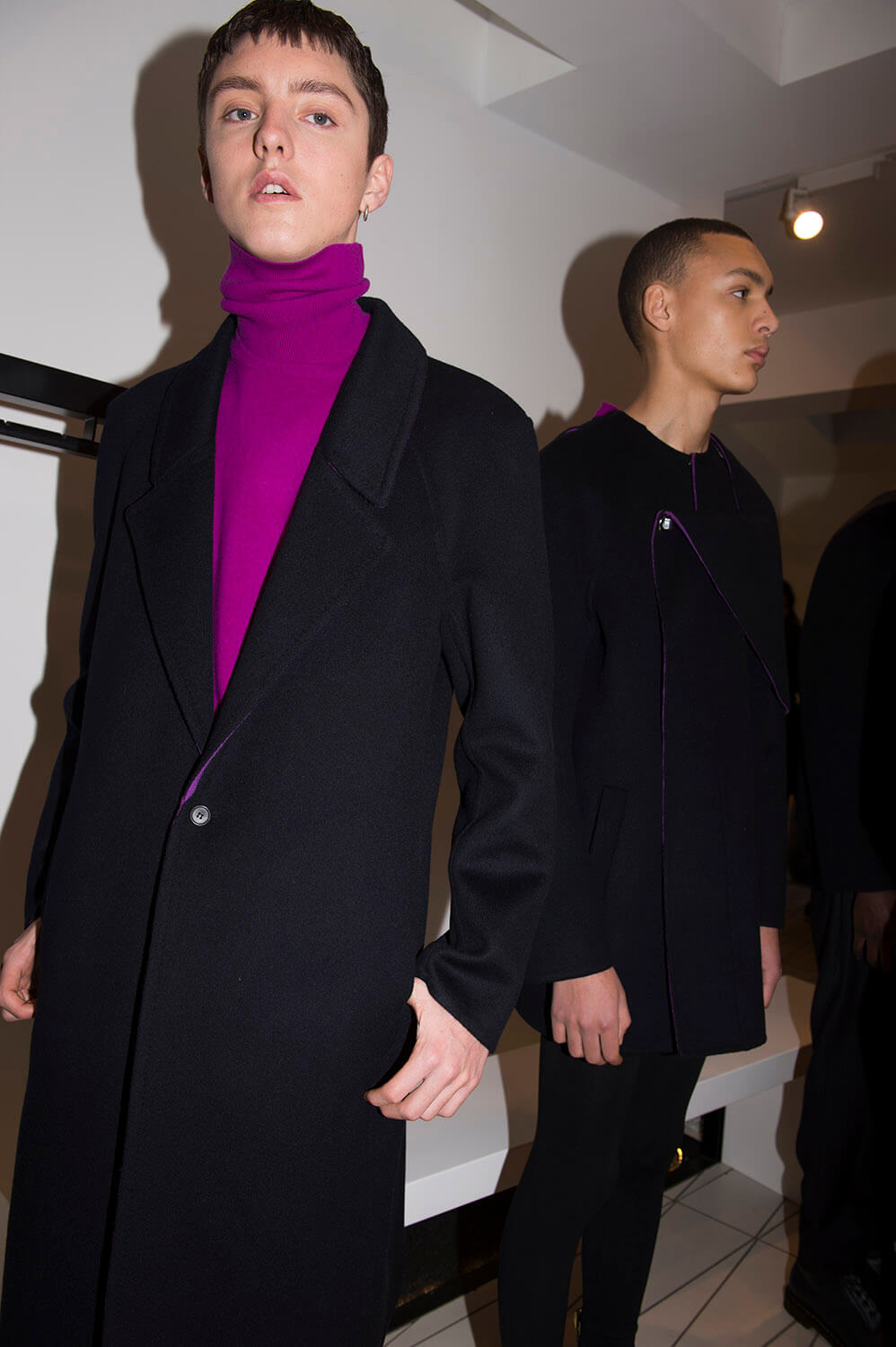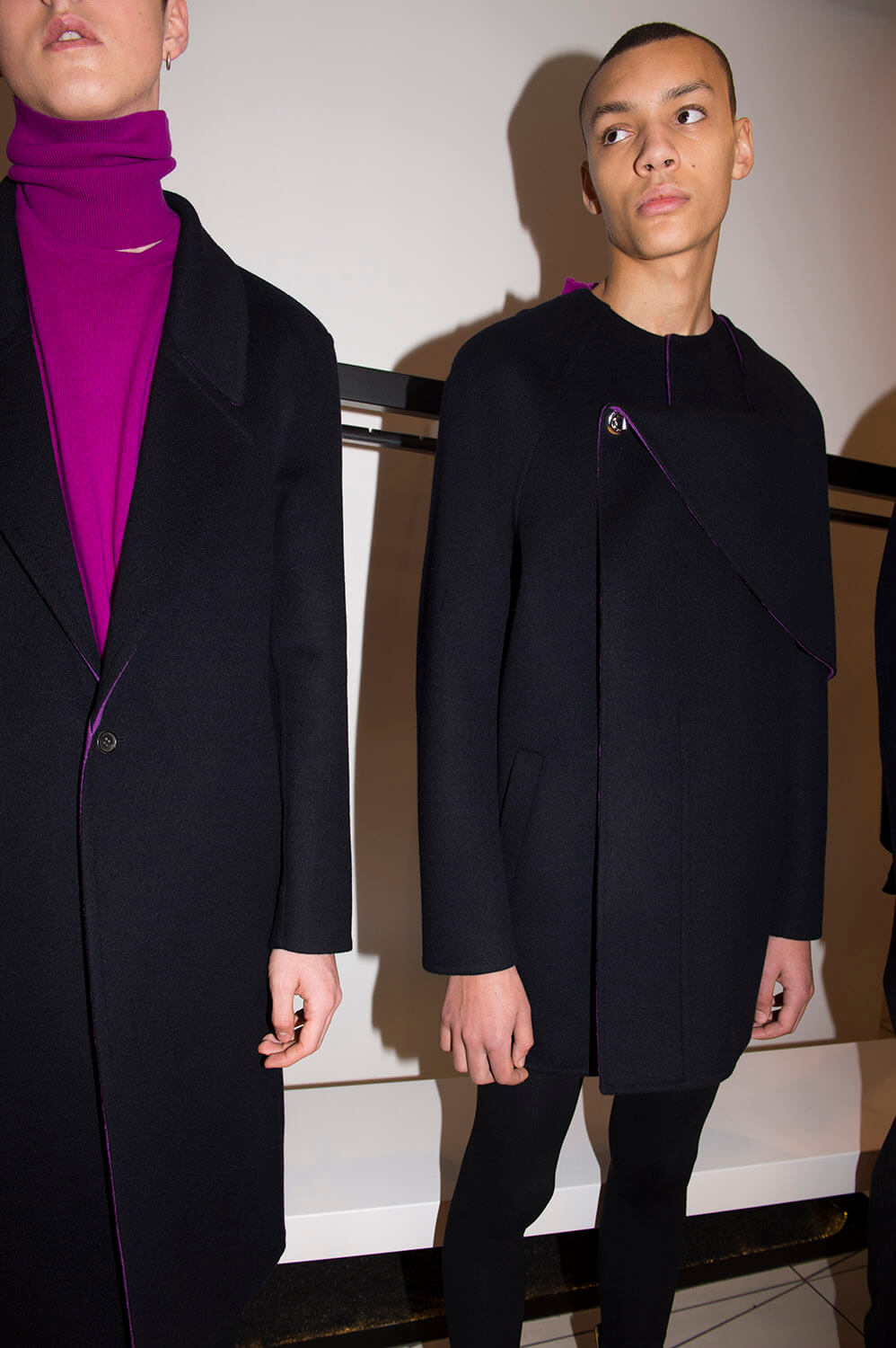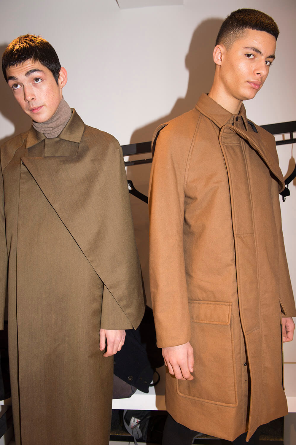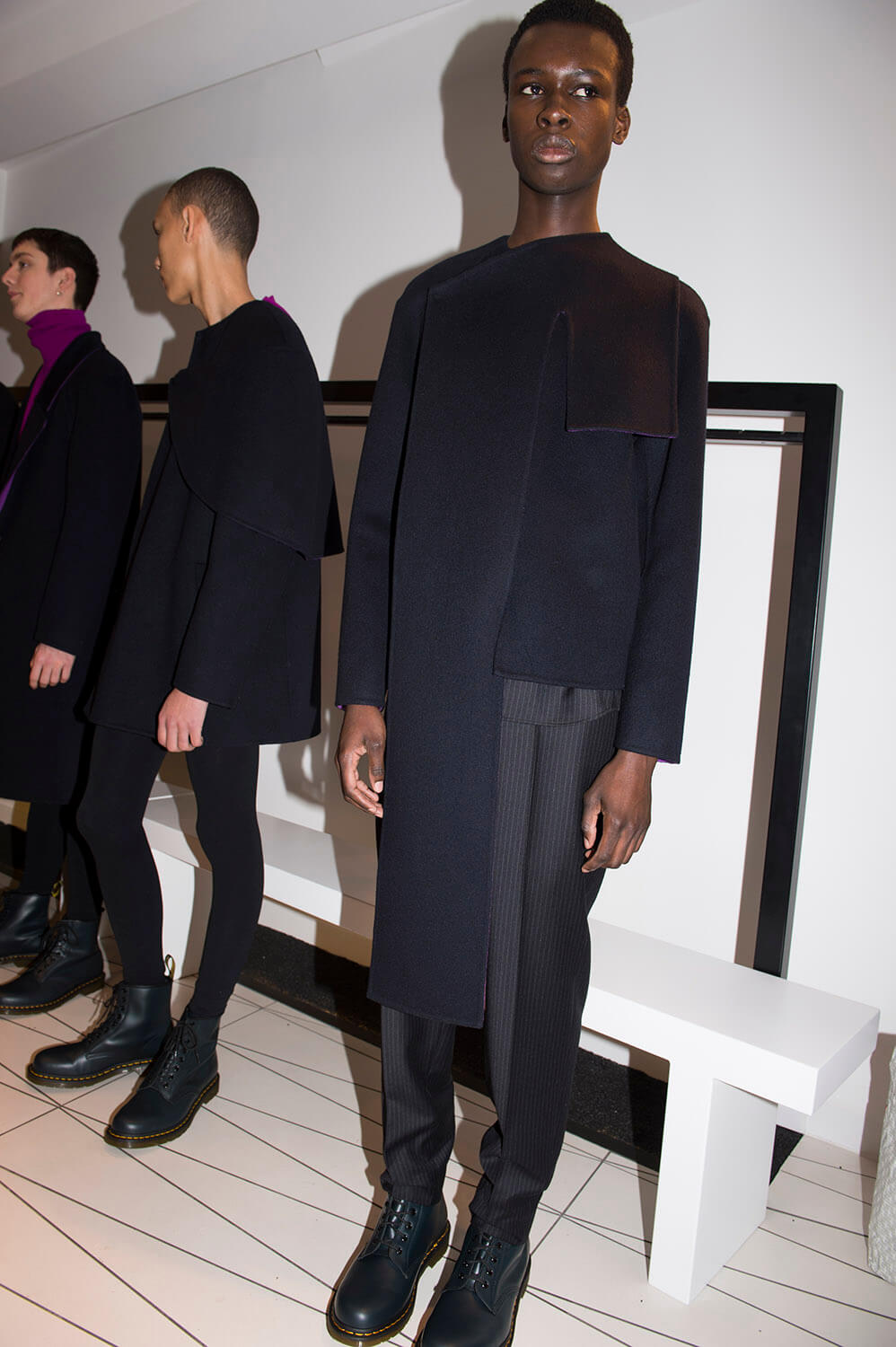 Hussein Chalayan shows his menswear in his Mayfair store. Which fits. These are clothes to buy, and clothes to wear. Which is not to say they are “normal” – Hussein is a cerebral designer, and does not deal in such. But they are clothes you at least recognise – menswear staples, tailoring, knitwear, the overcoat – transformed into something that you don’t quite. What that means is that even in the simplest of garments, each stitch and seam is considered – from the sweeping, twisted tailoring, that looped round the body, or was trimmed with foil, to the subtler details – like a perfect knit jumper, slashed at the seam of its polo-neck, or padded jackets that folded down at the lapels. The sort of clothing whose simplicity hides. It’s a clever thing to sell simplicity – but Hussein is a clever man, and these are clever clothes. Ones that warrant a second look – or, simply, a return visit to that store.