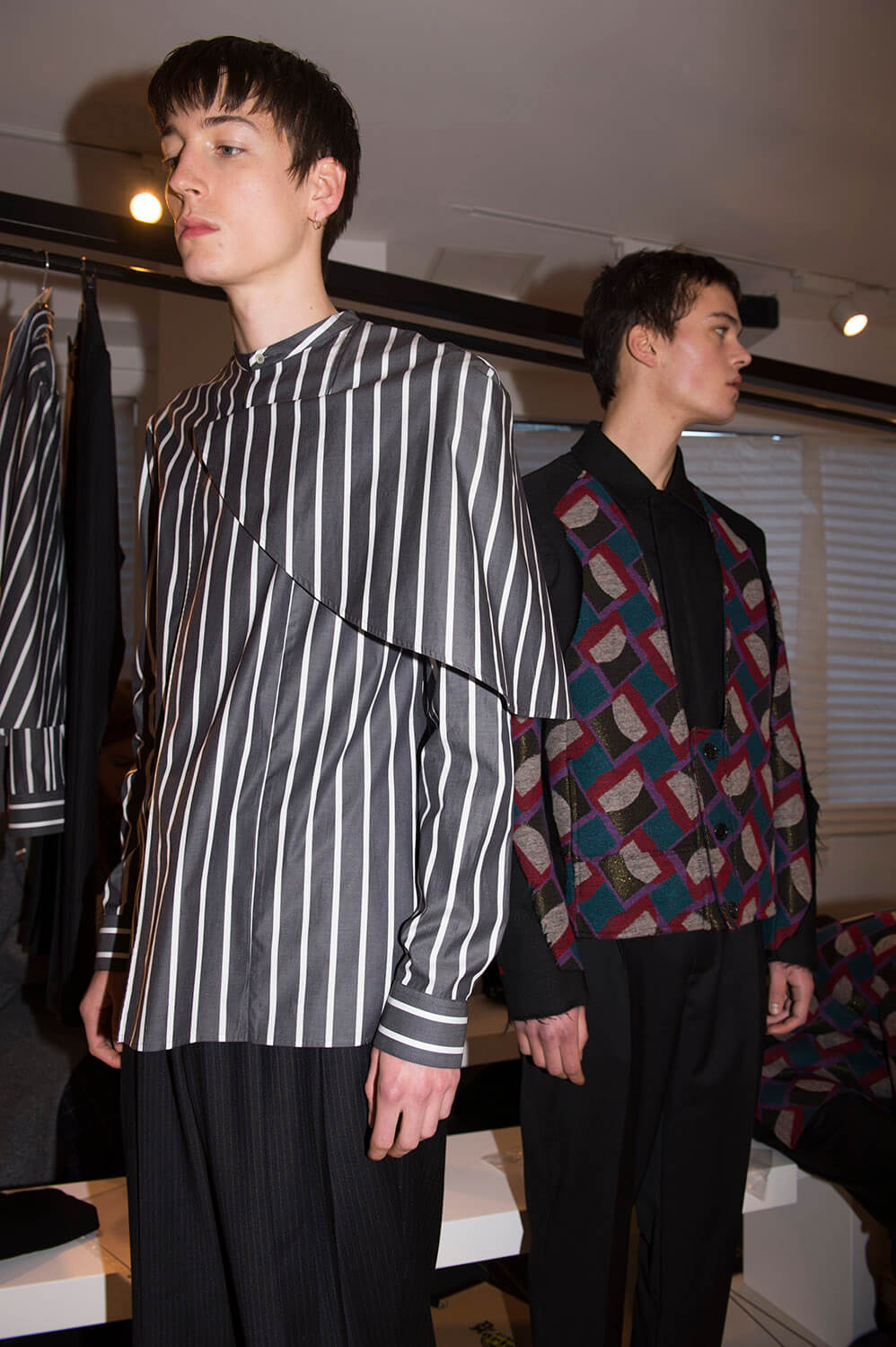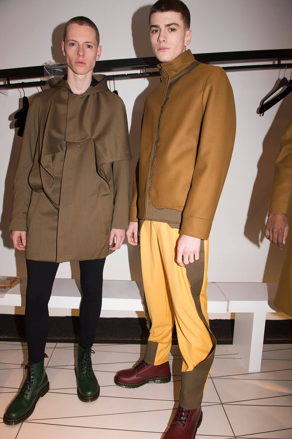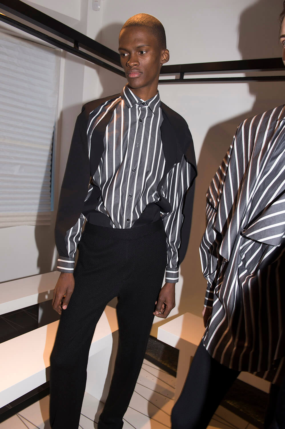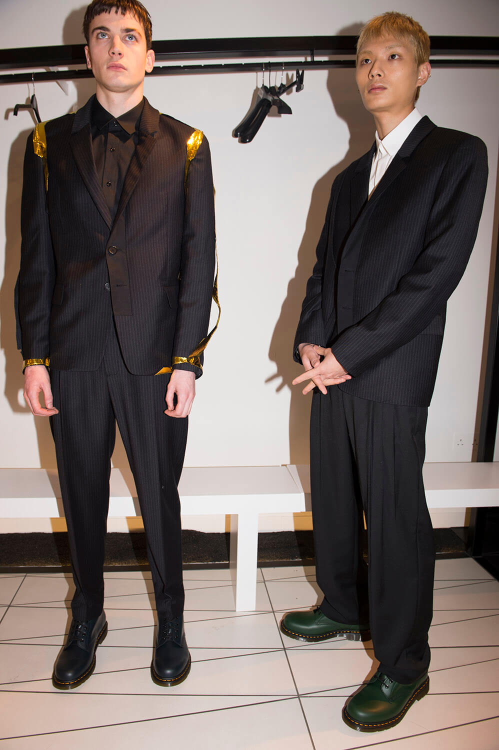 Hussein Chalayan shows his menswear in his Mayfair store. Which fits. These are clothes to buy, and clothes to wear. Which is not to say they are “normal” – Hussein is a cerebral designer, and does not deal in such. But they are clothes you at least recognise – menswear staples, tailoring, knitwear, the overcoat – transformed into something that you don’t quite. What that means is that even in the simplest of garments, each stitch and seam is considered – from the sweeping, twisted tailoring, that looped round the body, or was trimmed with foil, to the subtler details – like a perfect knit jumper, slashed at the seam of its polo-neck, or padded jackets that folded down at the lapels. The sort of clothing whose simplicity hides. It’s a clever thing to sell simplicity – but Hussein is a clever man, and these are clever clothes. Ones that warrant a second look – or, simply, a return visit to that store.