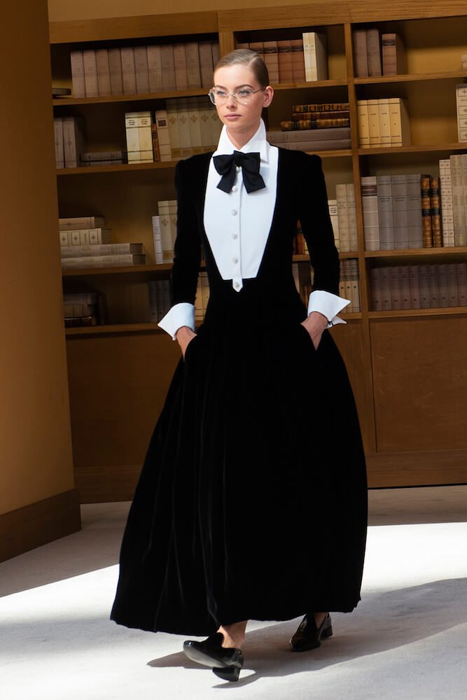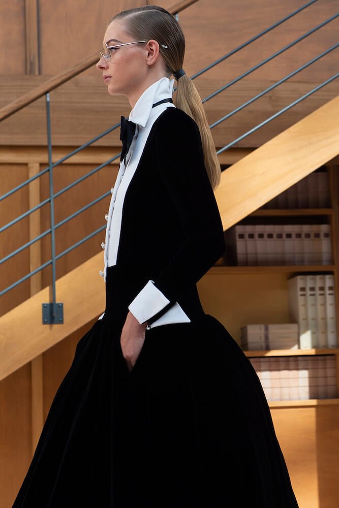A new era crystallised at the house of Chanel with the first couture show by Virginie Viard inside the Grand Palais, she built a triple story, circular library stacked with encyclopaedic volumes. It formed the perfect backdrop for a calm and cerebral couture collection. The opening looks – lean coat dresses, wide tweed trousers and sporty skirt suits – were carefully controlled studies in impeccable tailoring. This was a vision of exquisitely rendered modern elegance: controlled, restrained and seductive in its self-assurance.