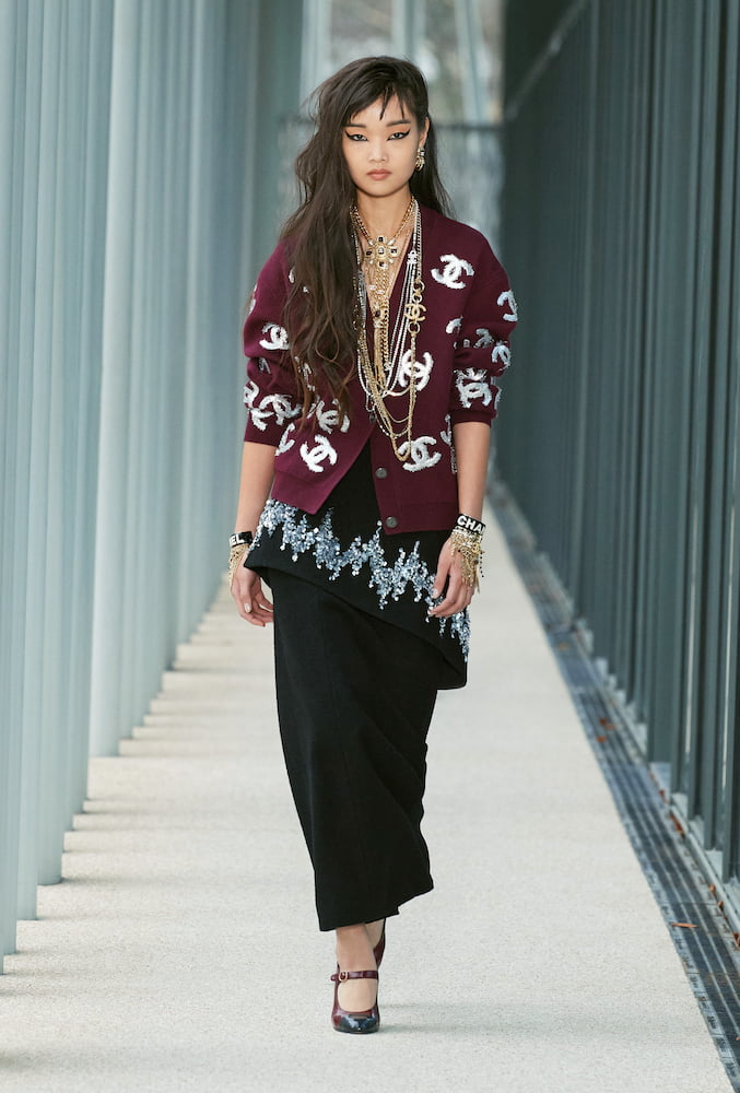 “Very metropolitan yet sophisticated,” she said of the tweed jackets with sweatshirt sleeves, ‘Chanel’ rendered in graffiti-style embroidery in coloured beads by Lesage. Heritage tweeds were worn with chunky knit bandeaus, and double-C’s, sprinkled liberally over cardigans and joggers, will appeal to the logo-obsessed new generation. Frill-hemmed, flared jeans, knitted onesies and drop-waisted skirts brought an easy-to-wear contemporary touch to what was a highly crafted look.