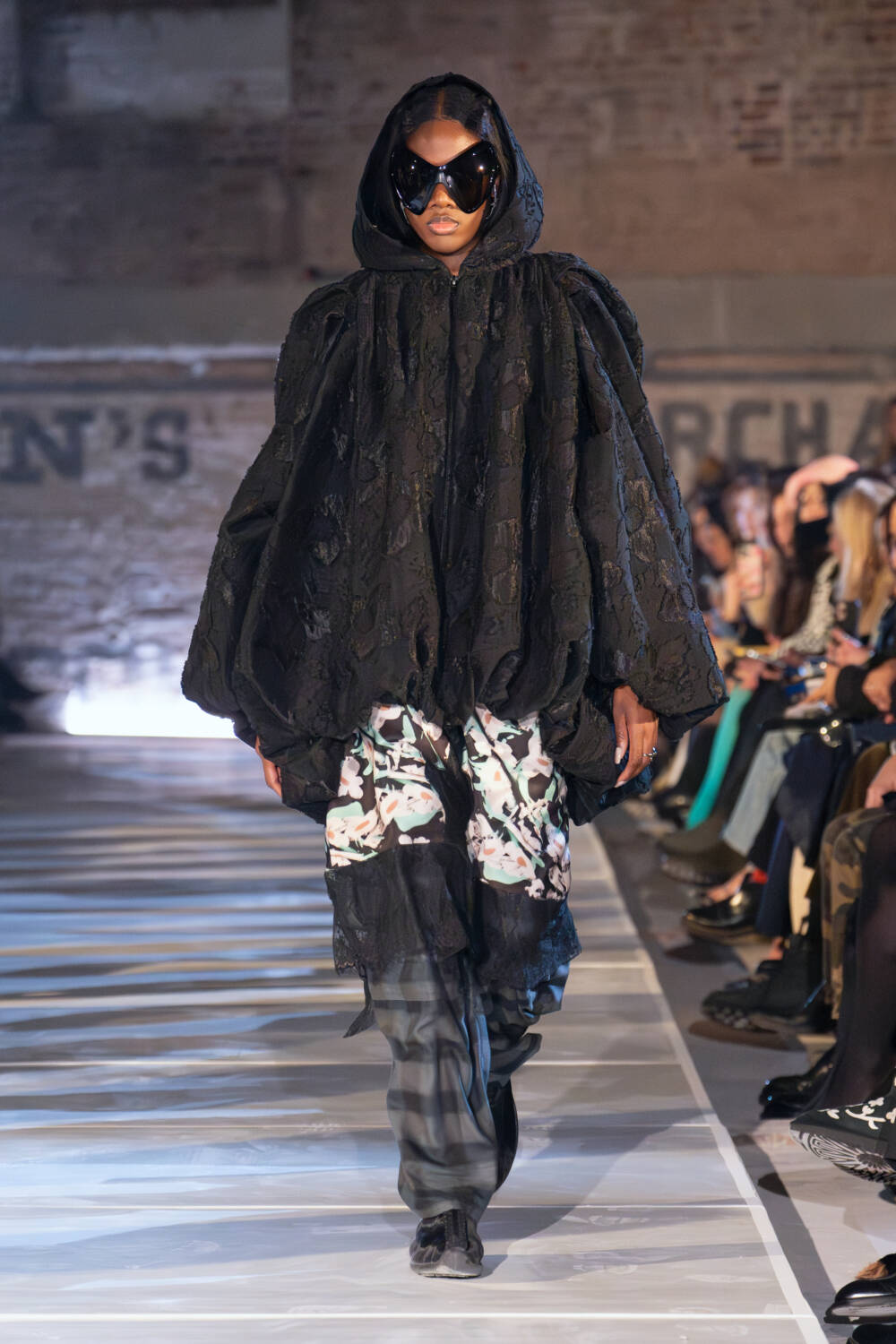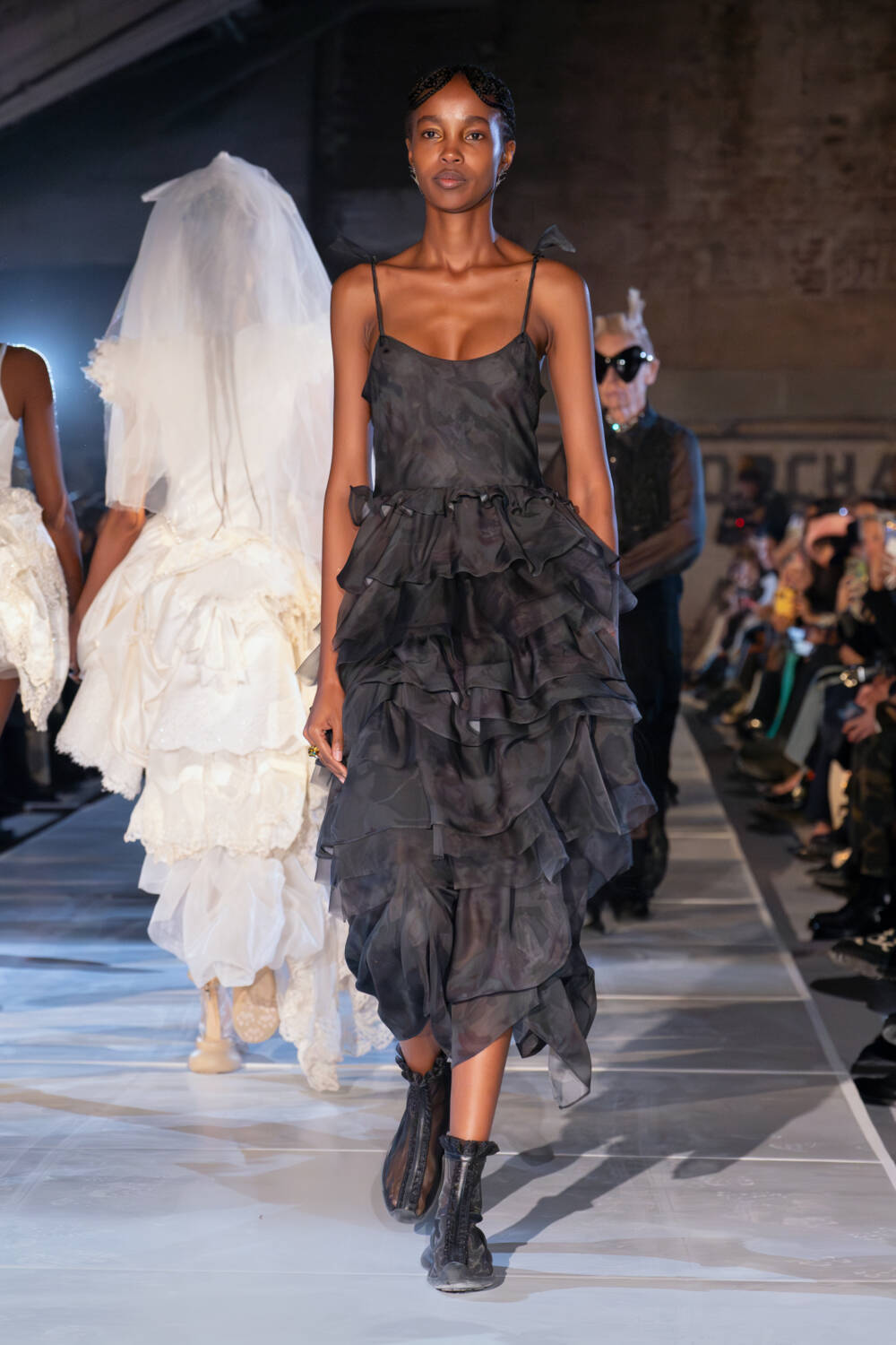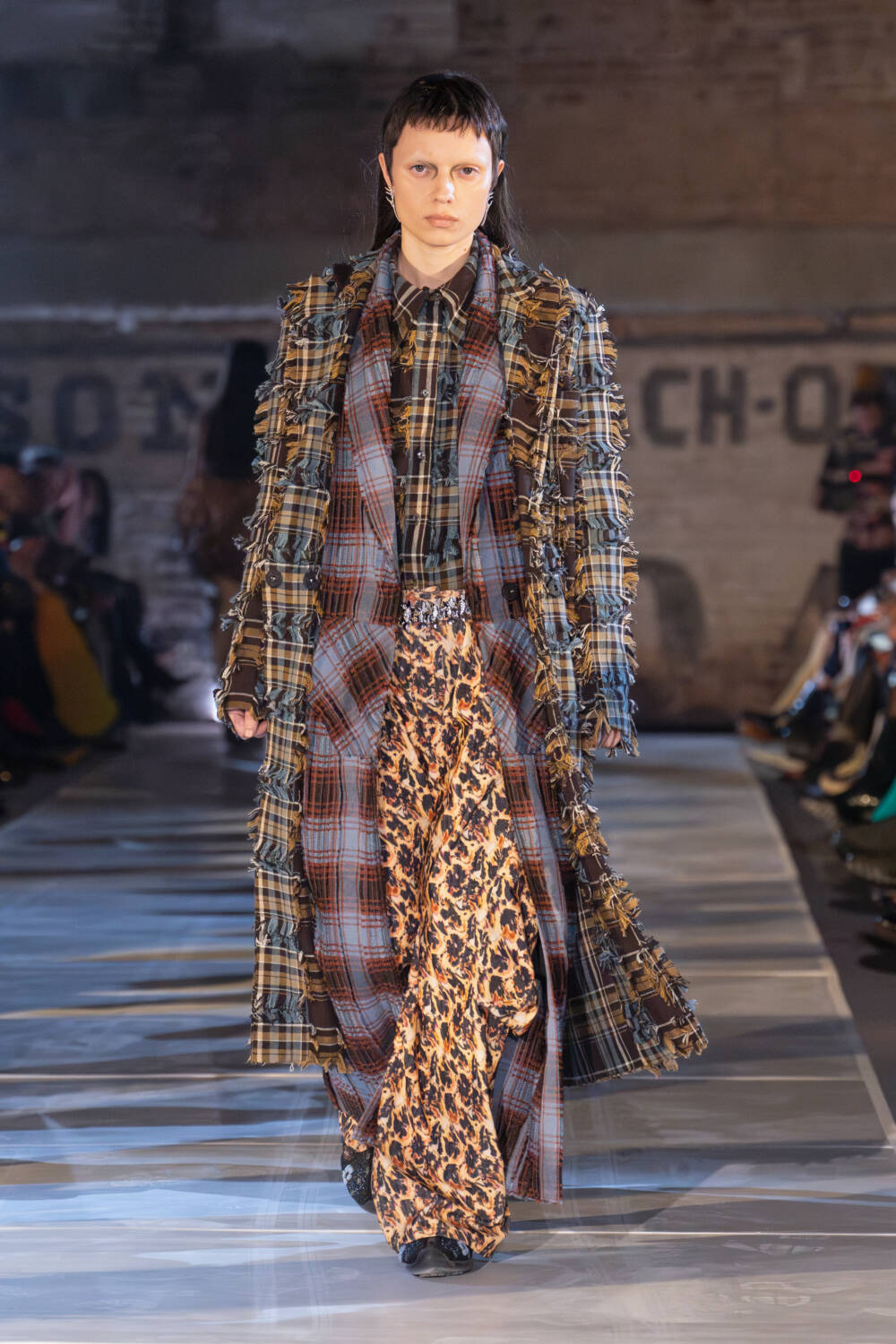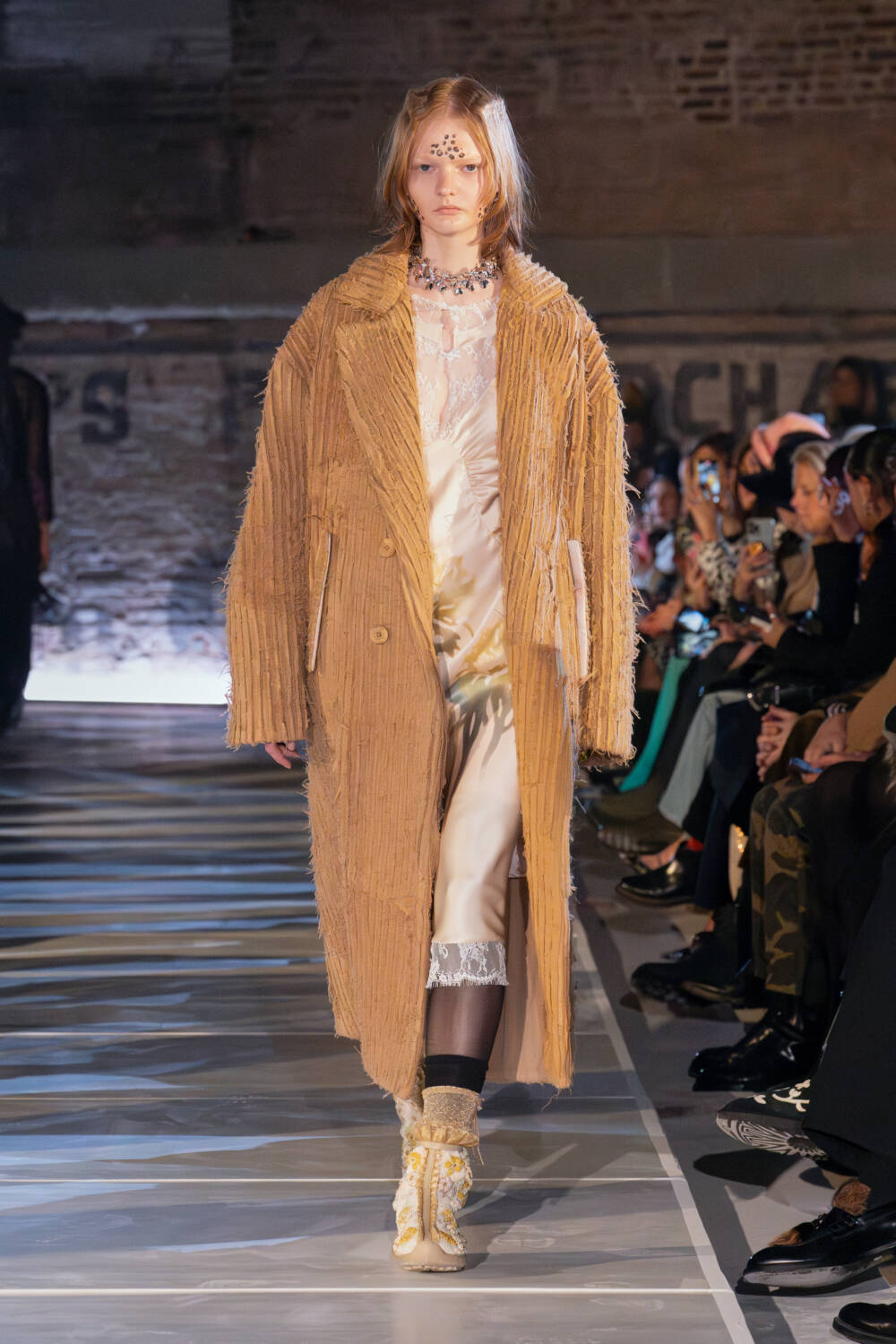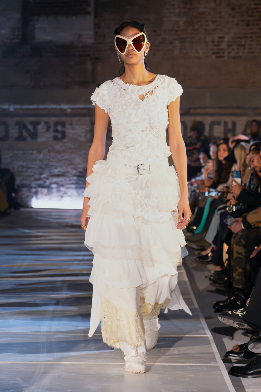 As for the clothes, the idea of taking what you need and letting go of what doesn’t was also evident. The Collina Strada team found themselves in New Jersey thrift stores to source materials. Men’s wool coats were stripped and rebuilt into softer silhouettes. Gauzy ruched dresses, a brand signature, floated down in muted tones as well as in black. Taymour also thrifted three wedding dresses, transforming them into her vision for bridal, complete with a dramatic kiss between two brides in the middle of the runway to cheers from the crowd. Everything felt seasonless, fitting for a new climate where one day it’s completely possible to be in a sheer skirt while another might call for warmer fare like a giant striped sweater with matching scarf.
