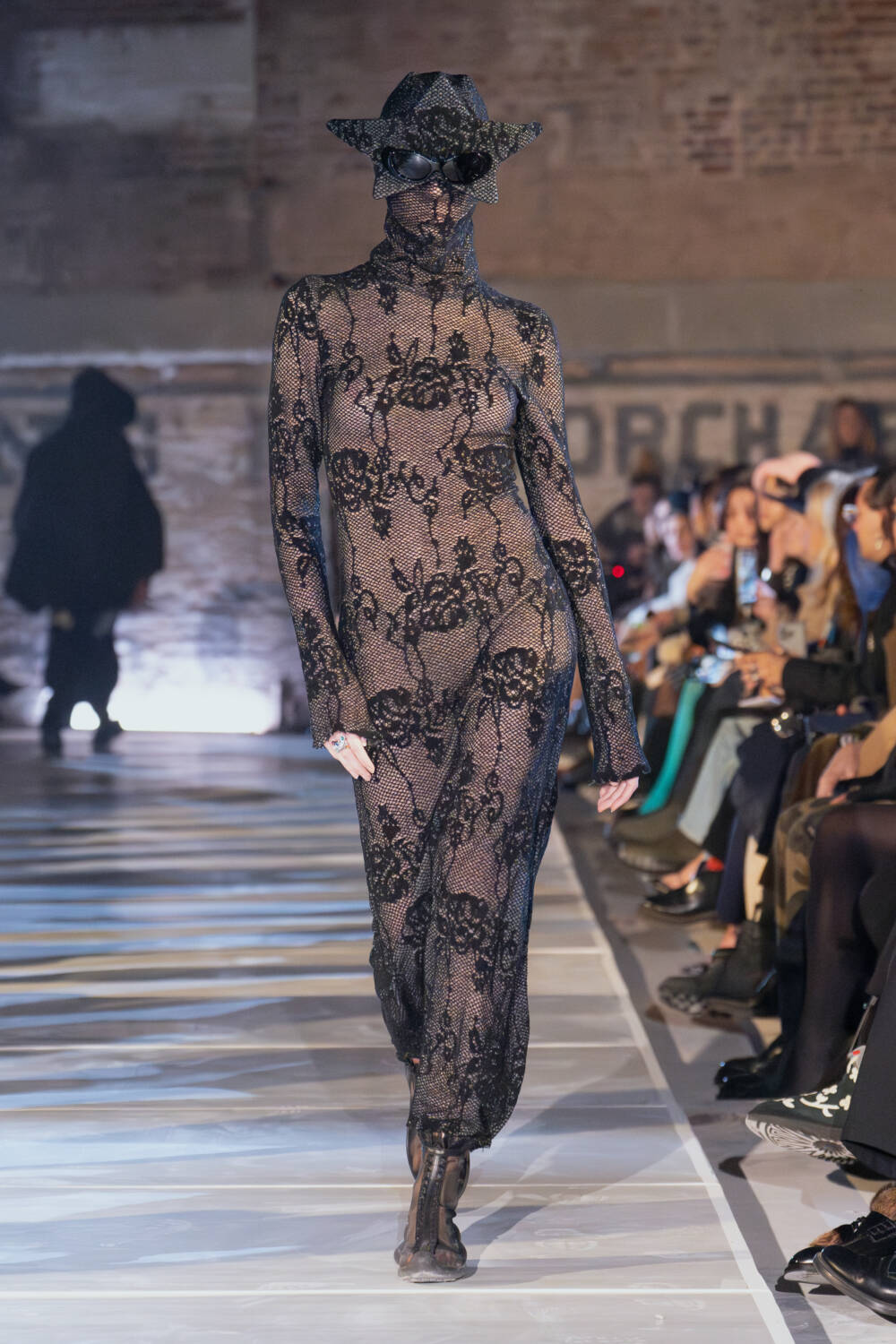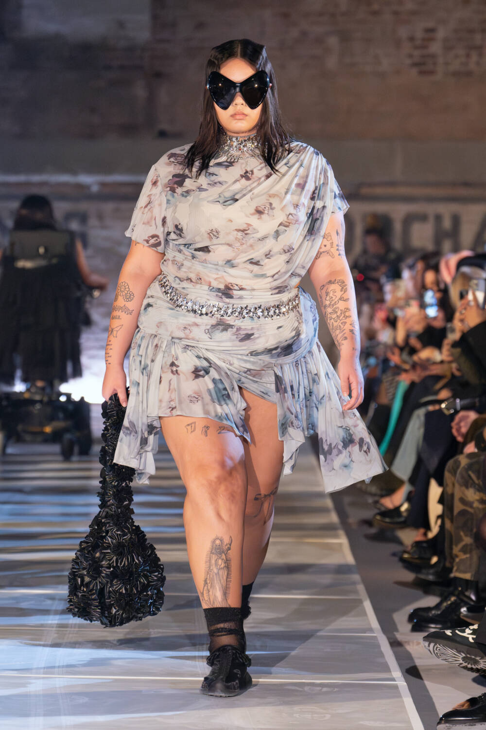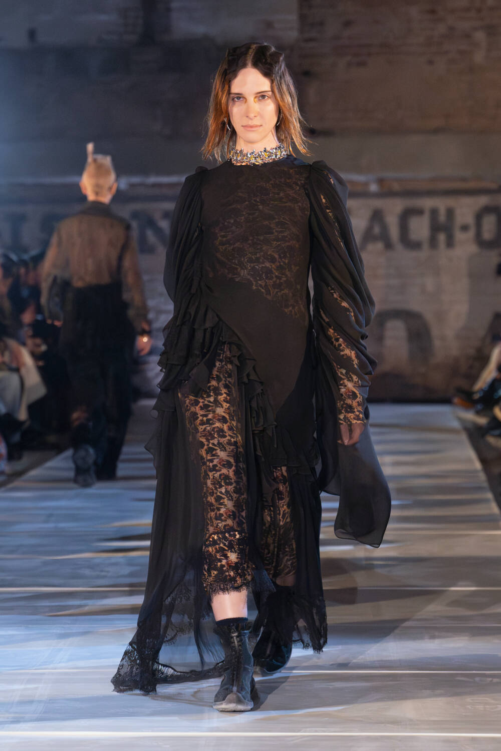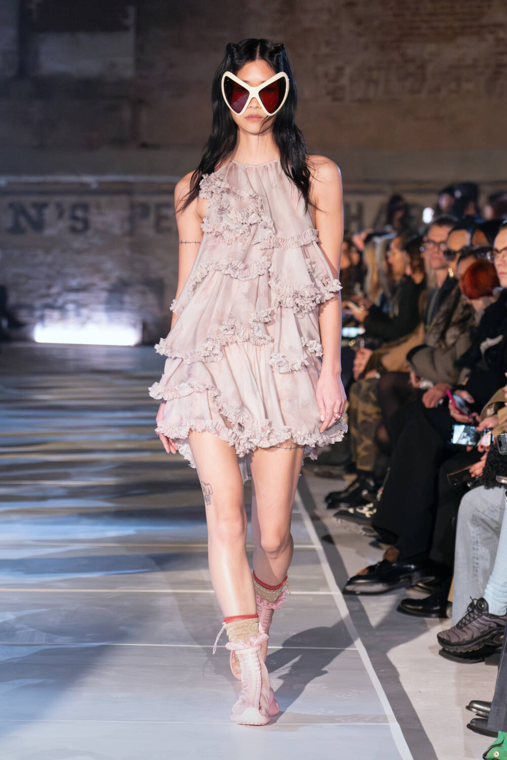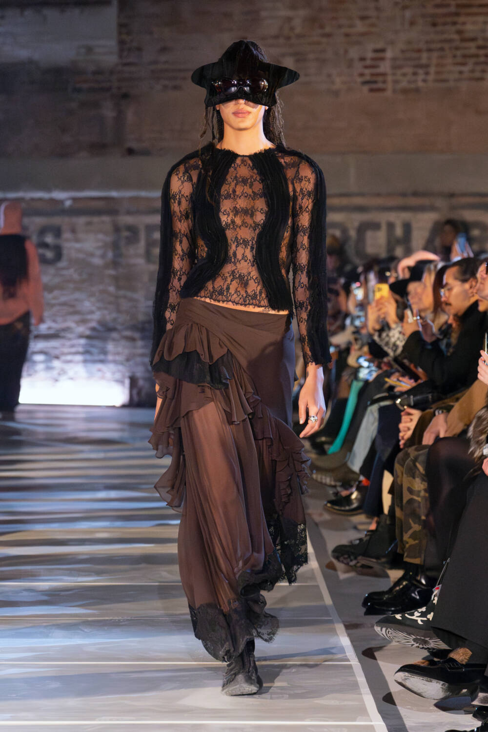 As for the clothes, the idea of taking what you need and letting go of what doesn’t was also evident. The Collina Strada team found themselves in New Jersey thrift stores to source materials. Men’s wool coats were stripped and rebuilt into softer silhouettes. Gauzy ruched dresses, a brand signature, floated down in muted tones as well as in black. Taymour also thrifted three wedding dresses, transforming them into her vision for bridal, complete with a dramatic kiss between two brides in the middle of the runway to cheers from the crowd. Everything felt seasonless, fitting for a new climate where one day it’s completely possible to be in a sheer skirt while another might call for warmer fare like a giant striped sweater with matching scarf.