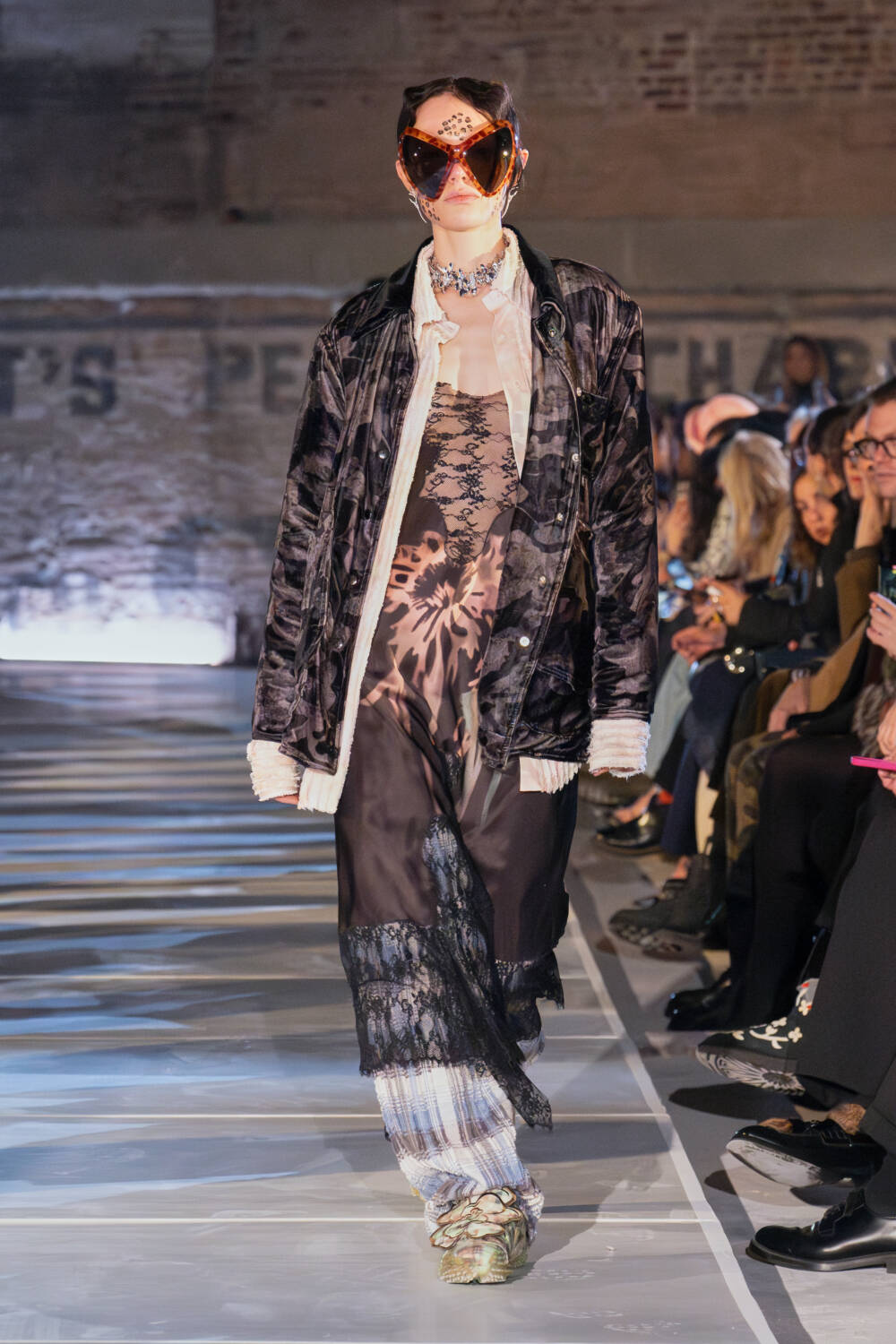 The idea of protection and armour also factored into the clothes and accessories. Giant star shaped sunglasses, balaclavas, hoods and other face-obscuring garments served to disguise in a world that feels less kind. Per the show notes, it’s intended for “hiding the tears, turning them into something else. Letting our freak flag fly, while knowing that sometimes stealth is survival.” While the upper half of the body might be focused on shielding from harm, the bottom half took a lighter tone. The brand worked with both Puma on iterations of their Mostro sneakers, as well as with Fctry Lab, an independent footwear label. Colourful and playful, it was exactly the type of contradiction that the Collina Strada customer revels in embodying.