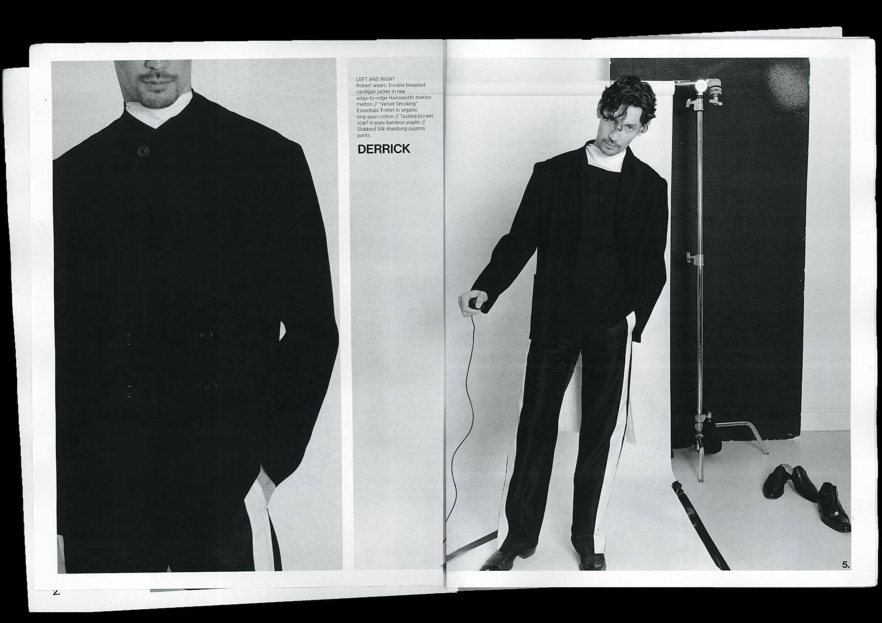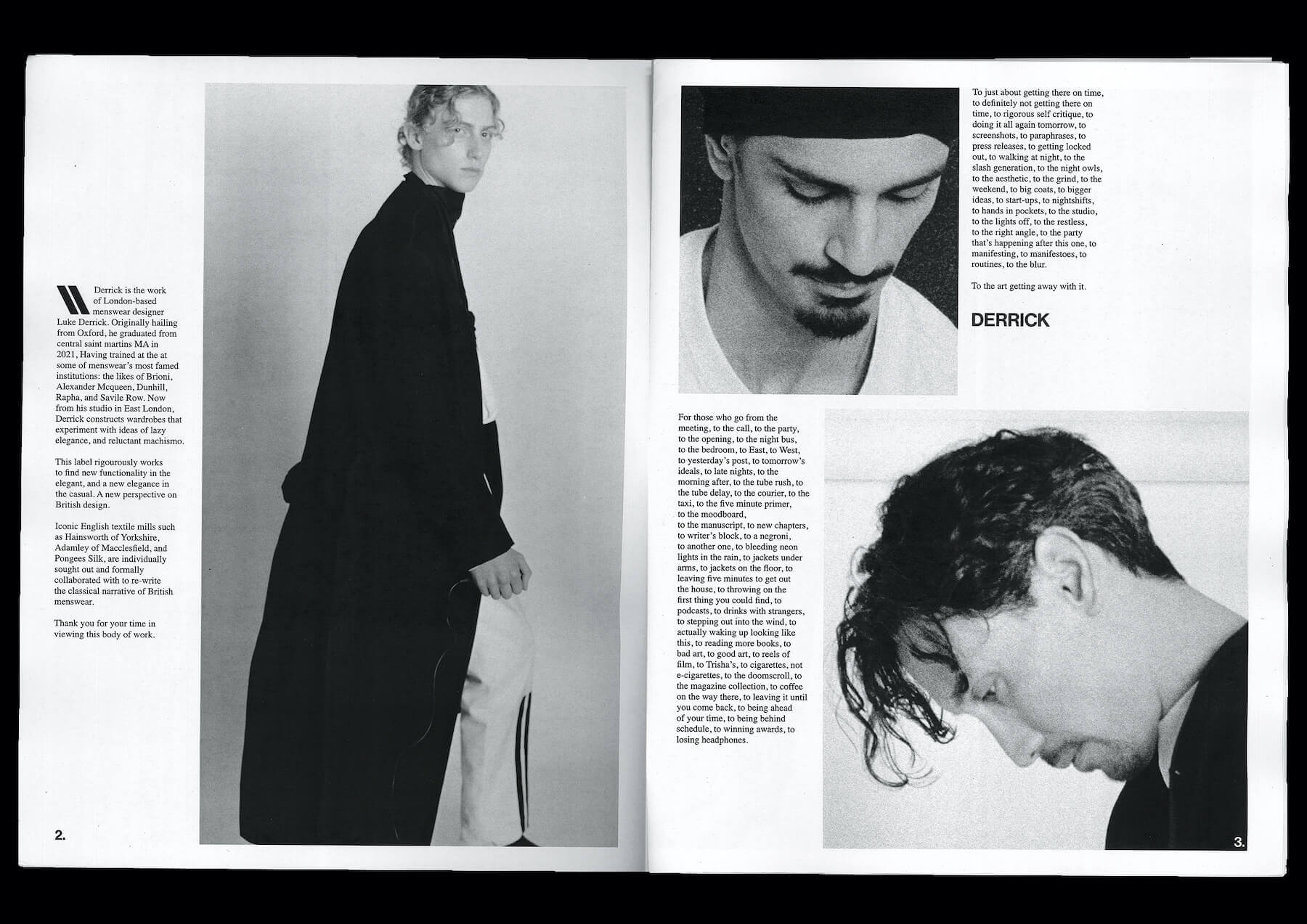 As for the Fashion Week film, well that was unscripted. It was simply a black and white recording of models shooting themselves within a single biographical space with video cameras running consistently through the shoot. Over the candid footage Derrick’s voice reverberates softly like ASMR. It’s a recording of a late night message he left a colleague over the phone about a month before the show. He speaks about the making of the film and its authorless identity; positioned to “cut the bullshit”, as he says in the message, just as the clothes aim to, and to be “about the man first”, with the fashion coming in second.