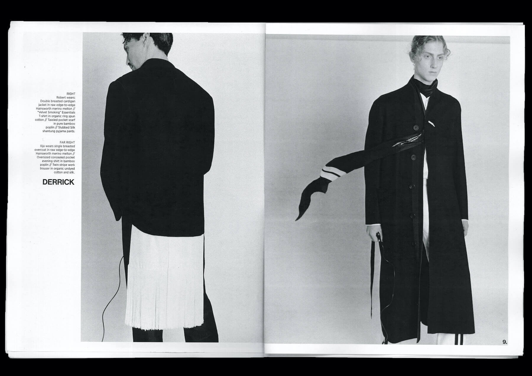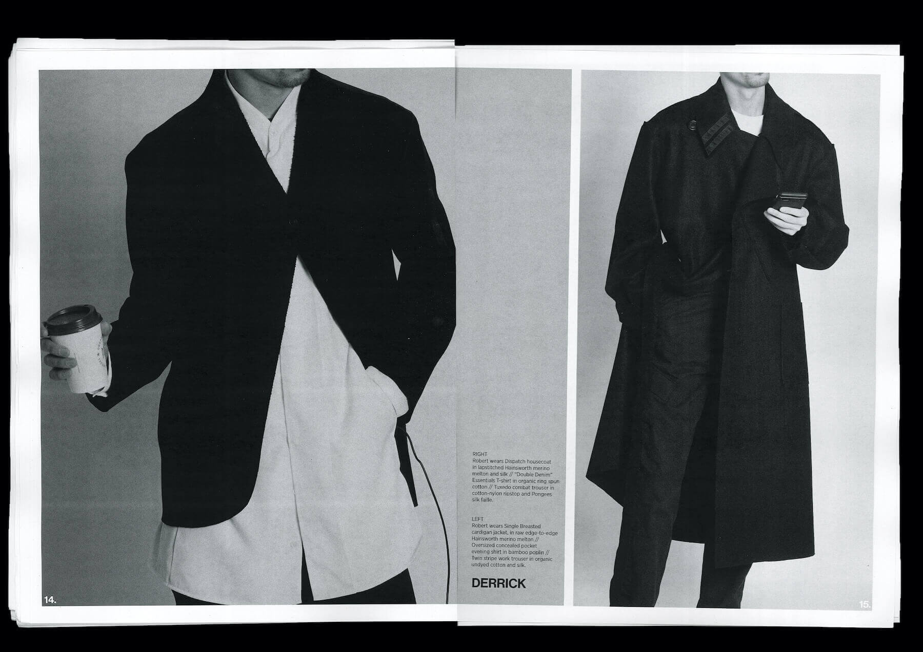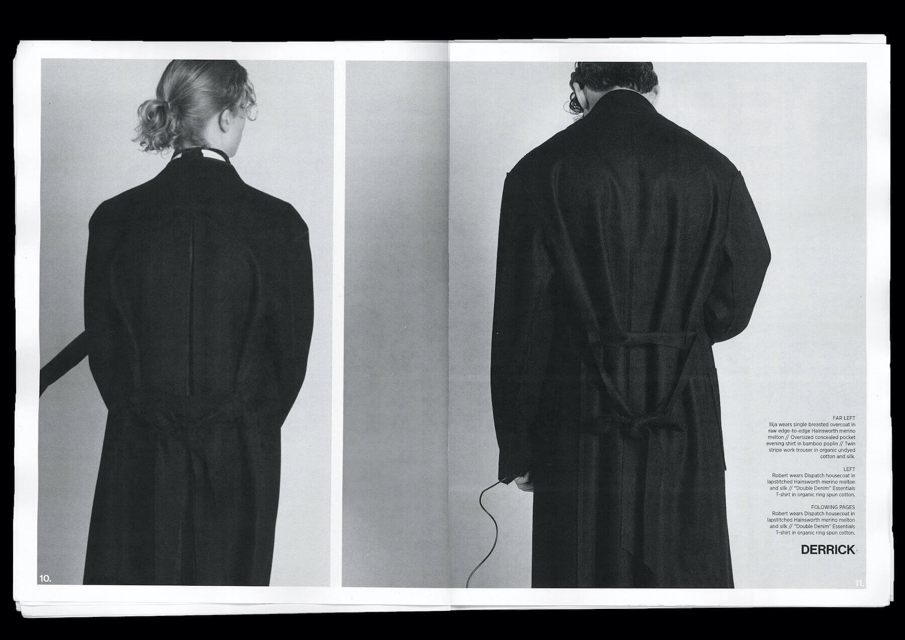 So, for his debut LFW collection, Derrick created a kind of capsule wardrobe of staple pieces that embody elegant utility. “Nothing [in the range] ever really needs an iron; it can all just be thrown on and has this sort of lazy man solution aesthetic to it”. A quietly reinterpreted Second World War coat is stripped down with raw edges and a lightweight, cinched-in silhouette so it appears akin to a dressing gown. “I take outerwear and make it loungewear,” Derrick explains. He’s wearing one of the subversive coats as he gives us an intimate look into his creative processes, and with a chuckle he says, “I spilled a cup of coffee over this an hour ago; it’s just sort of indestructible.”