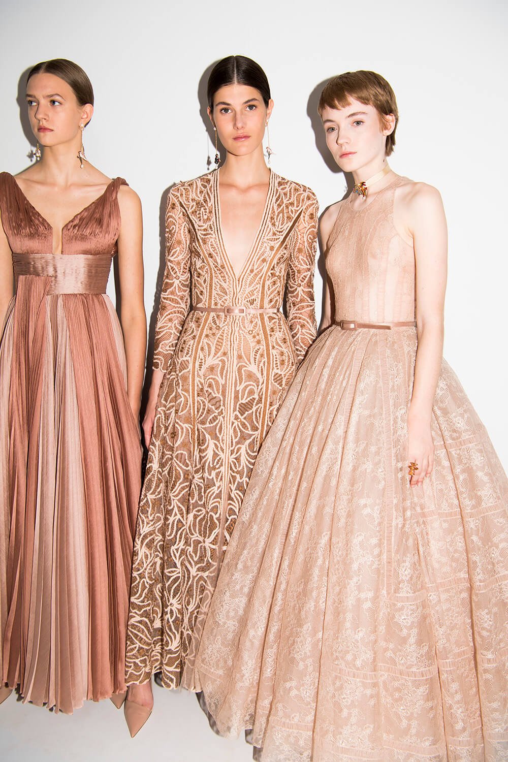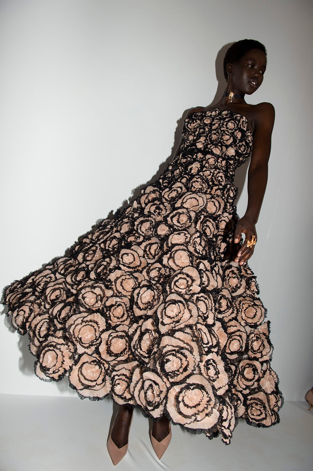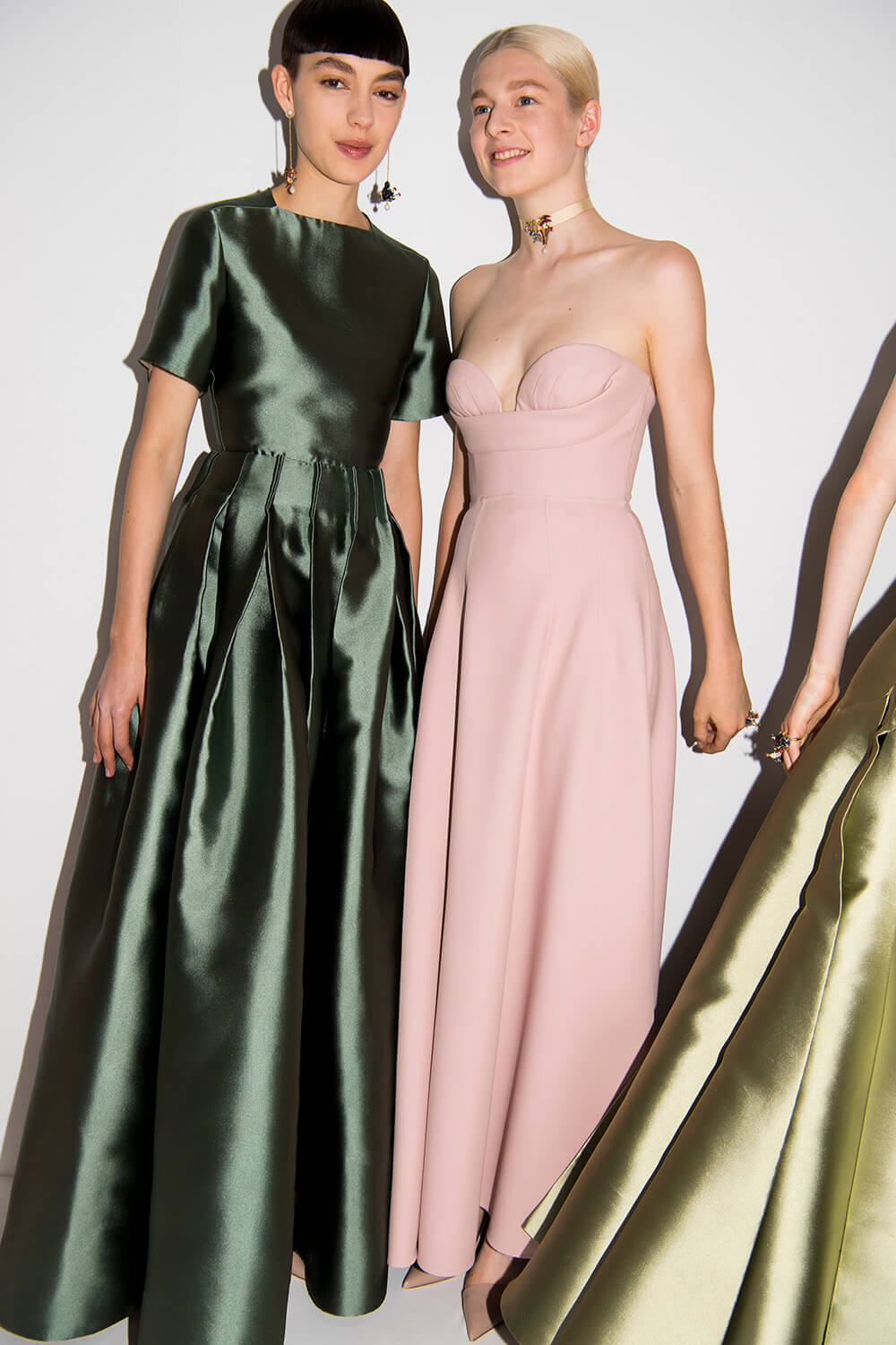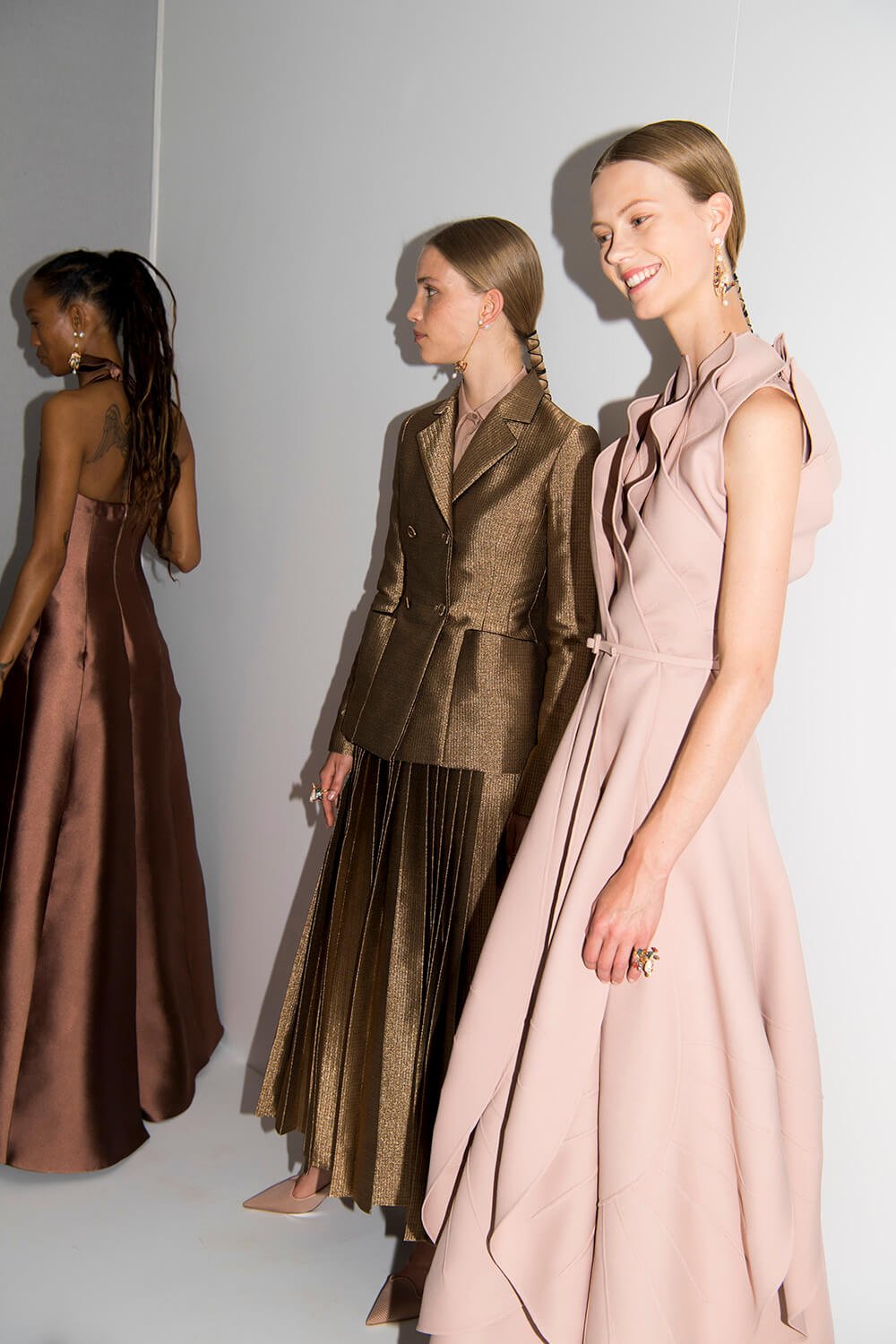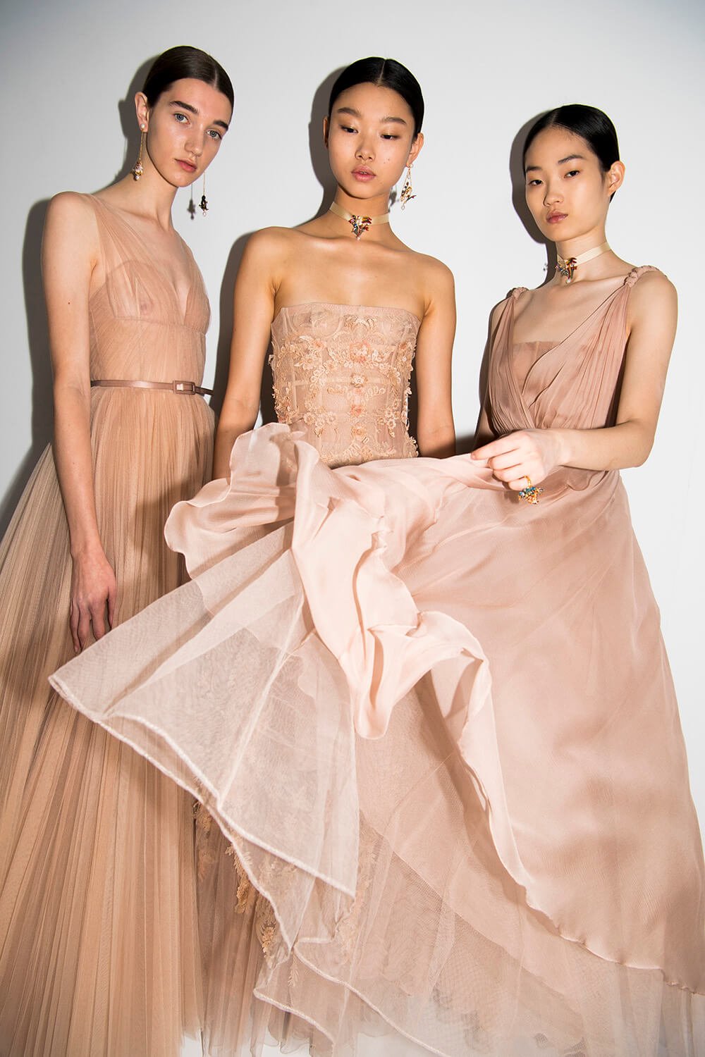 Maria Grazia Chiuri likes to ask questions. When she started at the house, her big one was how to handle the Dior legacy? “We have to speak about femininity, but what does that mean today?” In answer, her quest has been to put a youthful, feminist spin on the house’s feminine legacy. If Mr Dior has his ‘flower Women’ (as he referred to his muses) in the 1950’s she has her global army of empowered young women, looking for a vision of femininity that speaks to them. And whilst there are no slogan T-shirts at couture, (Chiuri saves that for Ready To Wear), there are still questions to answer. Namely, how to respect the age old institution of haute couture whilst making it feel modern and relevant? Chiuri went back the craft – the true integrity of couture – to find an answer. She lined the walls of her vast tented show space with toiles – the ghostly cotton prototypes of couture designs. With the atelier at the heart of it, she presented a collection of maestro cuts and haute techniques. The signature bar jacket came with pleated sleeves that gave the hourglass silhouette a dramatic flourish. Fine georgette was gathered into gracious floor sweeping gowns that had a balletic grace. The colours – honeyed neutrals – and the silhouettes were deceptively simple but the work it takes to get fabric to fall and move with such lissome lightness lies in the skills of the Dior atelier. There were typical couture flourishes. A bell shaped gown was covered top-to-bottom in intricate floral embroidery; one dress seamlessly transitioned from delicate chiffon at the top to a skirt of luscious feathers below; a coat depicting an abstracted woodland scene was made of hundreds of patch-worked pieces painstakingly stitched together. But the pieces that left the most lasting impression were unadorned. The show ended with six majestic ballgowns in heavy satin. Lean and minimal, they brought the air of modernity that Chiuri strived for. Take away the beads, flounces and frills and you get to the soul of couture. The purity of the silhouette, the exactness of the cut and the wonder of the craft were plain to see.