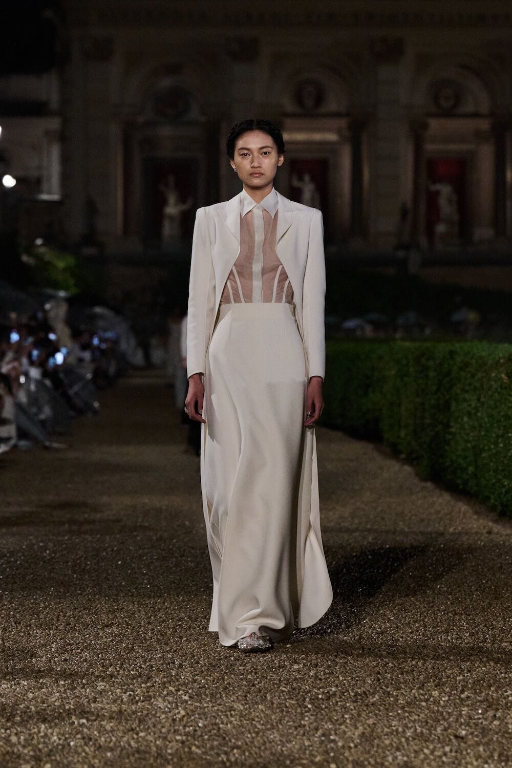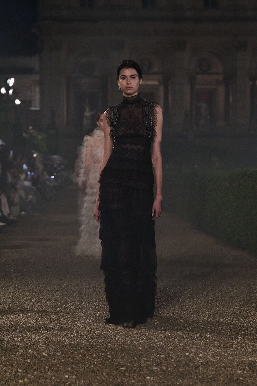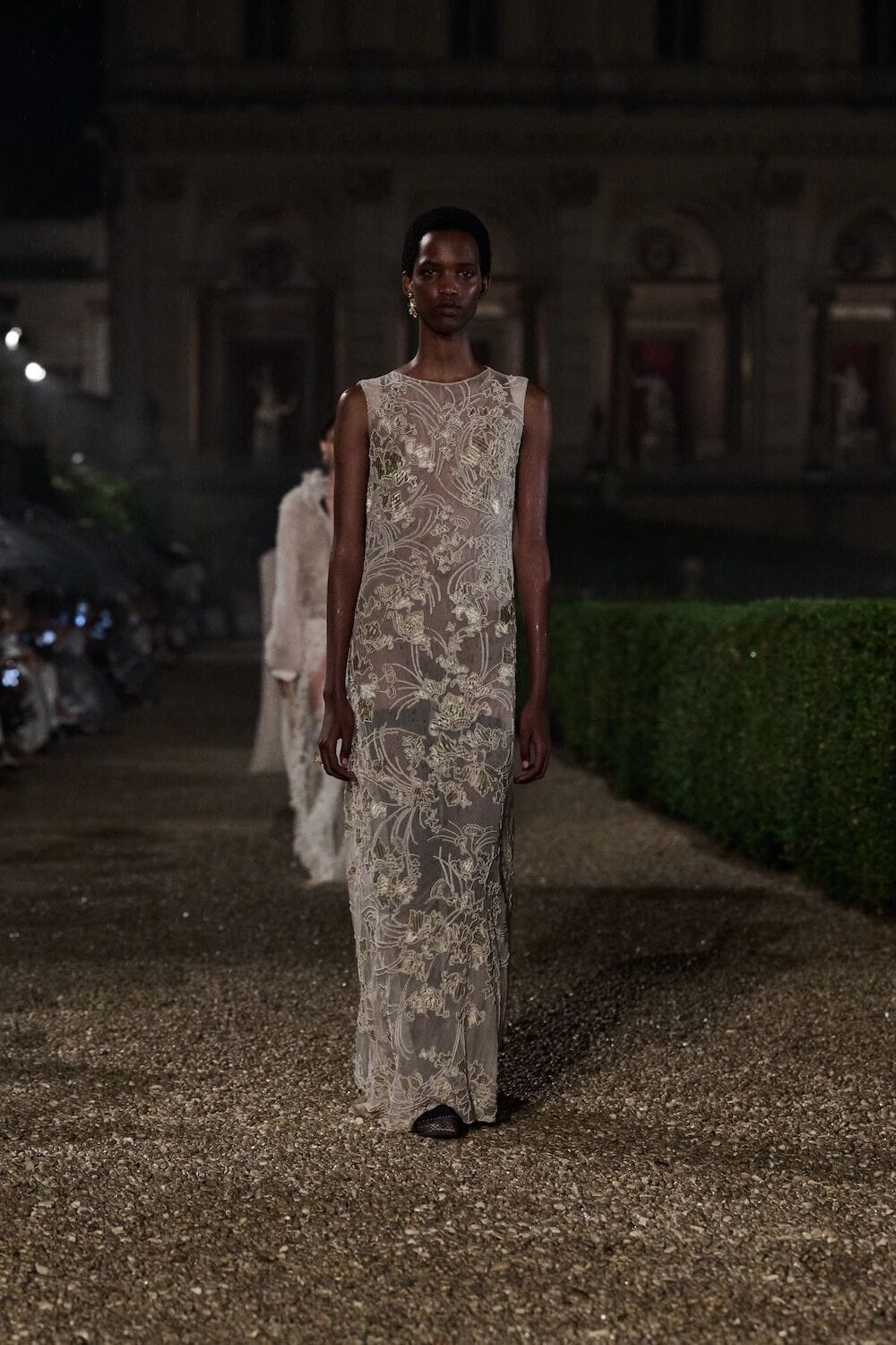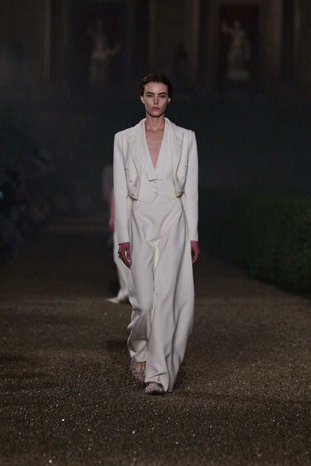 As the sun set, a mist rolled over the Villa’s famous gardens, offering a suitably cinematic backdrop for the models, who crunched along its gravel pathways. Chiuri mixed haute couture pieces in with her cruise collection, which married ethereal delicacy with androgynous tailoring. “You see the craft,” said Chiuri of her black and white colour palette (which also extended to the guests). It was inspired by a Man Ray photograph of a Bal Blanc, thrown in 1930 by art patron Mimì Pecci Blunt, who also founded the Rome’s Teatro Della Cometa, the 1950’s theatre that Chiuri and her daughter, Rachele Regini, have painstakingly restored over the past four years.