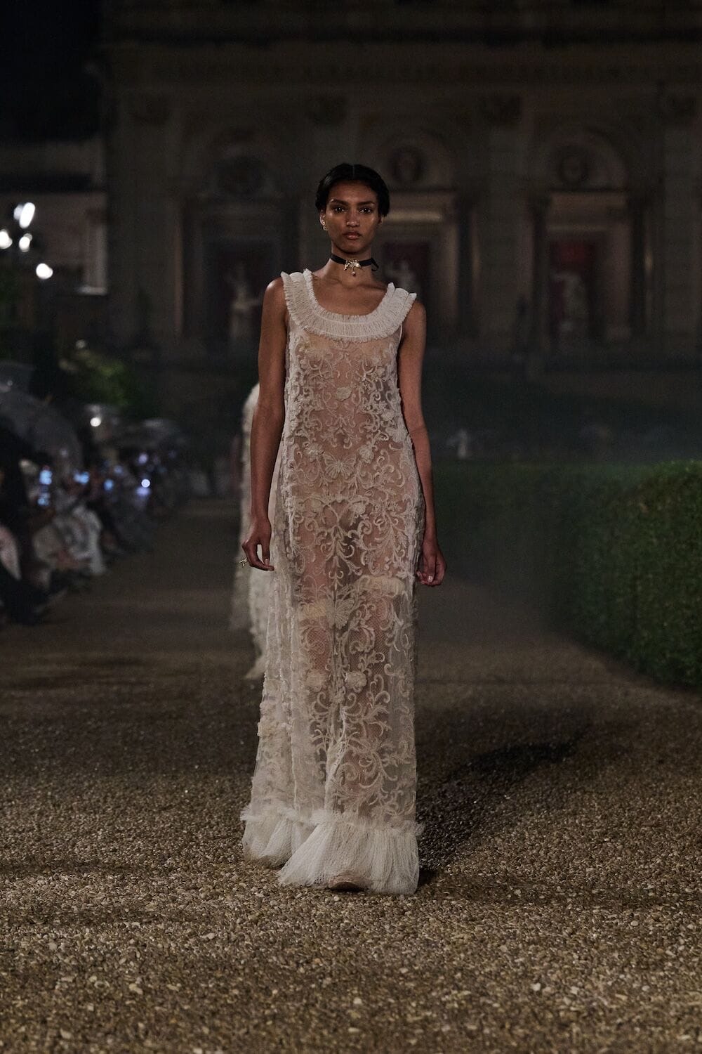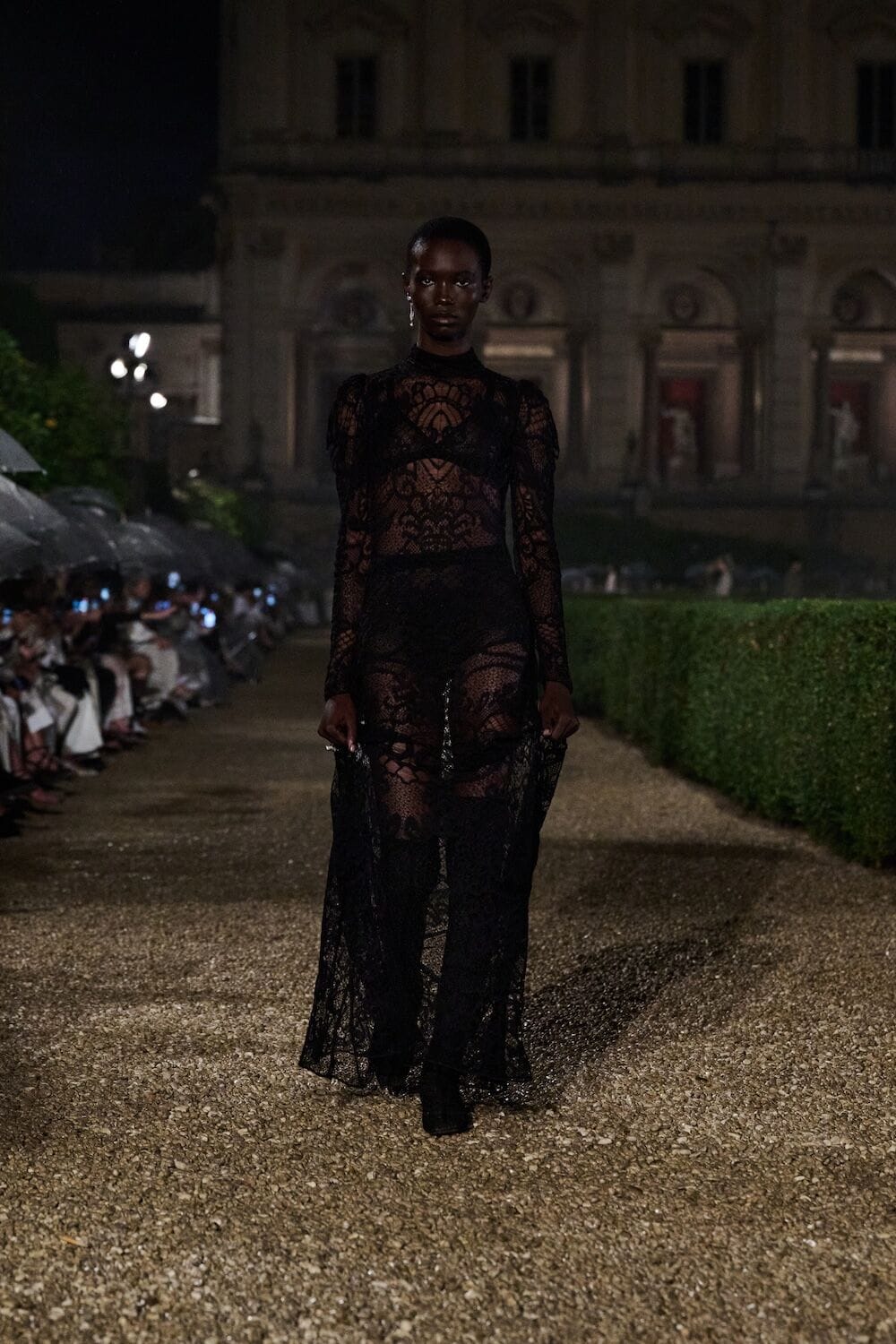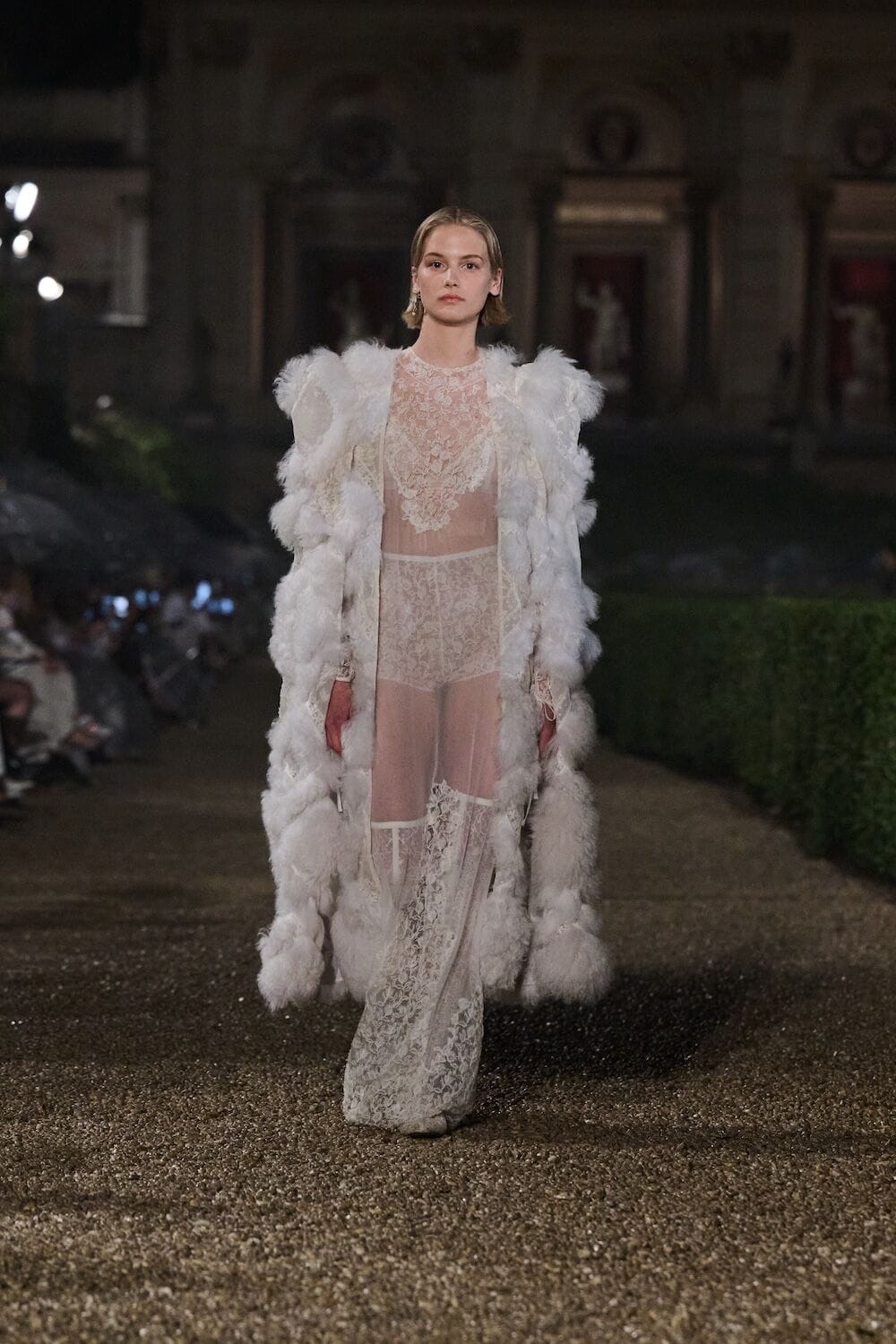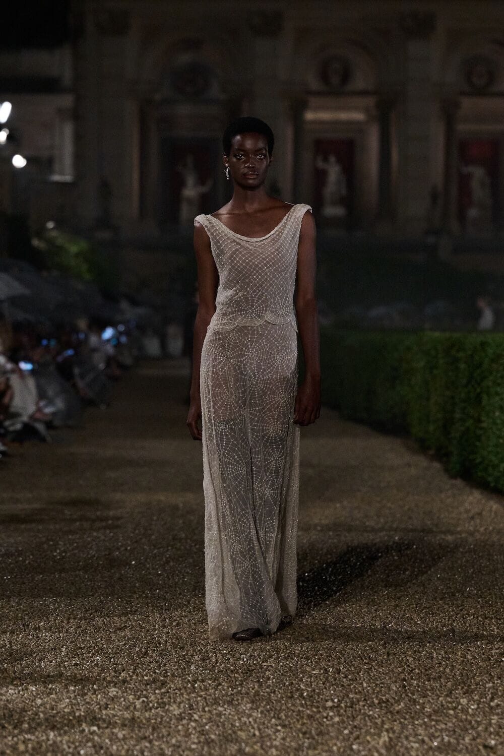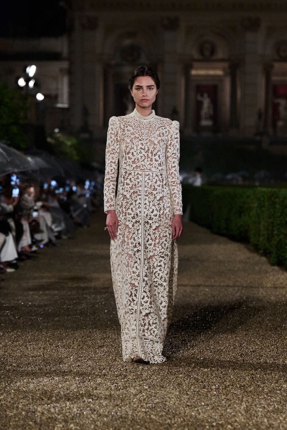 As the sun set, a mist rolled over the Villa’s famous gardens, offering a suitably cinematic backdrop for the models, who crunched along its gravel pathways. Chiuri mixed haute couture pieces in with her cruise collection, which married ethereal delicacy with androgynous tailoring. “You see the craft,” said Chiuri of her black and white colour palette (which also extended to the guests). It was inspired by a Man Ray photograph of a Bal Blanc, thrown in 1930 by art patron Mimì Pecci Blunt, who also founded the Rome’s Teatro Della Cometa, the 1950’s theatre that Chiuri and her daughter, Rachele Regini, have painstakingly restored over the past four years.