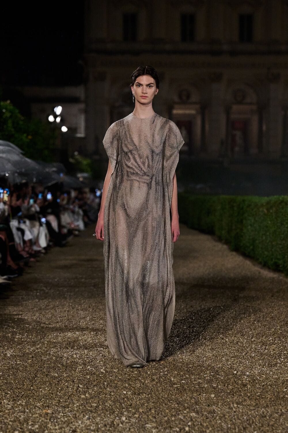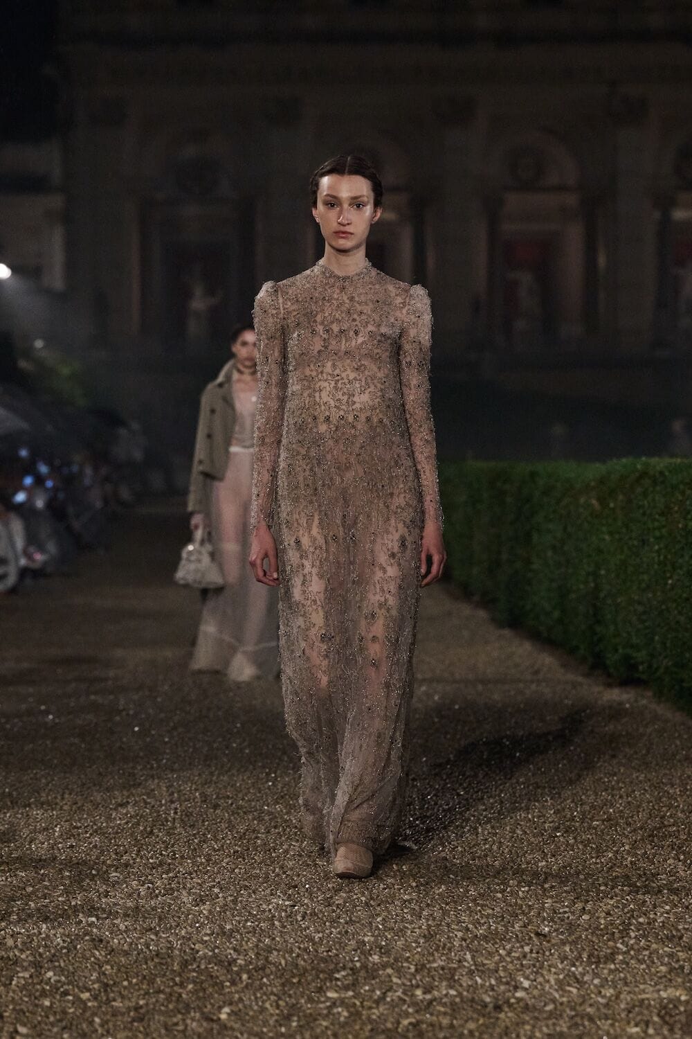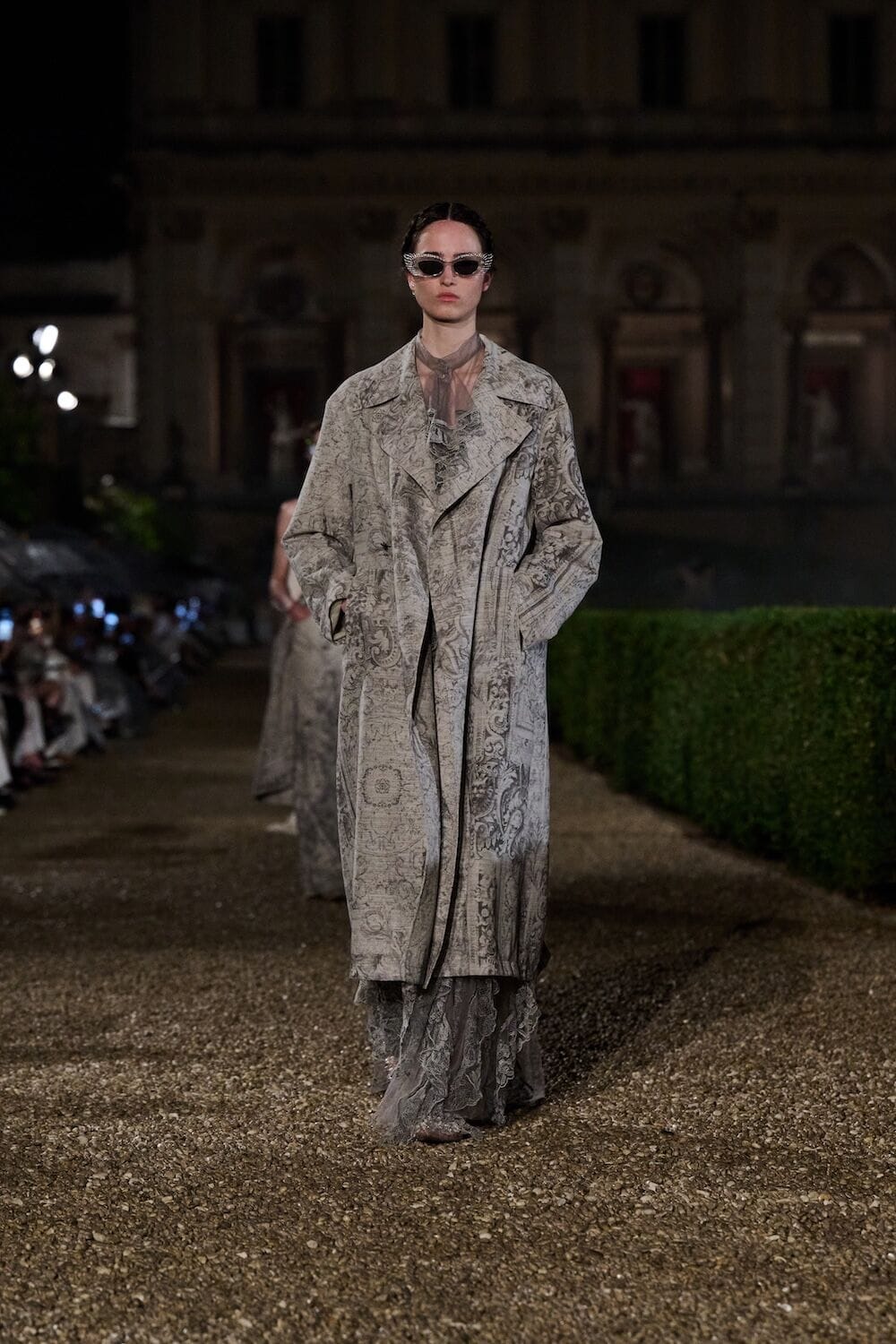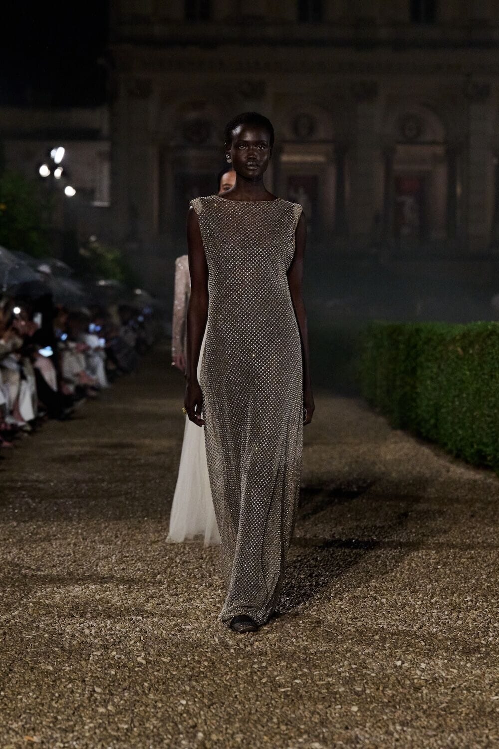 As the sun set, a mist rolled over the Villa’s famous gardens, offering a suitably cinematic backdrop for the models, who crunched along its gravel pathways. Chiuri mixed haute couture pieces in with her cruise collection, which married ethereal delicacy with androgynous tailoring. “You see the craft,” said Chiuri of her black and white colour palette (which also extended to the guests). It was inspired by a Man Ray photograph of a Bal Blanc, thrown in 1930 by art patron Mimì Pecci Blunt, who also founded the Rome’s Teatro Della Cometa, the 1950’s theatre that Chiuri and her daughter, Rachele Regini, have painstakingly restored over the past four years.