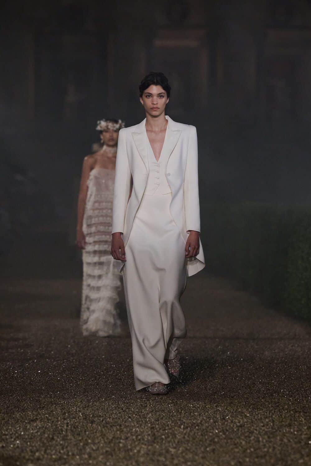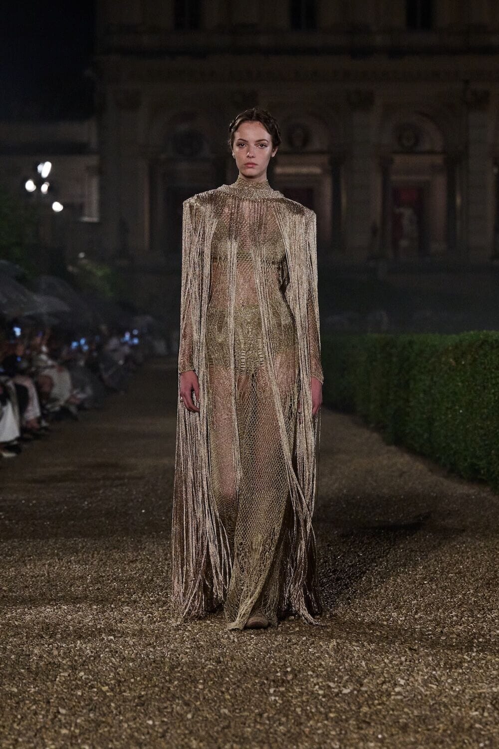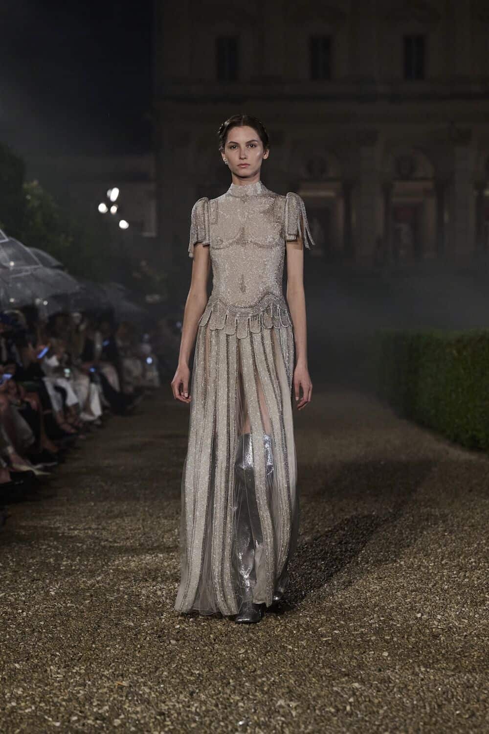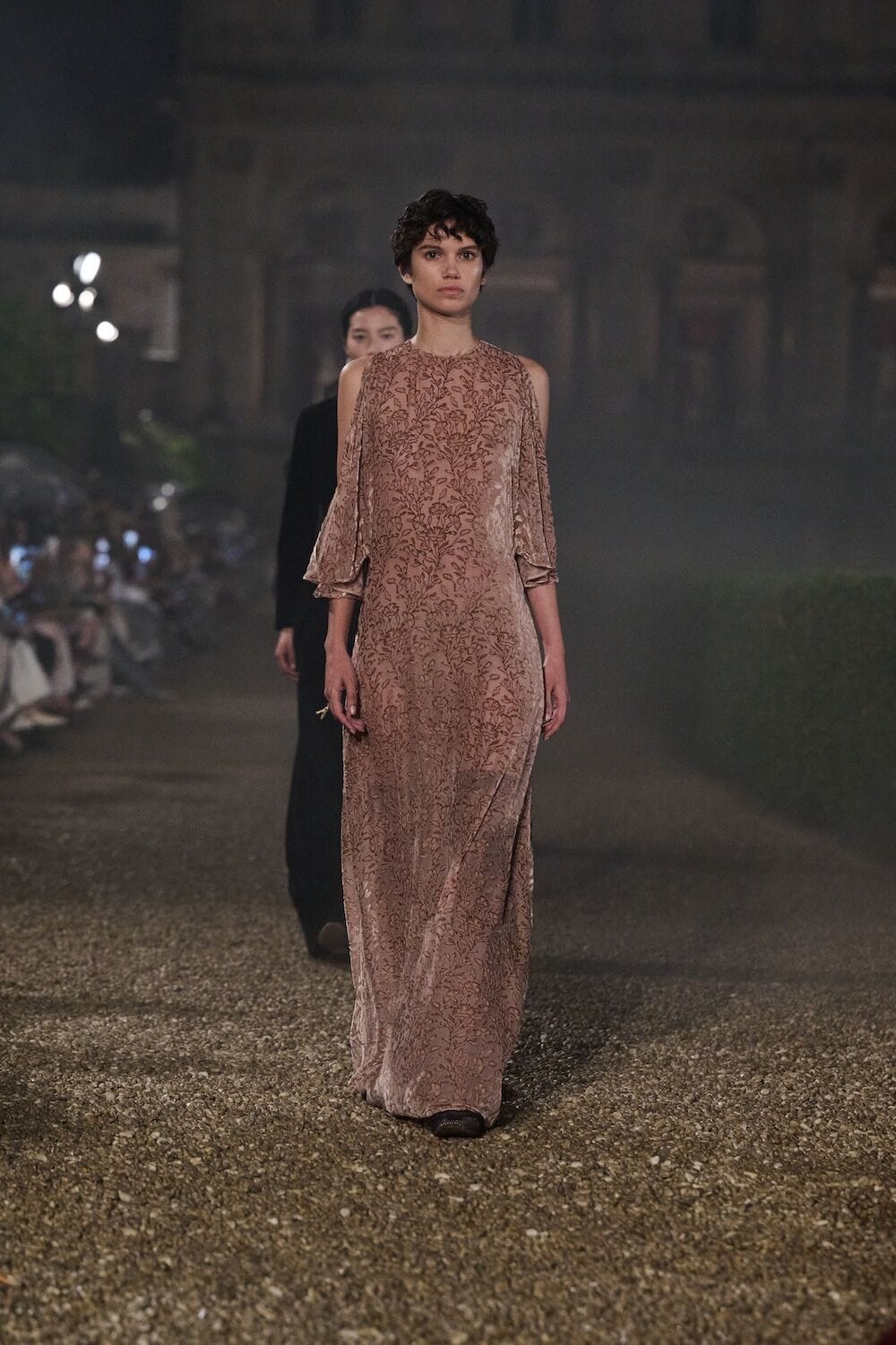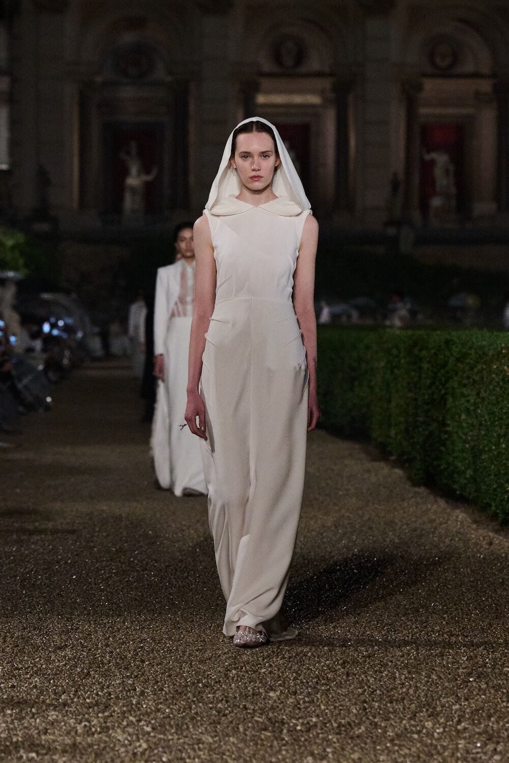 As the sun set, a mist rolled over the Villa’s famous gardens, offering a suitably cinematic backdrop for the models, who crunched along its gravel pathways. Chiuri mixed haute couture pieces in with her cruise collection, which married ethereal delicacy with androgynous tailoring. “You see the craft,” said Chiuri of her black and white colour palette (which also extended to the guests). It was inspired by a Man Ray photograph of a Bal Blanc, thrown in 1930 by art patron Mimì Pecci Blunt, who also founded the Rome’s Teatro Della Cometa, the 1950’s theatre that Chiuri and her daughter, Rachele Regini, have painstakingly restored over the past four years.