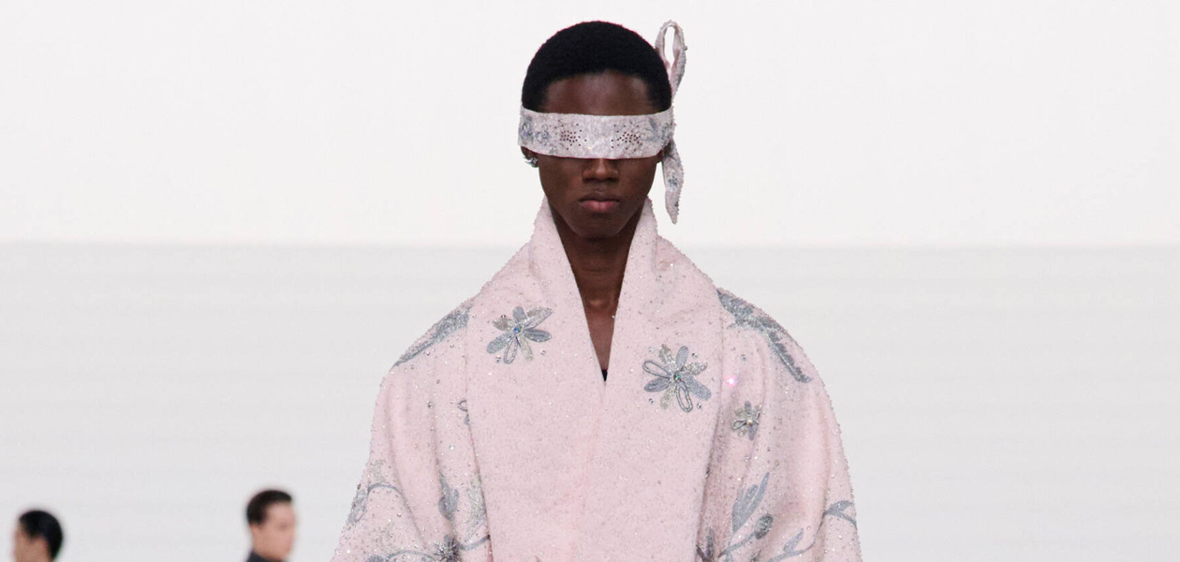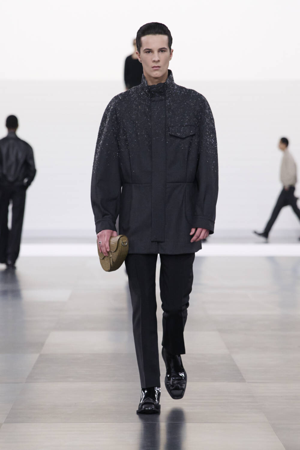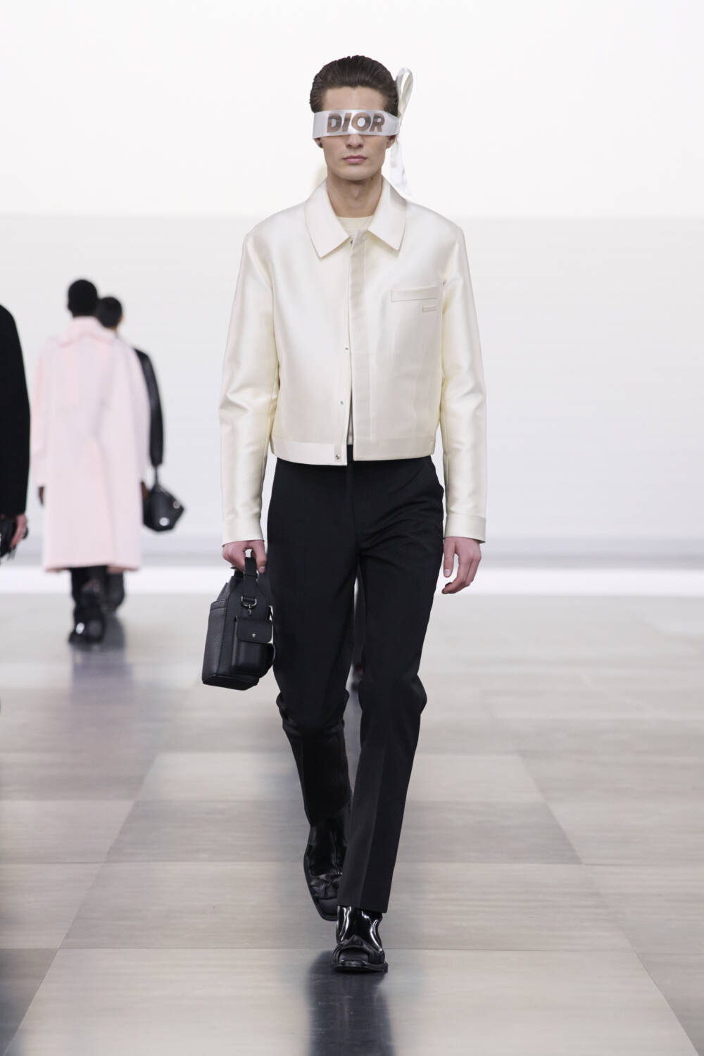 Throughout, Jones was able to adapt ornate, eighteenth century menswear and nineteenth century utilitarian codes, fused with flutters of Mr Dior’s elegant sartorial handwriting. Descending a giant white staircase with cinematic flair, models – many wearing semi-opaque blindfolds – donned cocooning opera coats tied into a bow at the shoulders, handsome bar jackets and long-line blousons frosted with crystals that mimicked rain splashes.