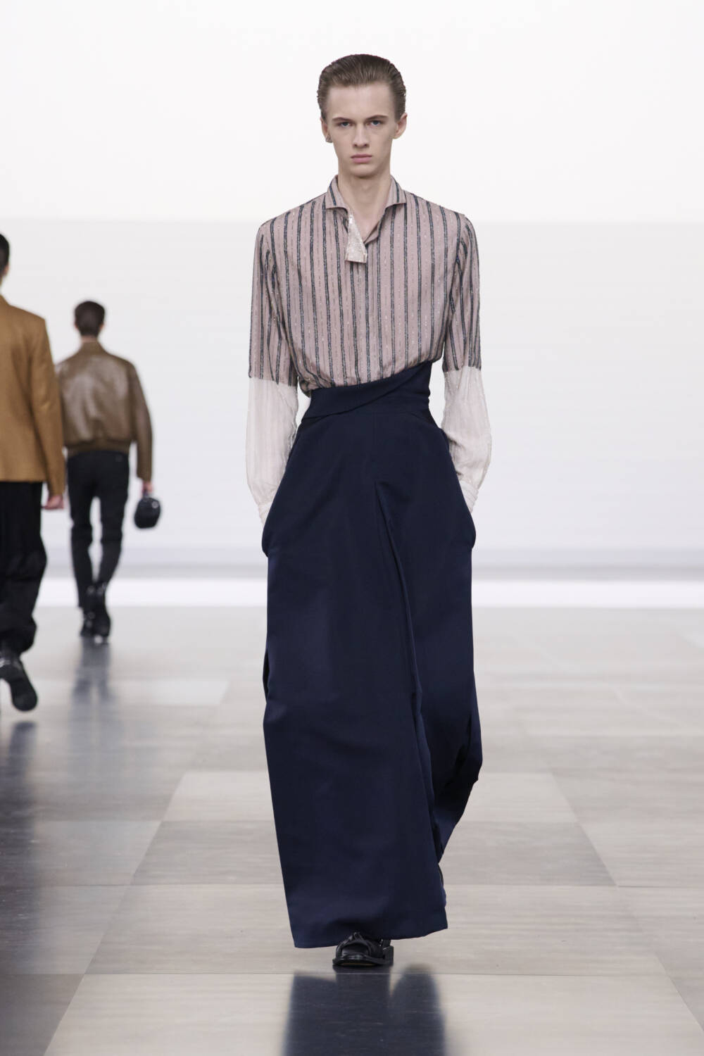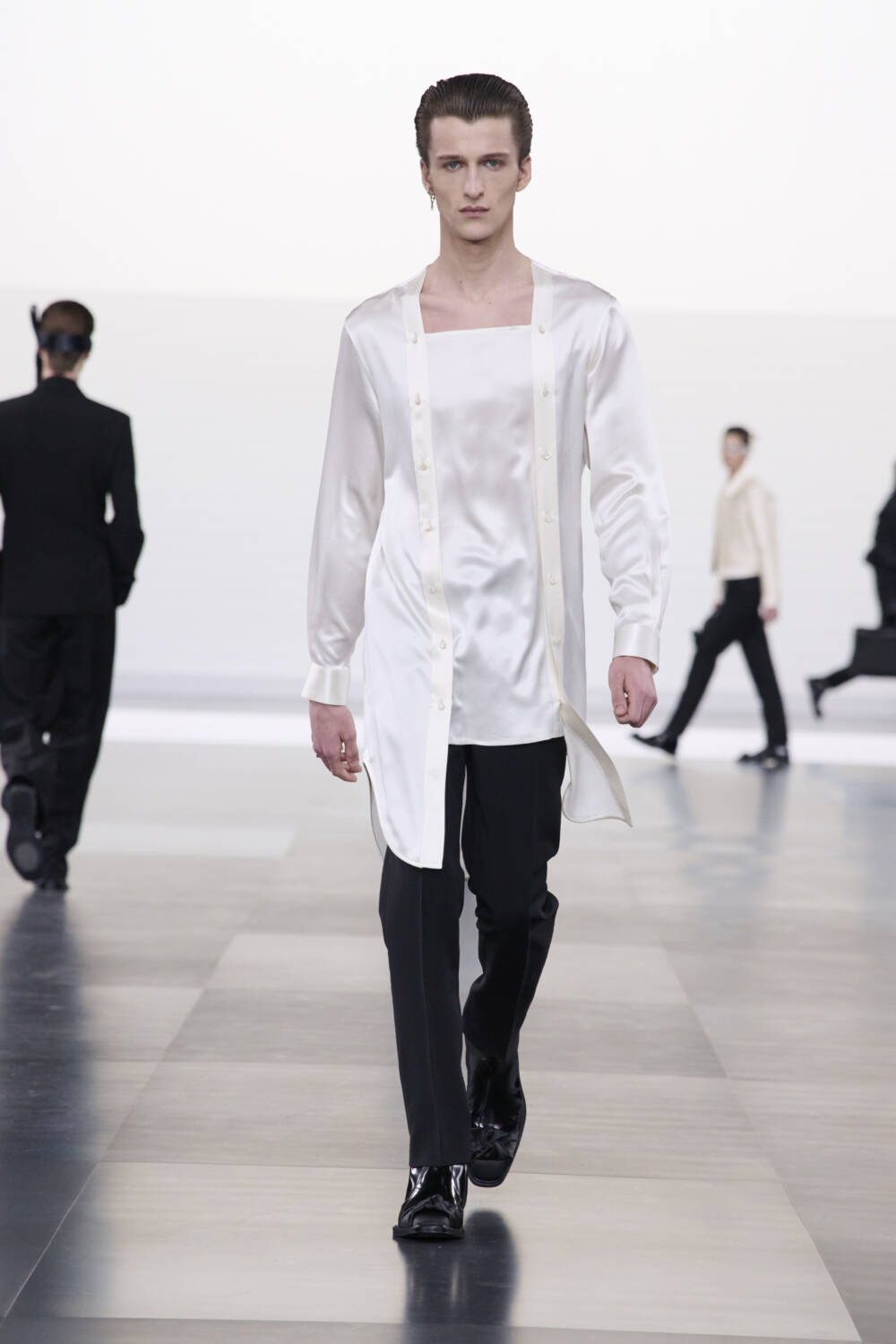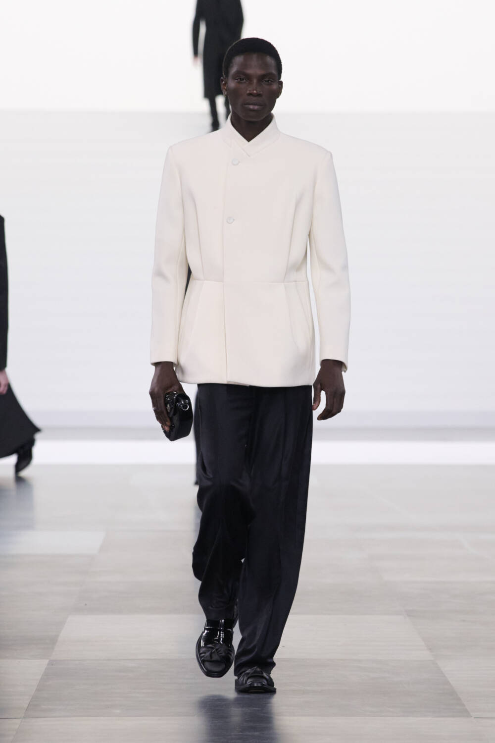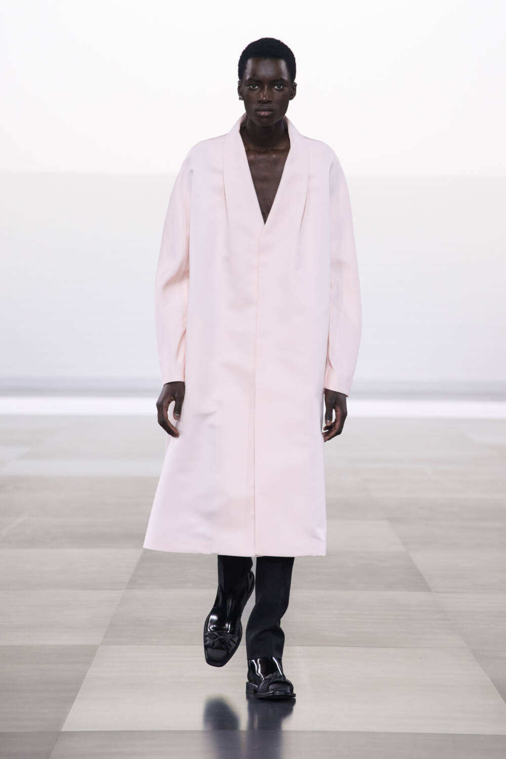 During his tenure at Dior, Kim Jones has been in a continuous design dialogue with Christian Dior himself, cleverly adapting and remixing the hallmarks of the haute couturier to bring an air of romance and grandeur to his modern menswear wardrobe. This season Jones turned to the Ligne H AW54 collection, drawn to its “graphic and angular” moments, “which felt eminently transferable into the men’s world”, said the designer.