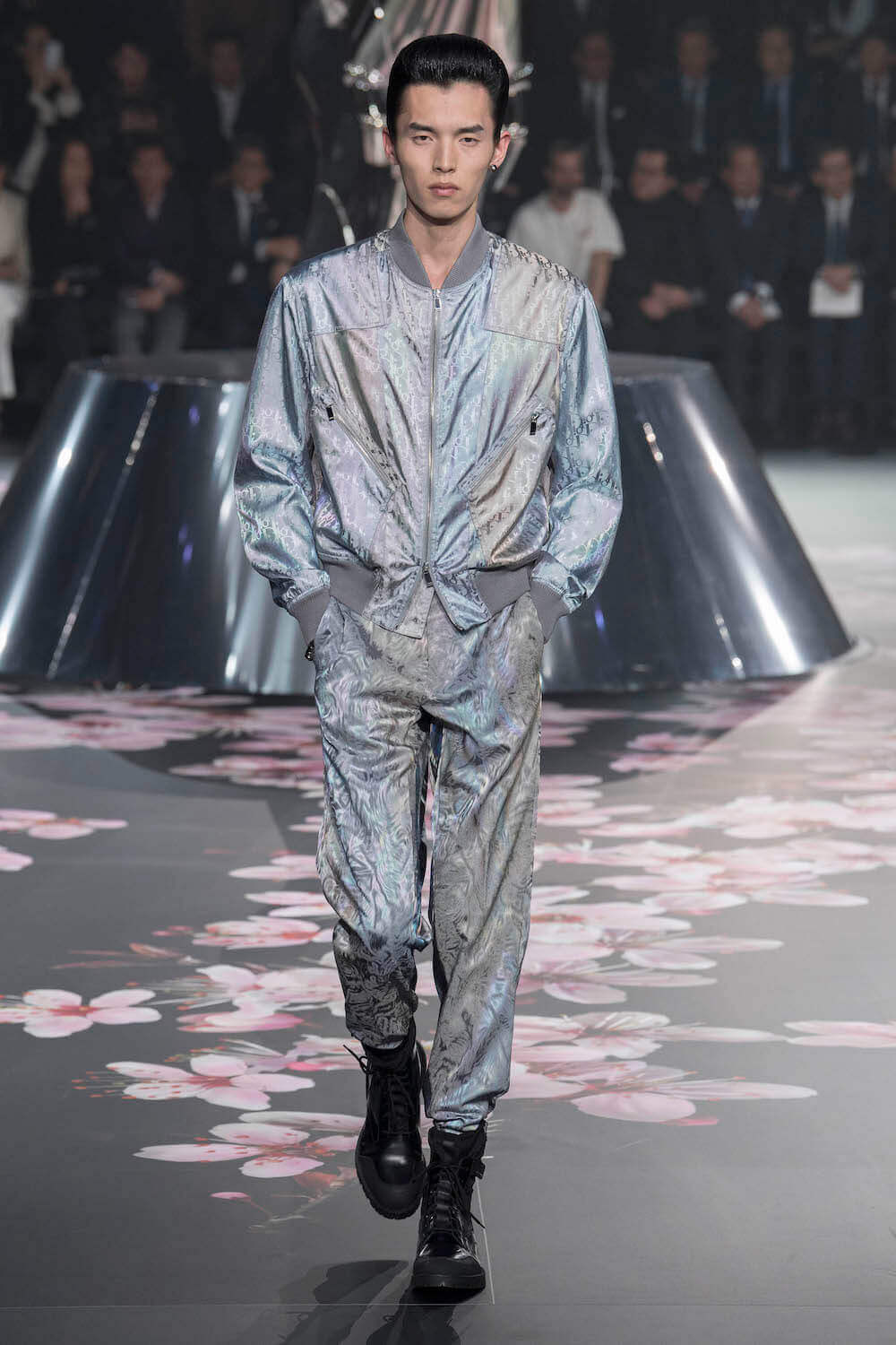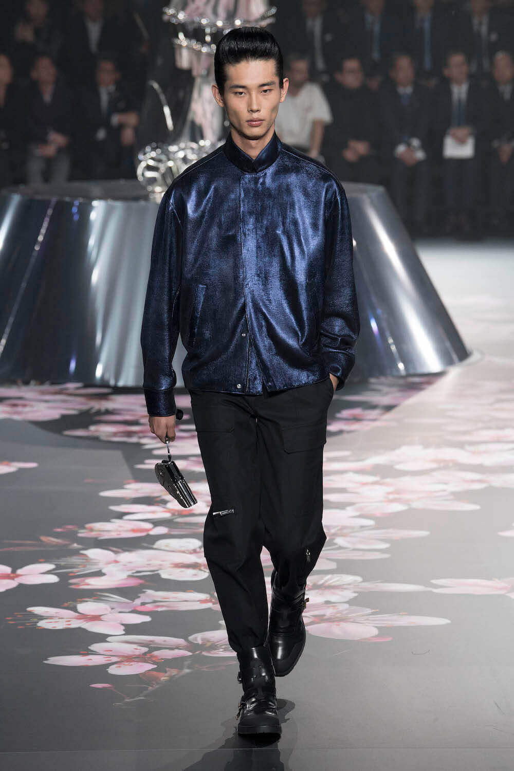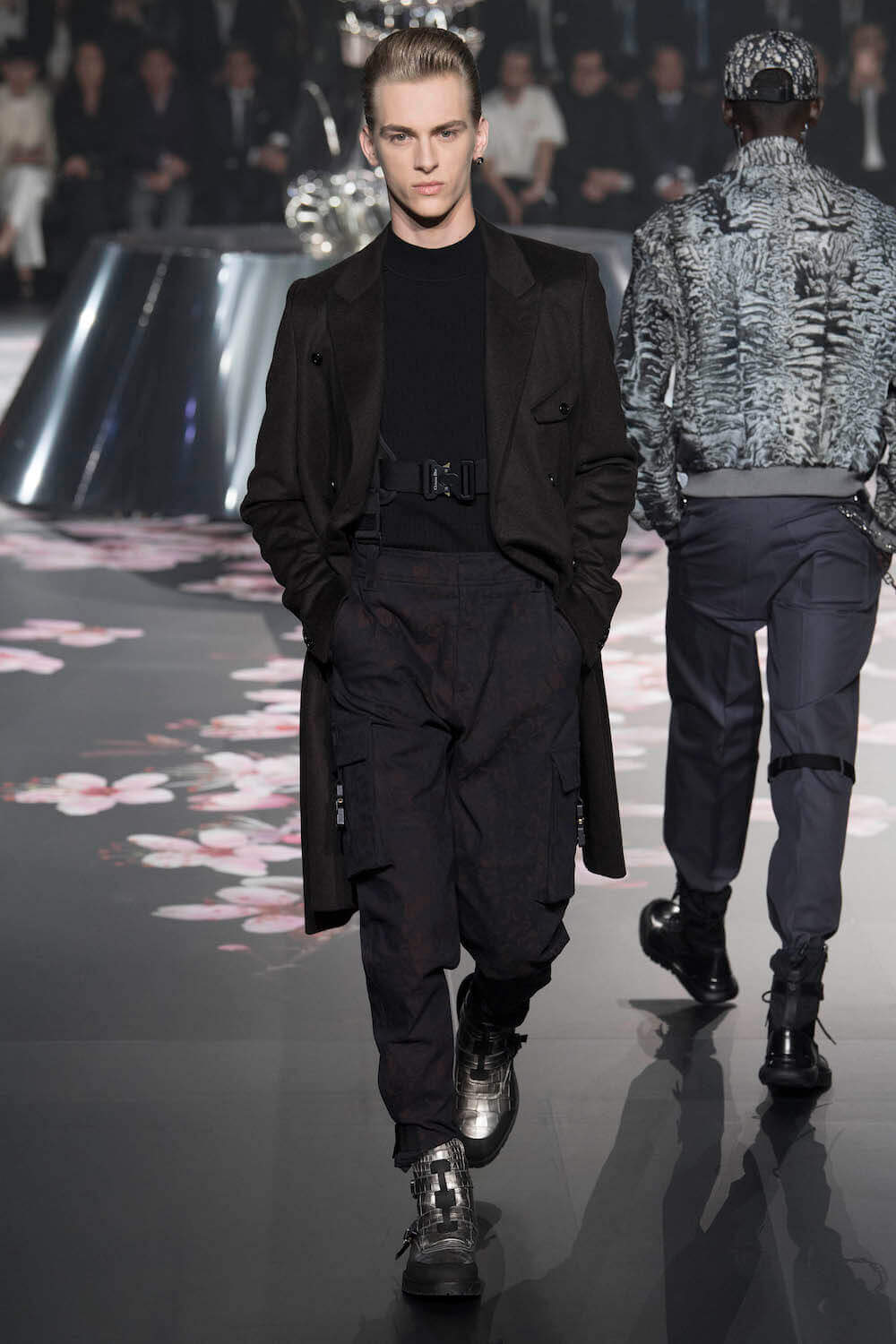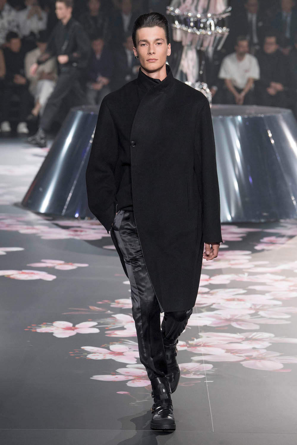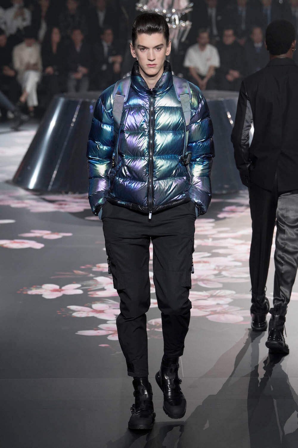 The whole scenography looked like a corner taken from Fritz Lang’s 1927 flick Metropolis. But unlike Lang’s, Kim Jones’ wasn’t a story of a dystopia – it was a utopian community where the past and future lives in harmony. The cherry blossom prints and Obi-like jacket fastenings were accompanied by reflective nylons, metallic buckles (designed by Alyx’s Matthew Williams) and chunky jewellery (created by Yoon Ahn of Ambush). Equal respect was paid to heritage as it was to all the new ideas and concepts in Kim Jones’ mind. The silhouettes were a natural progression of his first collection for the French fashion house, updated to reflect his current state of mind. The tailoring was without a single flaw, each shape more desirable than the previous one – a pure showcase of craftsmanship interpreted by a street-savvy brain such as the one of Mister Jones.