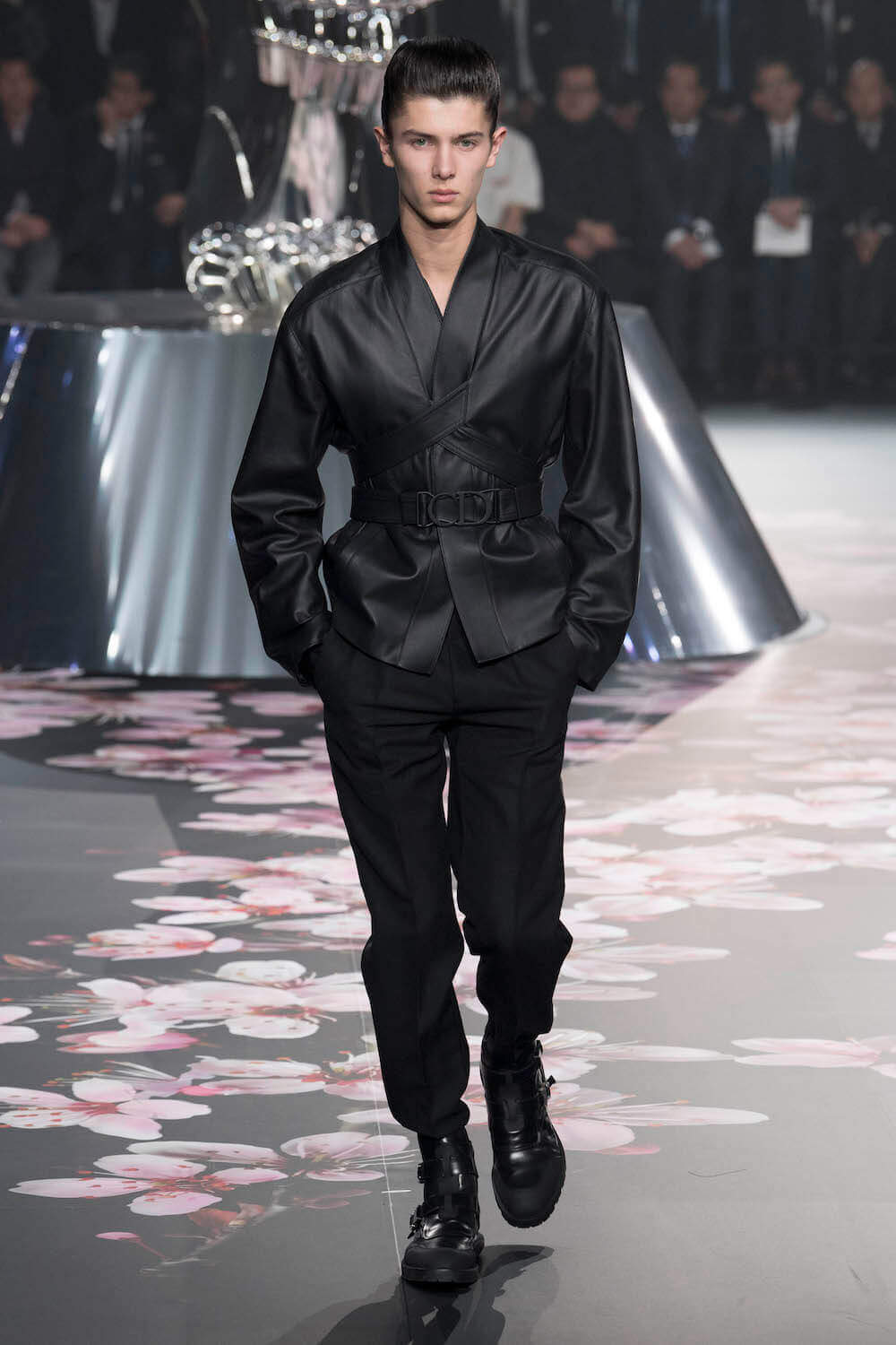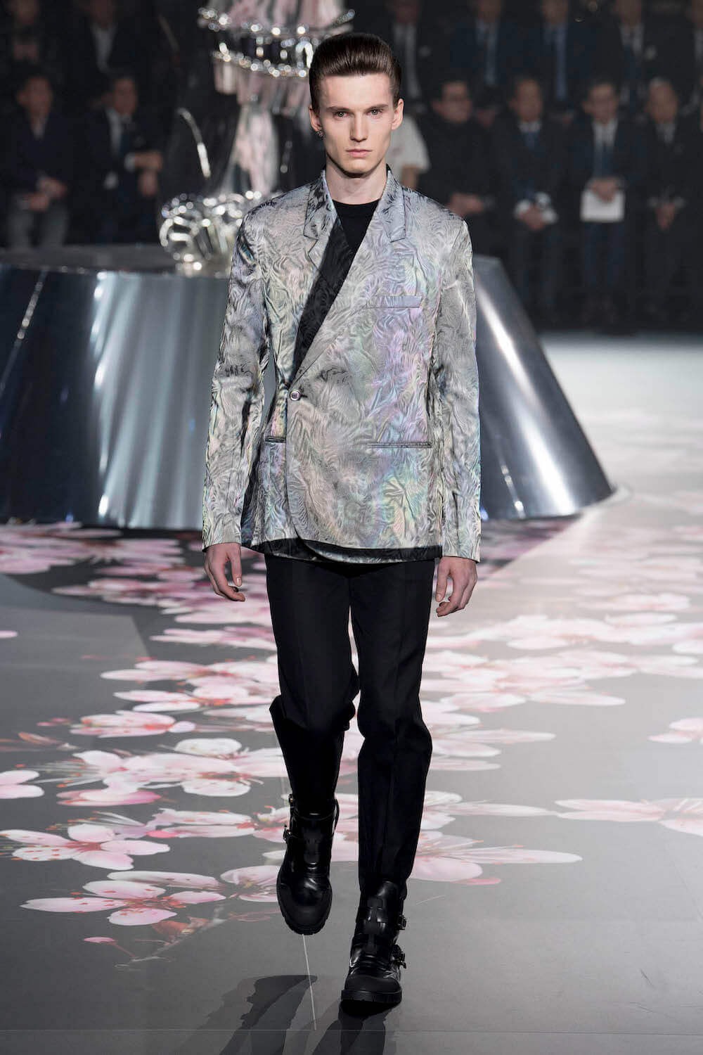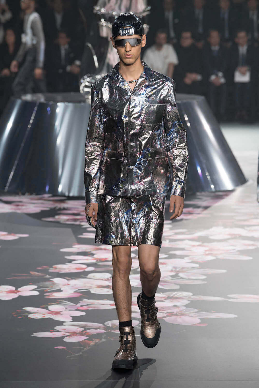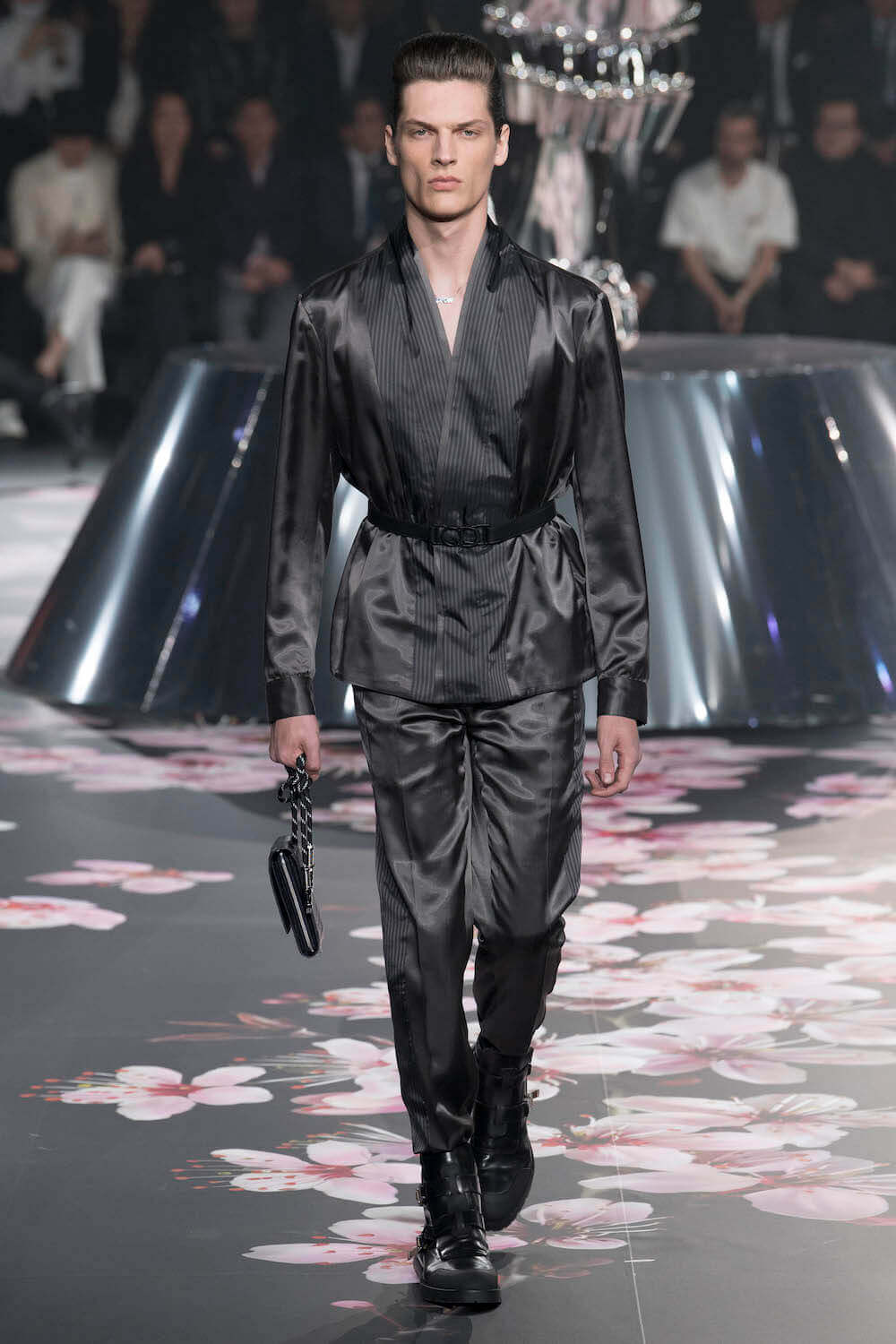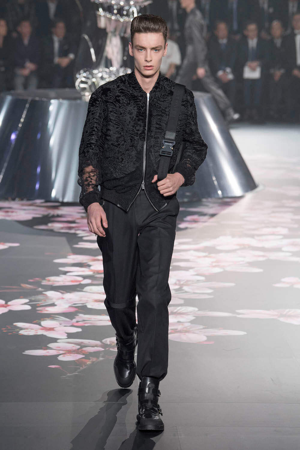 The whole scenography looked like a corner taken from Fritz Lang’s 1927 flick Metropolis. But unlike Lang’s, Kim Jones’ wasn’t a story of a dystopia – it was a utopian community where the past and future lives in harmony. The cherry blossom prints and Obi-like jacket fastenings were accompanied by reflective nylons, metallic buckles (designed by Alyx’s Matthew Williams) and chunky jewellery (created by Yoon Ahn of Ambush). Equal respect was paid to heritage as it was to all the new ideas and concepts in Kim Jones’ mind. The silhouettes were a natural progression of his first collection for the French fashion house, updated to reflect his current state of mind. The tailoring was without a single flaw, each shape more desirable than the previous one – a pure showcase of craftsmanship interpreted by a street-savvy brain such as the one of Mister Jones.