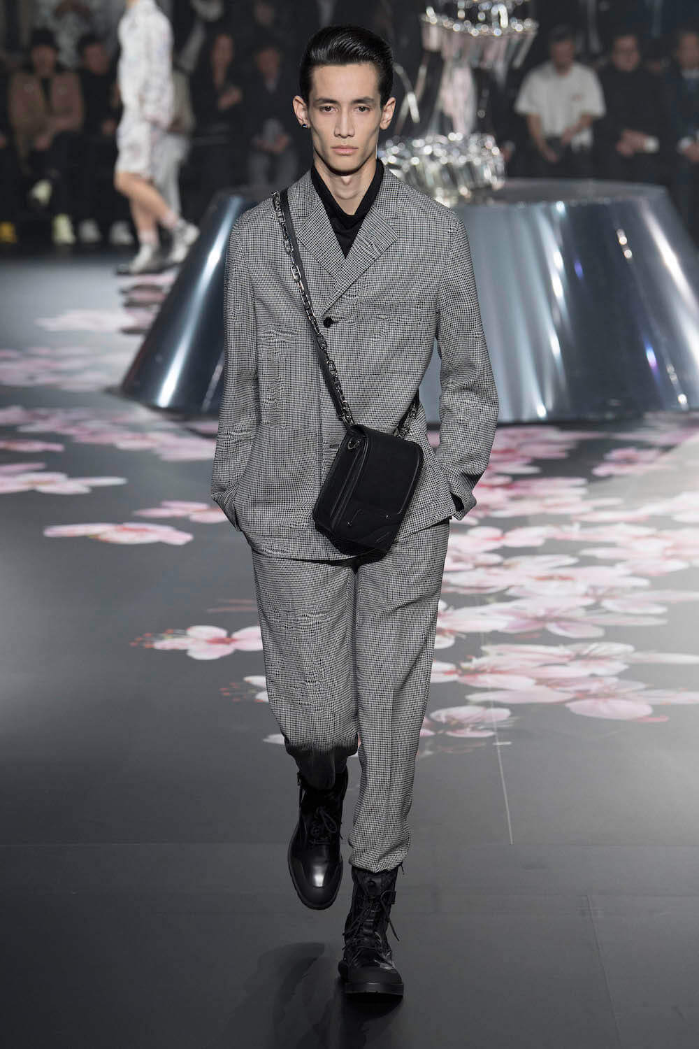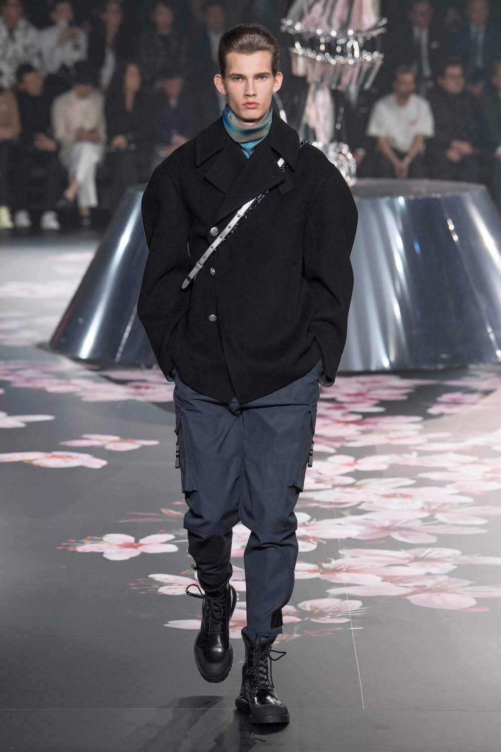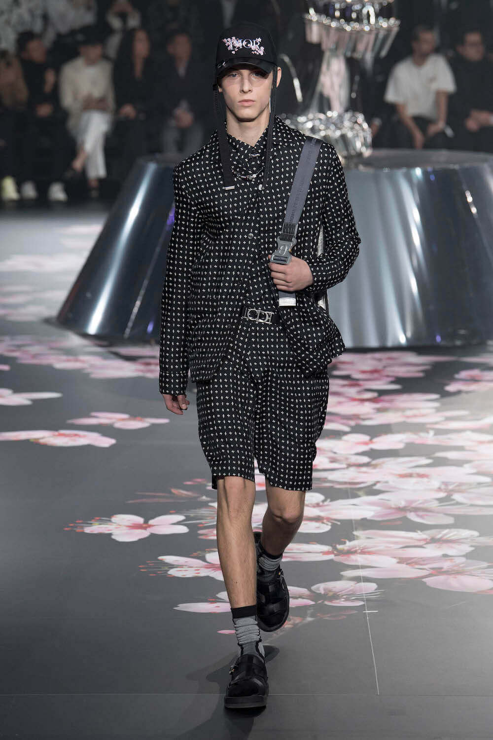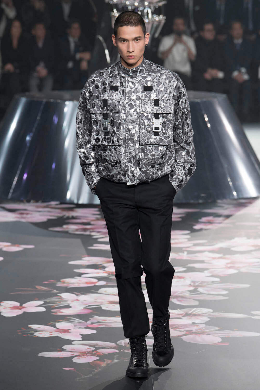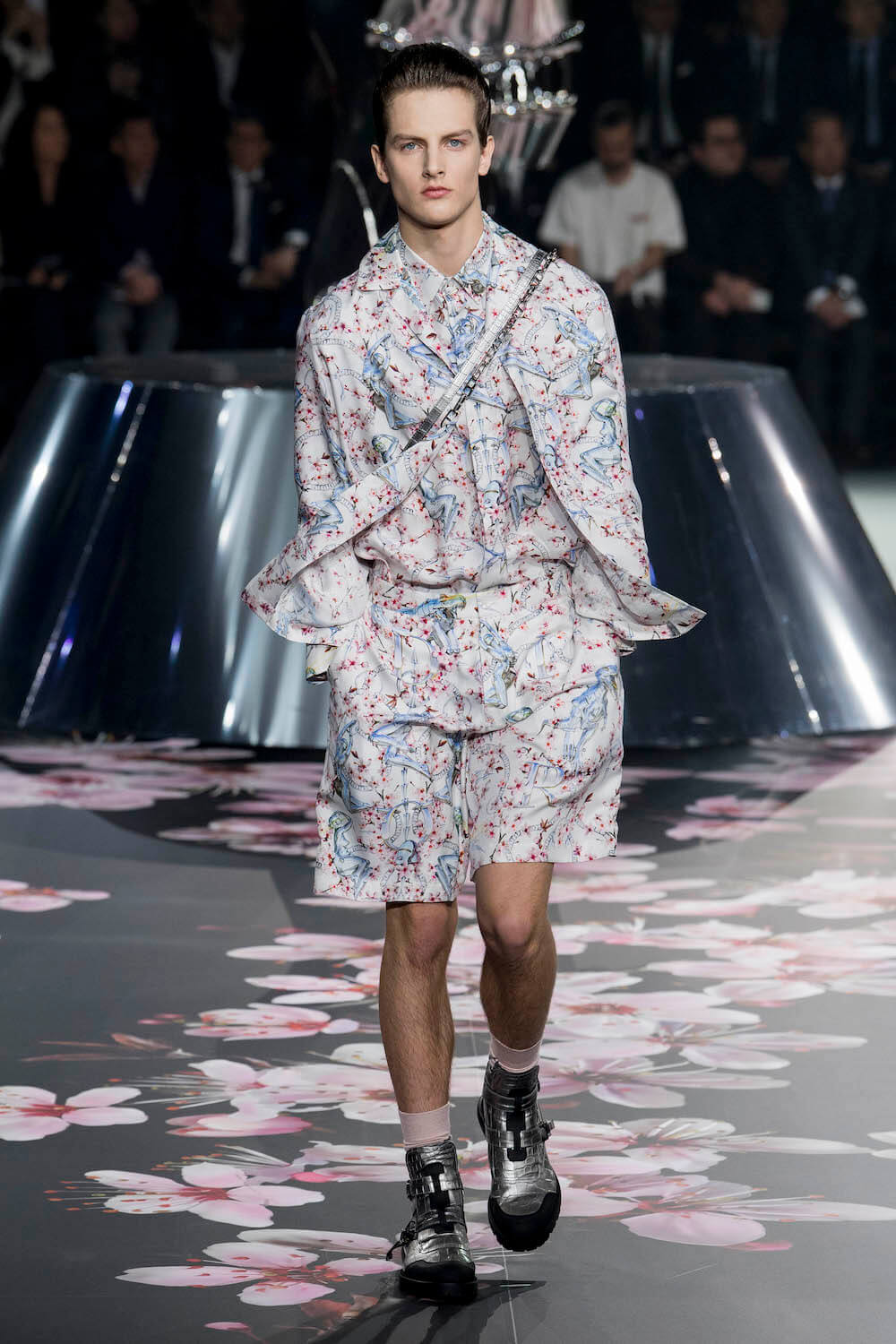The whole scenography looked like a corner taken from Fritz Lang’s 1927 flick Metropolis. But unlike Lang’s, Kim Jones’ wasn’t a story of a dystopia – it was a utopian community where the past and future lives in harmony. The cherry blossom prints and Obi-like jacket fastenings were accompanied by reflective nylons, metallic buckles (designed by Alyx’s Matthew Williams) and chunky jewellery (created by Yoon Ahn of Ambush). Equal respect was paid to heritage as it was to all the new ideas and concepts in Kim Jones’ mind. The silhouettes were a natural progression of his first collection for the French fashion house, updated to reflect his current state of mind. The tailoring was without a single flaw, each shape more desirable than the previous one – a pure showcase of craftsmanship interpreted by a street-savvy brain such as the one of Mister Jones.