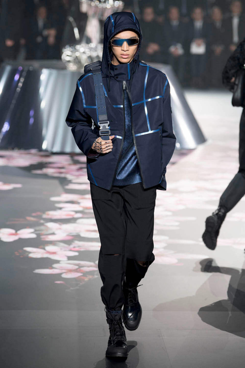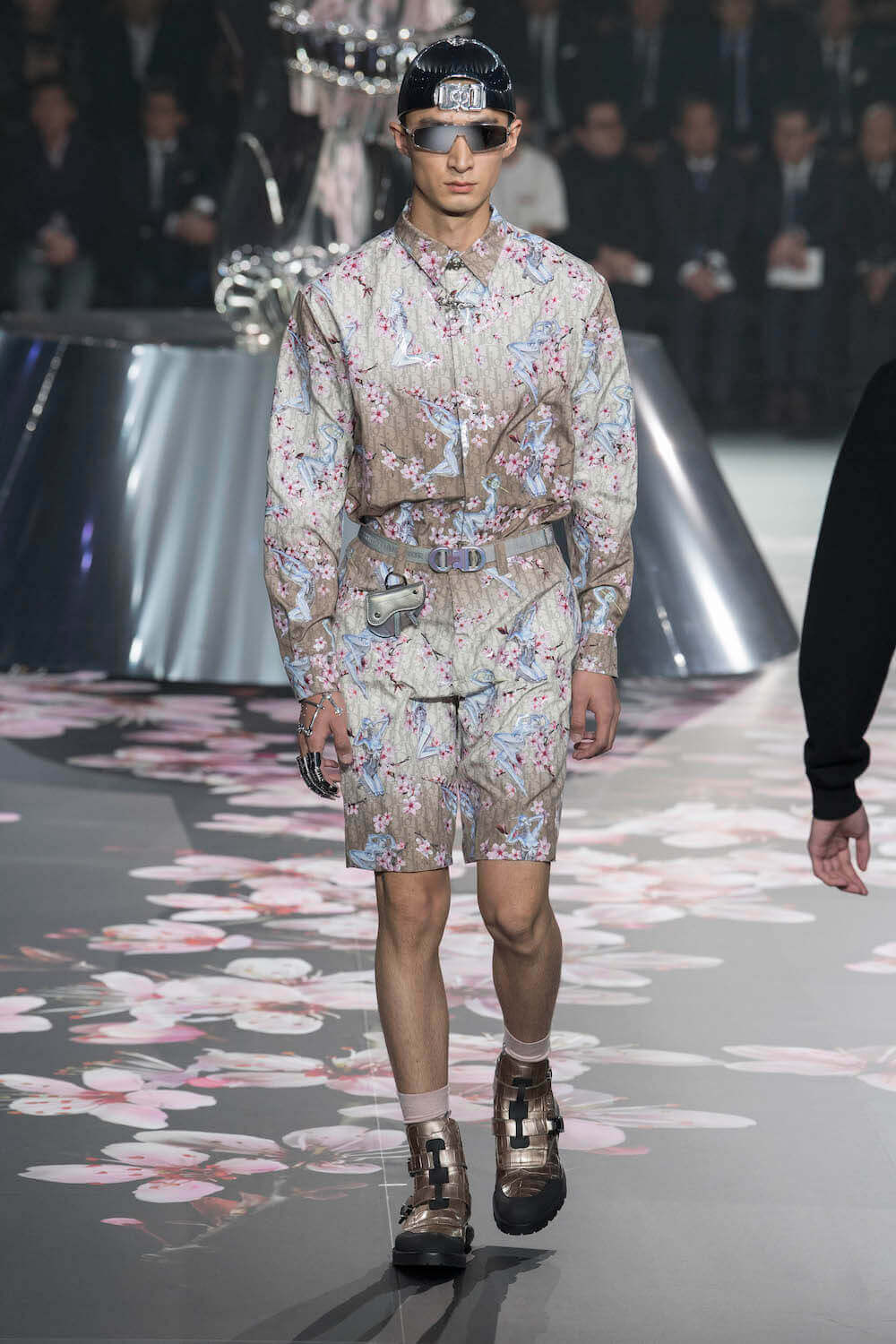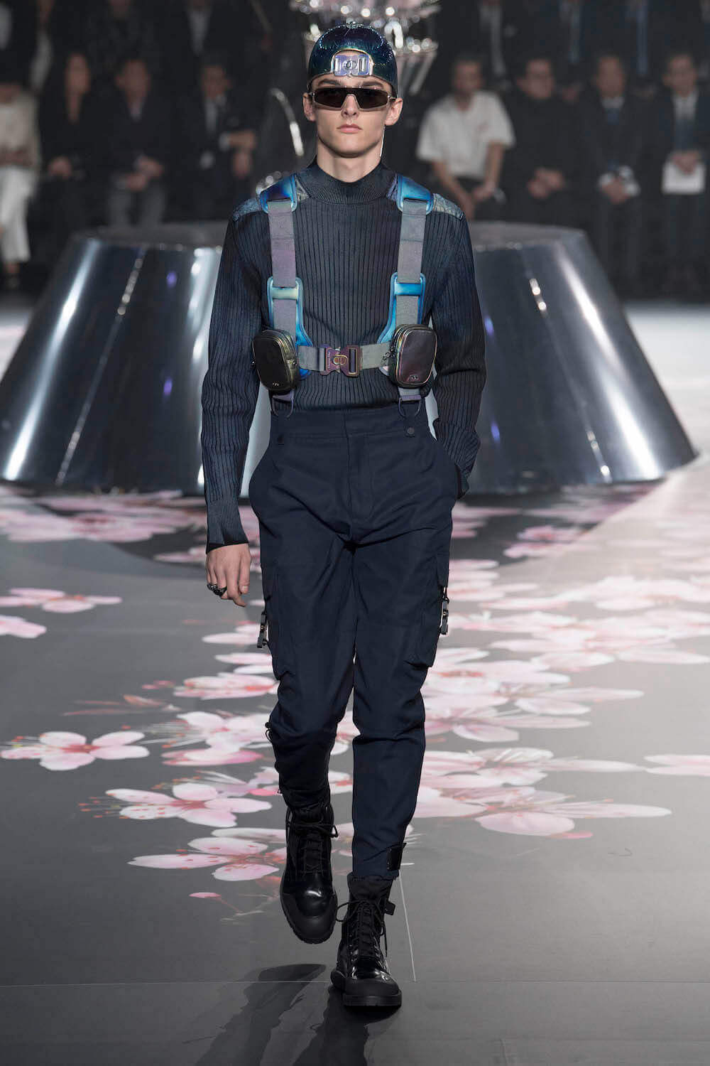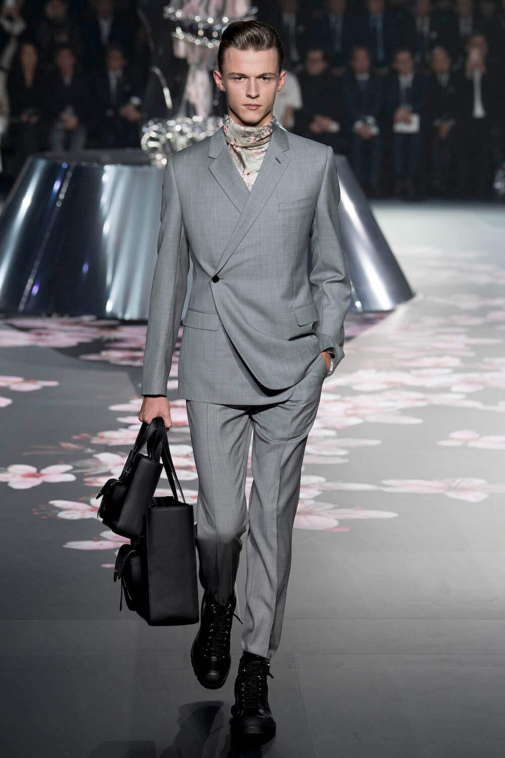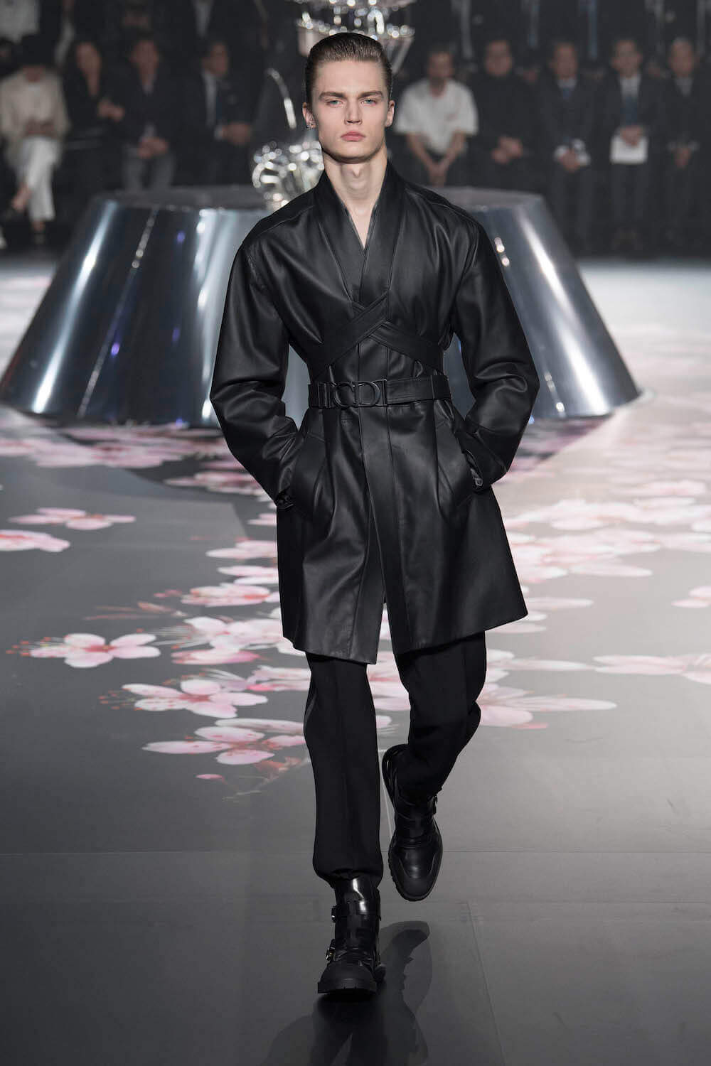 The whole scenography looked like a corner taken from Fritz Lang’s 1927 flick Metropolis. But unlike Lang’s, Kim Jones’ wasn’t a story of a dystopia – it was a utopian community where the past and future lives in harmony. The cherry blossom prints and Obi-like jacket fastenings were accompanied by reflective nylons, metallic buckles (designed by Alyx’s Matthew Williams) and chunky jewellery (created by Yoon Ahn of Ambush). Equal respect was paid to heritage as it was to all the new ideas and concepts in Kim Jones’ mind. The silhouettes were a natural progression of his first collection for the French fashion house, updated to reflect his current state of mind. The tailoring was without a single flaw, each shape more desirable than the previous one – a pure showcase of craftsmanship interpreted by a street-savvy brain such as the one of Mister Jones.