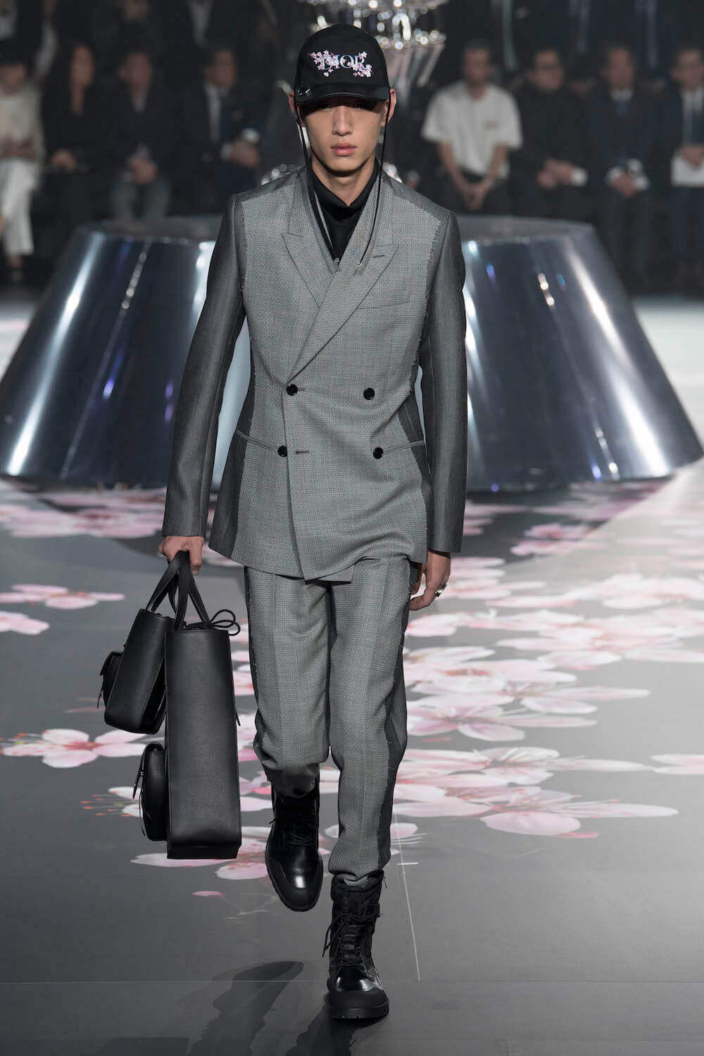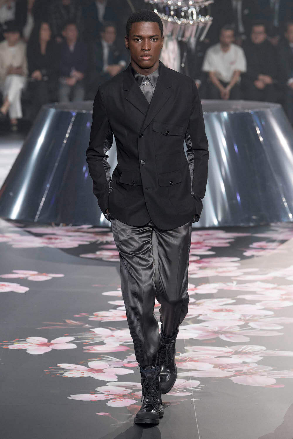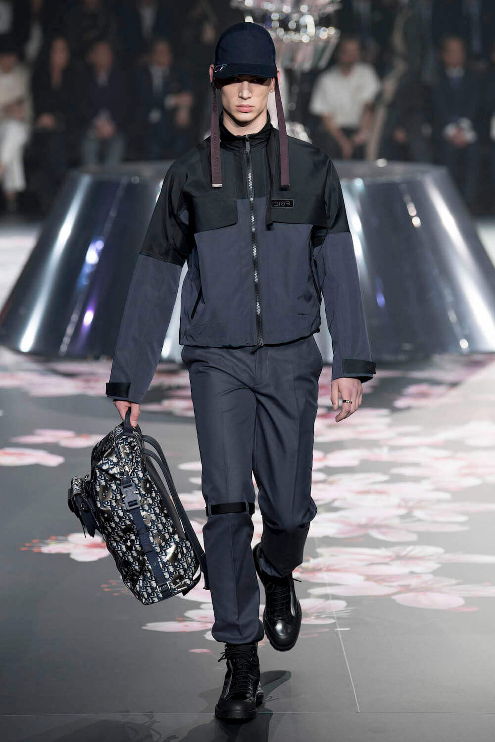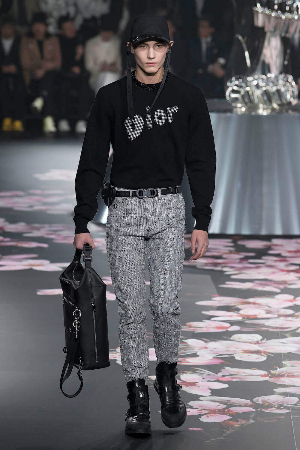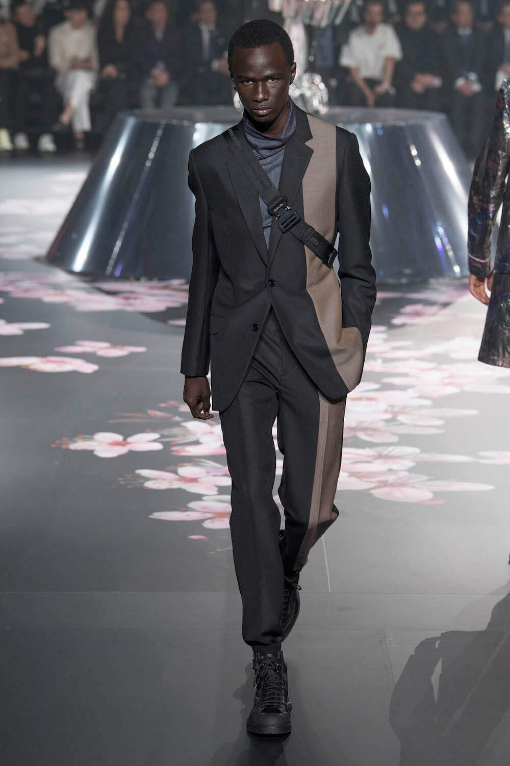 The whole scenography looked like a corner taken from Fritz Lang’s 1927 flick Metropolis. But unlike Lang’s, Kim Jones’ wasn’t a story of a dystopia – it was a utopian community where the past and future lives in harmony. The cherry blossom prints and Obi-like jacket fastenings were accompanied by reflective nylons, metallic buckles (designed by Alyx’s Matthew Williams) and chunky jewellery (created by Yoon Ahn of Ambush). Equal respect was paid to heritage as it was to all the new ideas and concepts in Kim Jones’ mind. The silhouettes were a natural progression of his first collection for the French fashion house, updated to reflect his current state of mind. The tailoring was without a single flaw, each shape more desirable than the previous one – a pure showcase of craftsmanship interpreted by a street-savvy brain such as the one of Mister Jones.