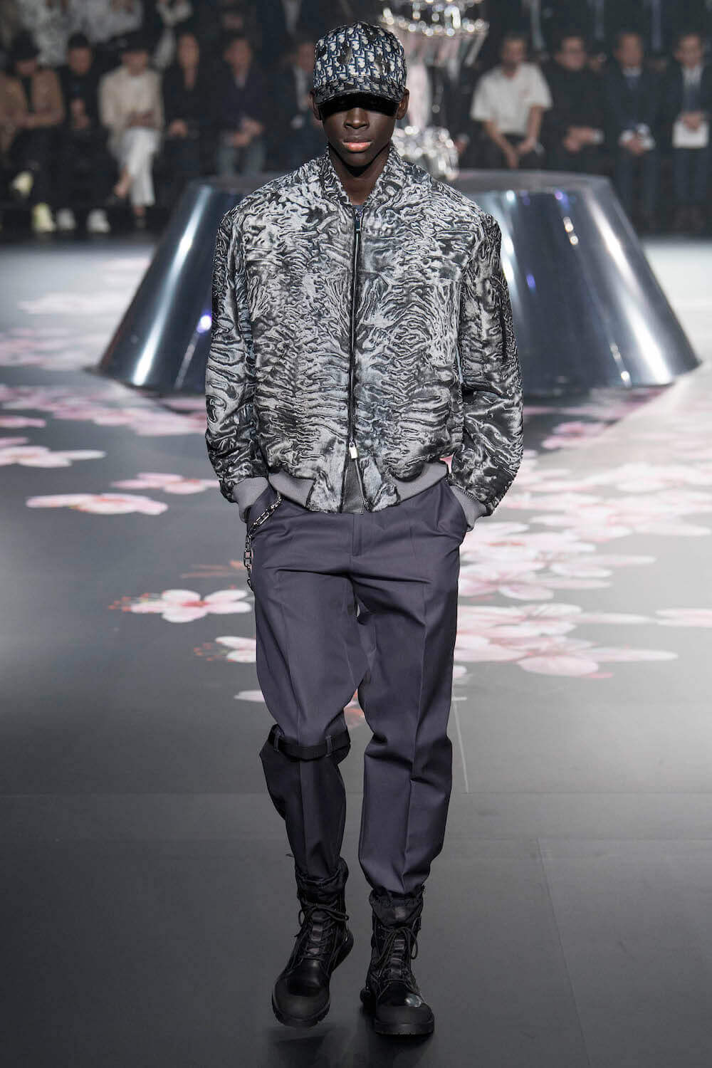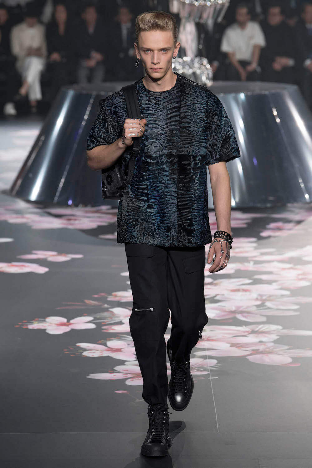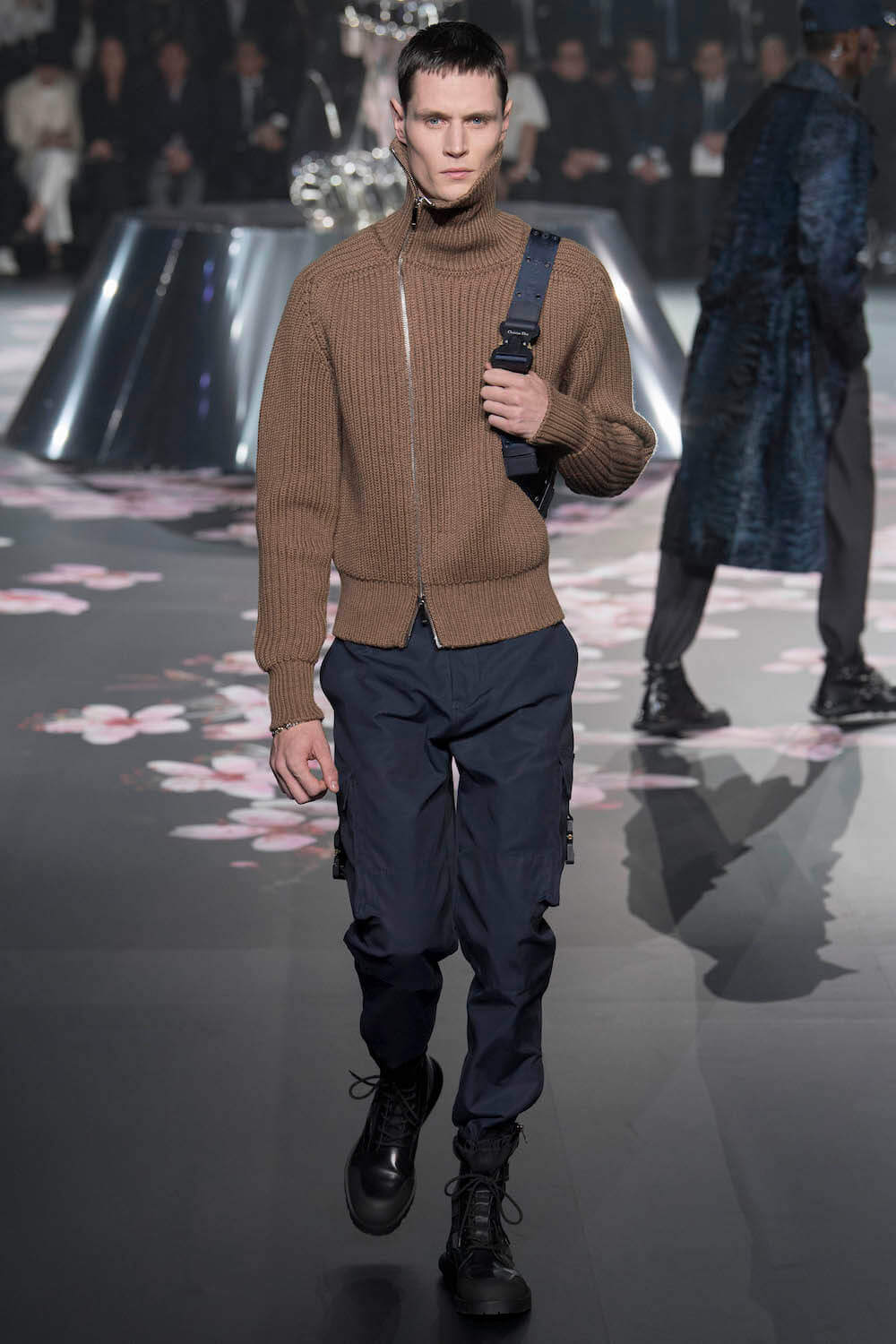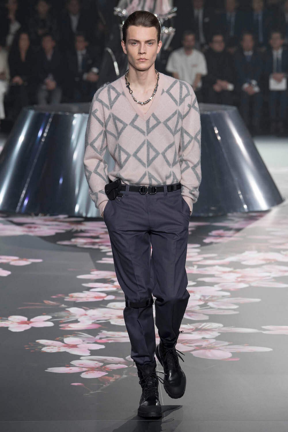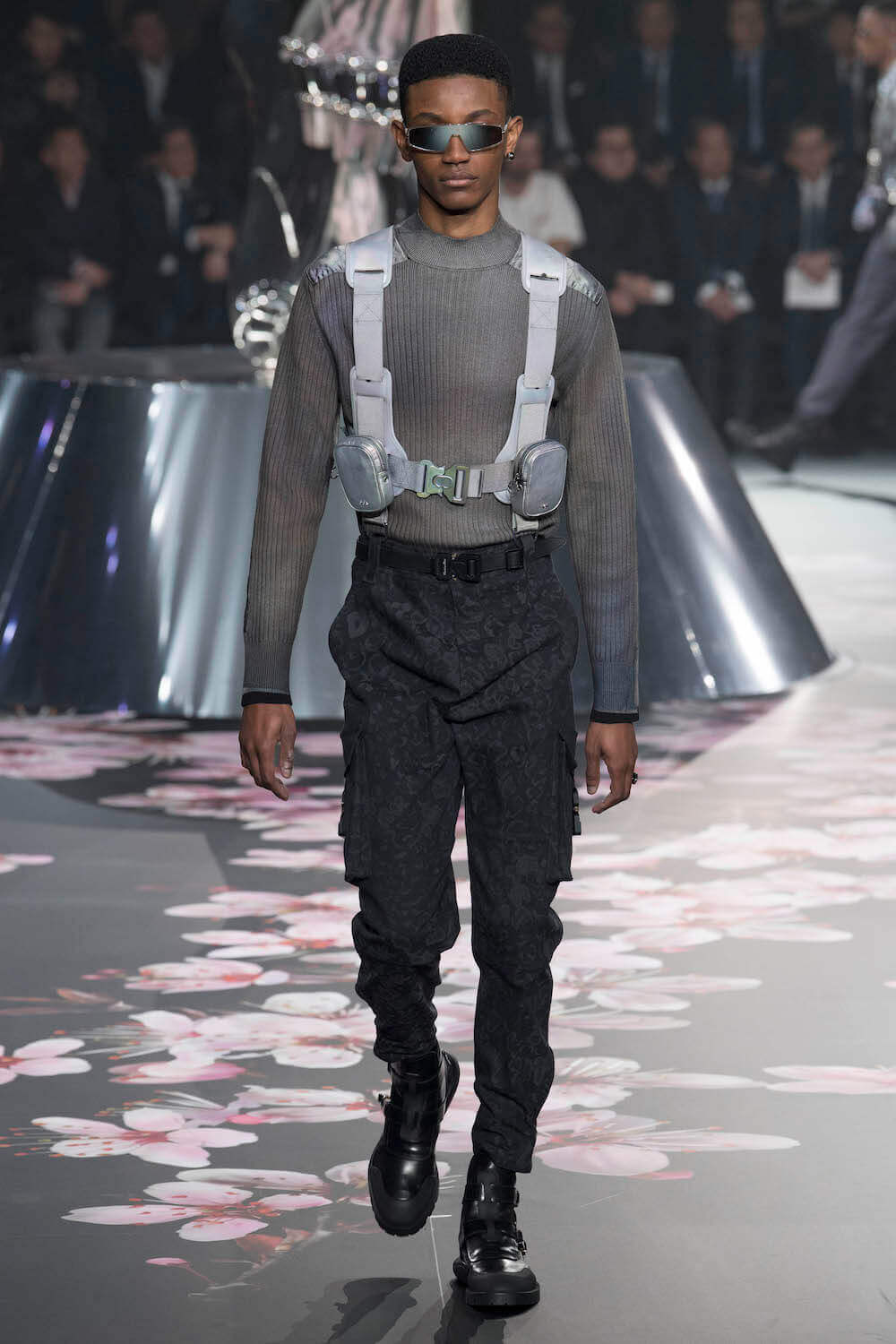 The whole scenography looked like a corner taken from Fritz Lang’s 1927 flick Metropolis. But unlike Lang’s, Kim Jones’ wasn’t a story of a dystopia – it was a utopian community where the past and future lives in harmony. The cherry blossom prints and Obi-like jacket fastenings were accompanied by reflective nylons, metallic buckles (designed by Alyx’s Matthew Williams) and chunky jewellery (created by Yoon Ahn of Ambush). Equal respect was paid to heritage as it was to all the new ideas and concepts in Kim Jones’ mind. The silhouettes were a natural progression of his first collection for the French fashion house, updated to reflect his current state of mind. The tailoring was without a single flaw, each shape more desirable than the previous one – a pure showcase of craftsmanship interpreted by a street-savvy brain such as the one of Mister Jones.