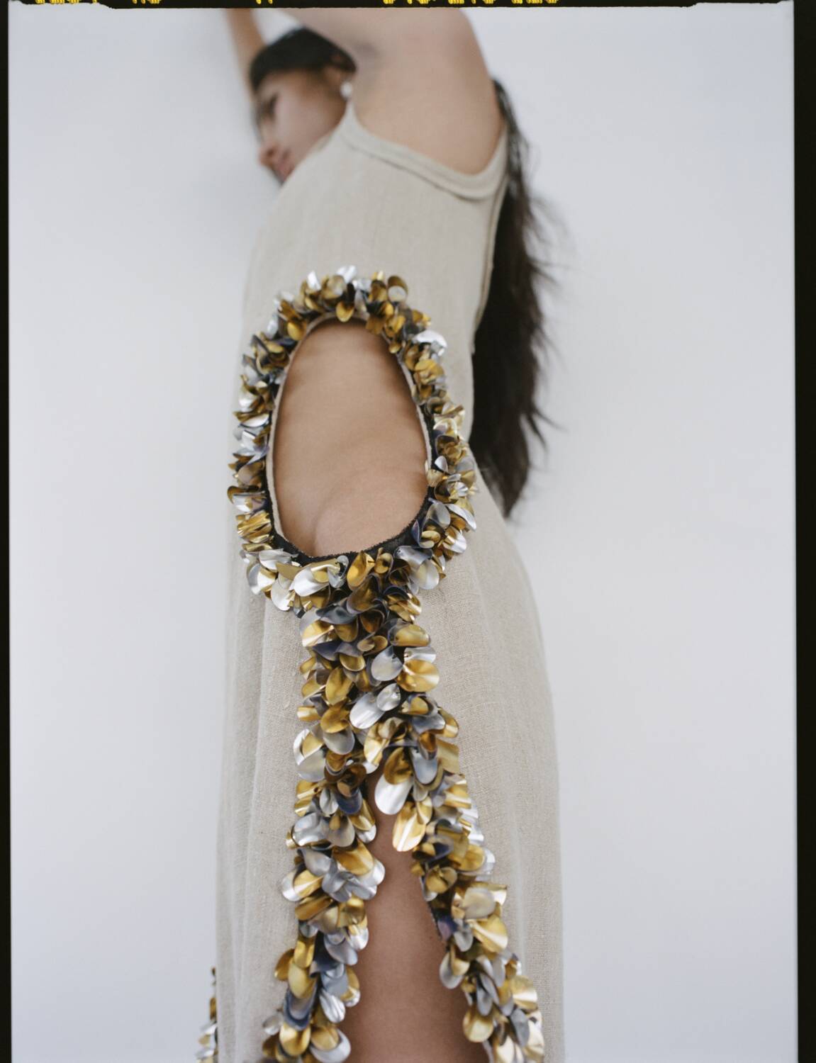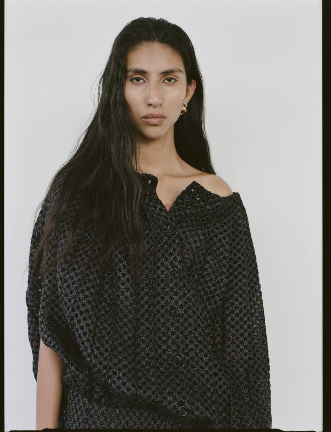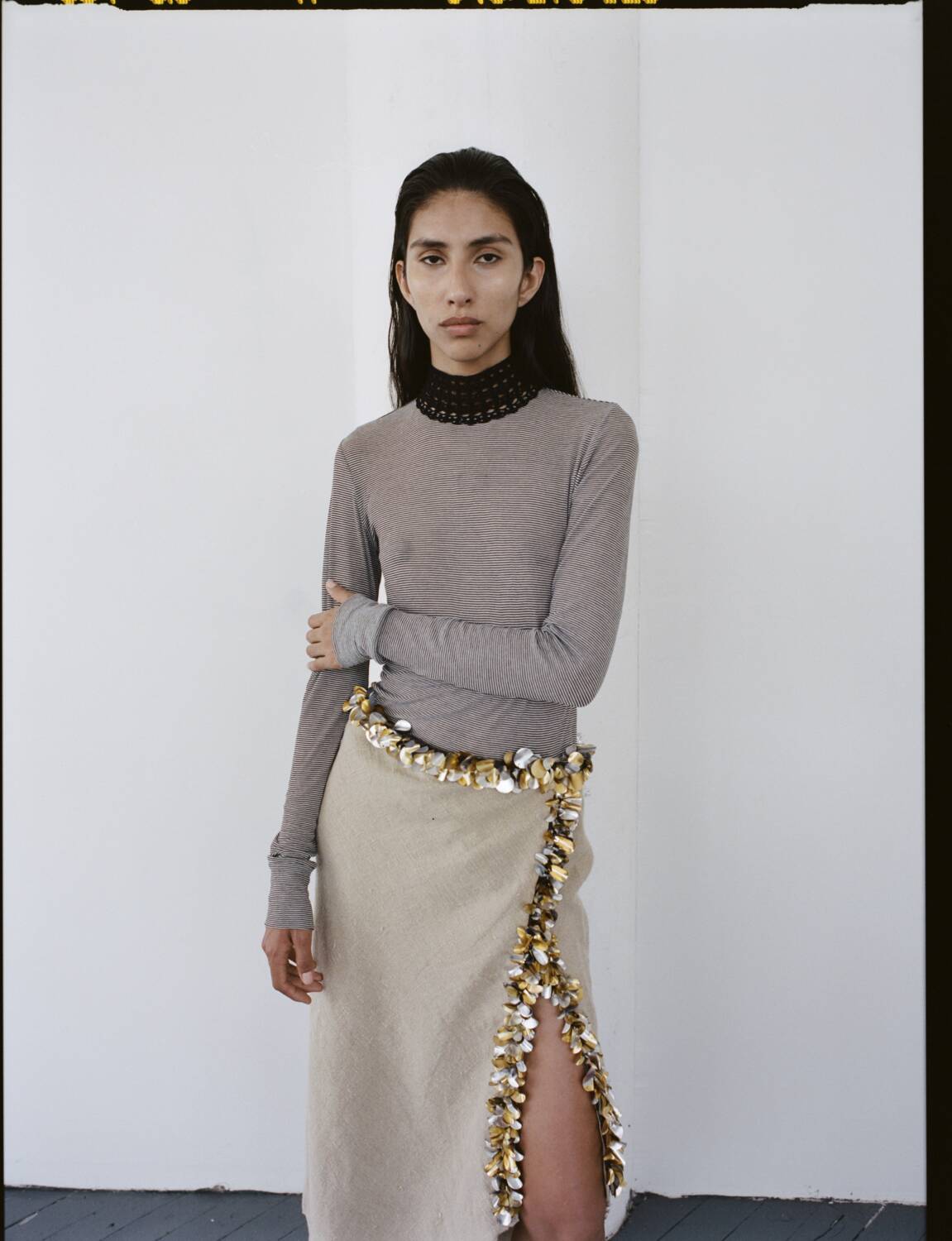 Knitwear and embellishments mirrored the fluidity of the Caribbean sea, with intarsia knit edited with a looped fringe to mimic the movement of sargassum algae, whilst melted paillettes were used to parallel oyster shells or barnacles cascading down the fabric.