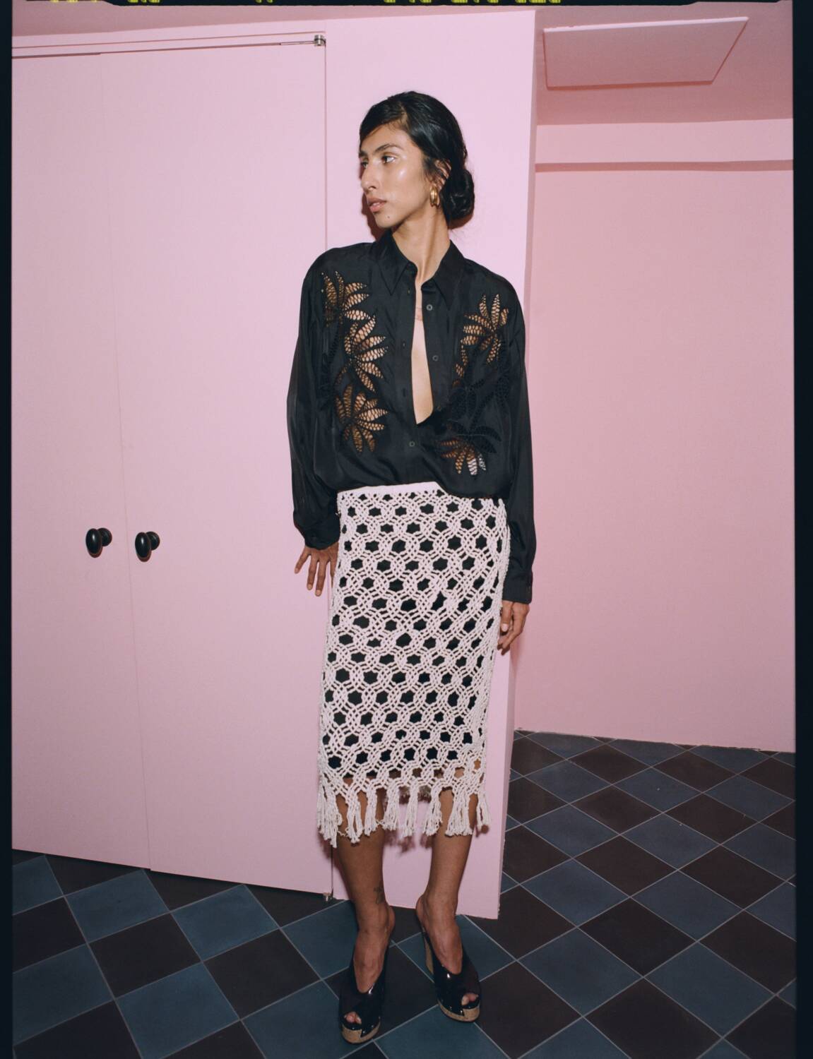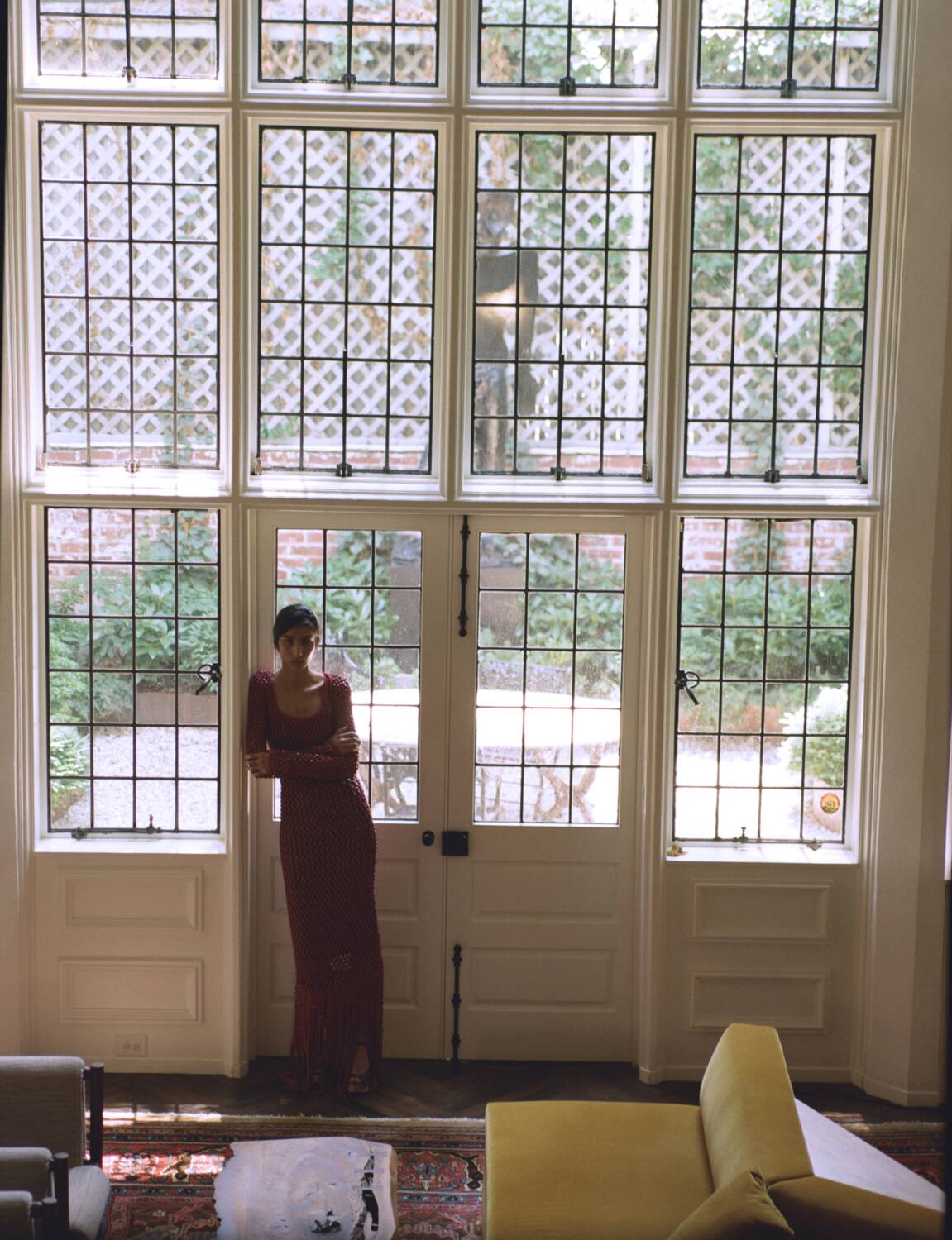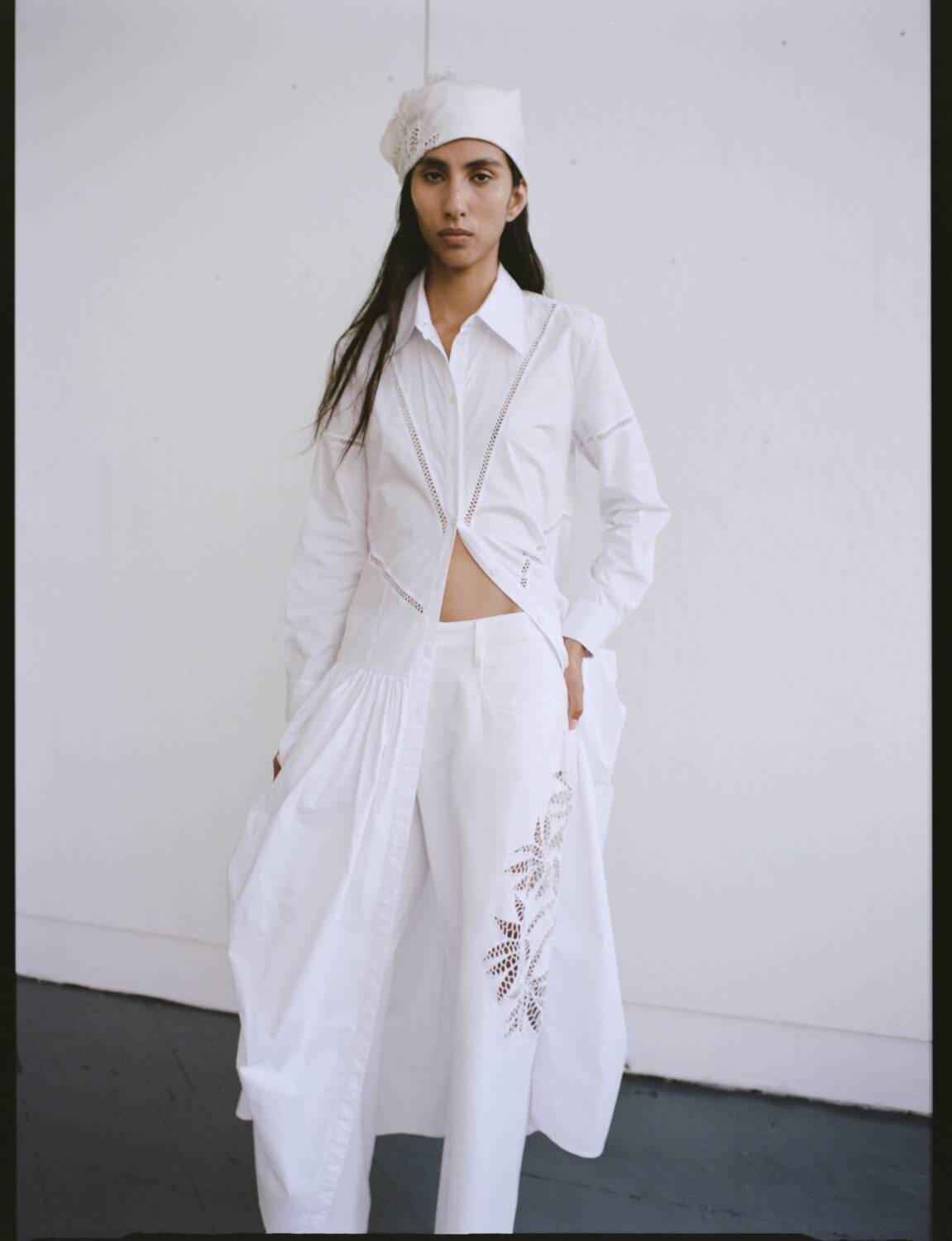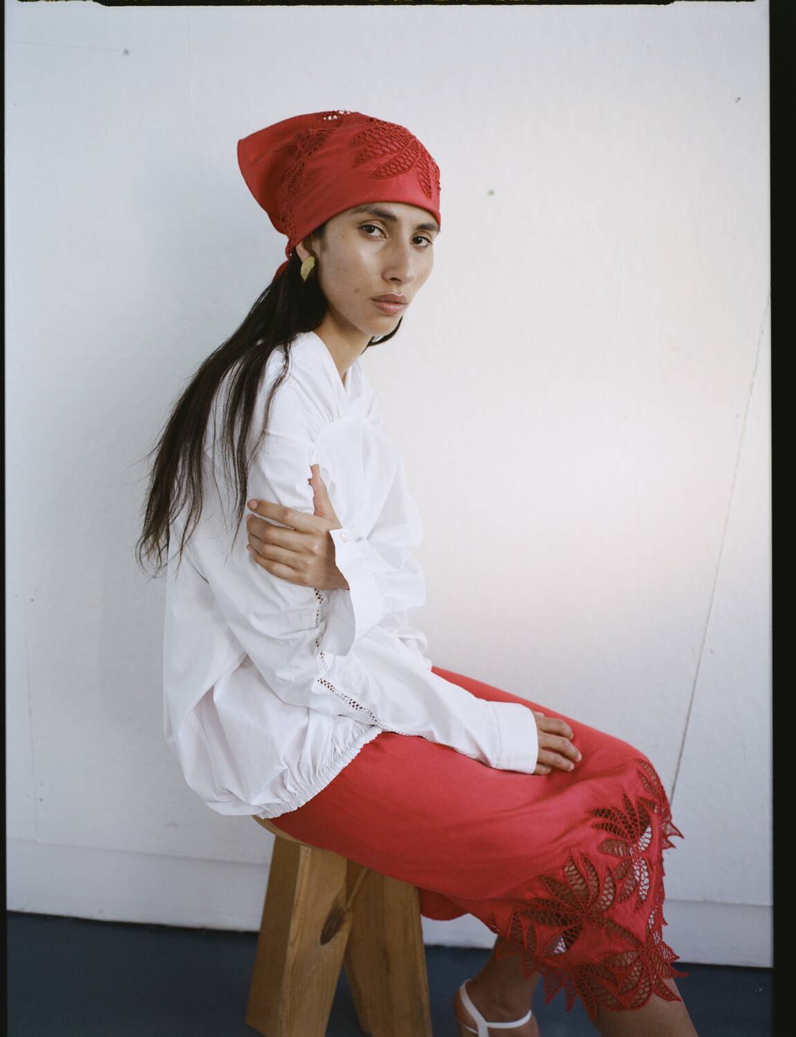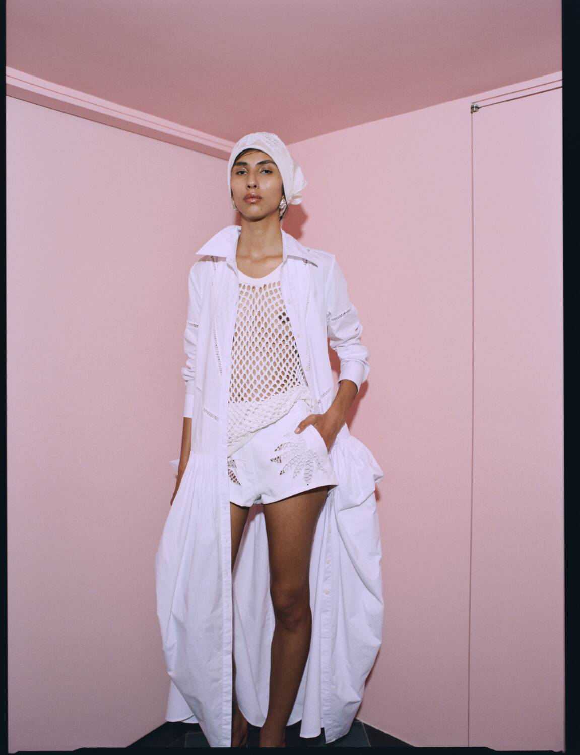 Symbolic elements nodding to sun-drenched summertime rituals that take place by the island’s rivers were abstracted across the garments. Broderie anglaise lace referenced the palm trees or weed leaves that dot the Caribbean’s natural landscape. Pieces that mirrored those worn in Jamaica’s undiscovered traditions were romanticised, expressed in blood-red crochet headscarves and opaque tights worn under white dresses.
